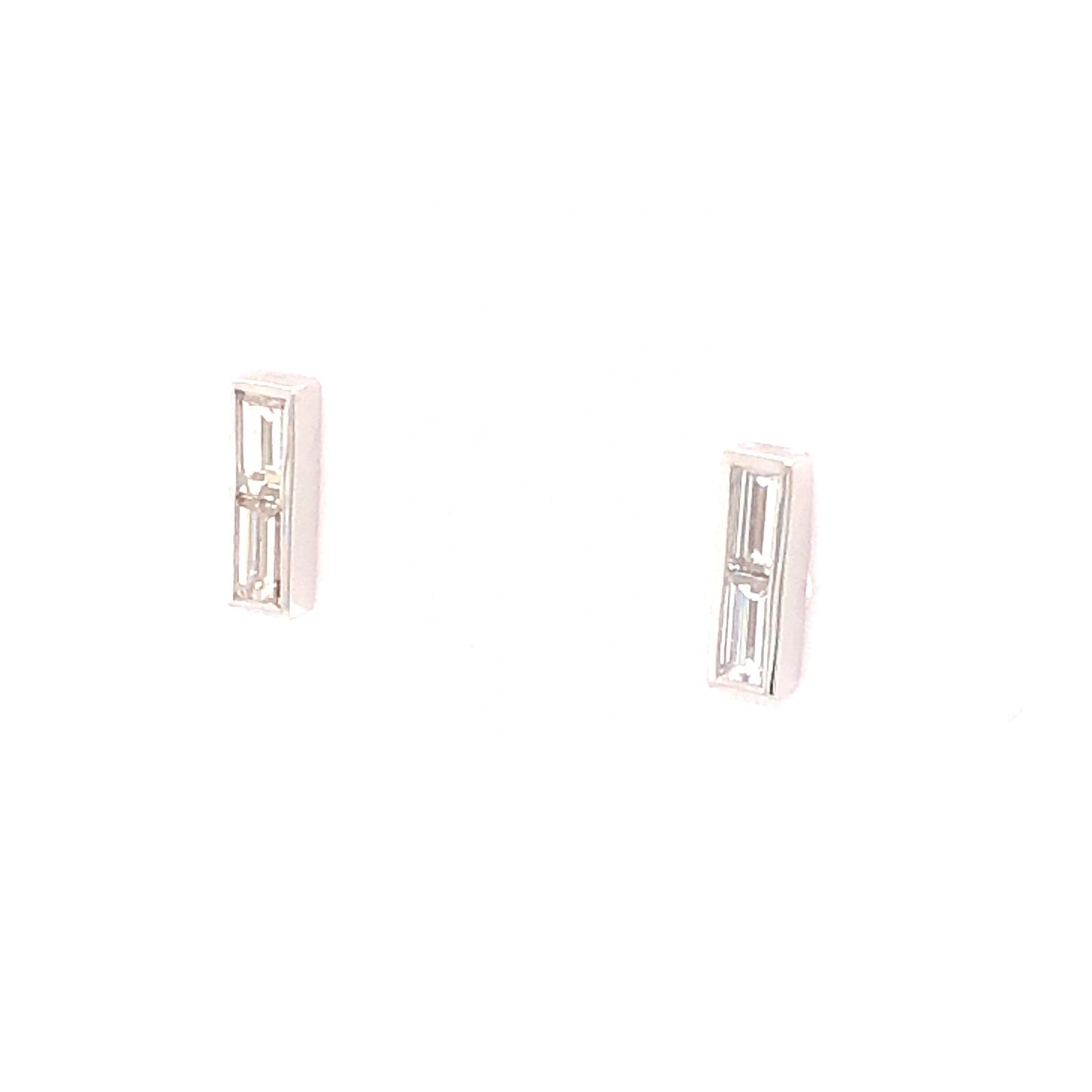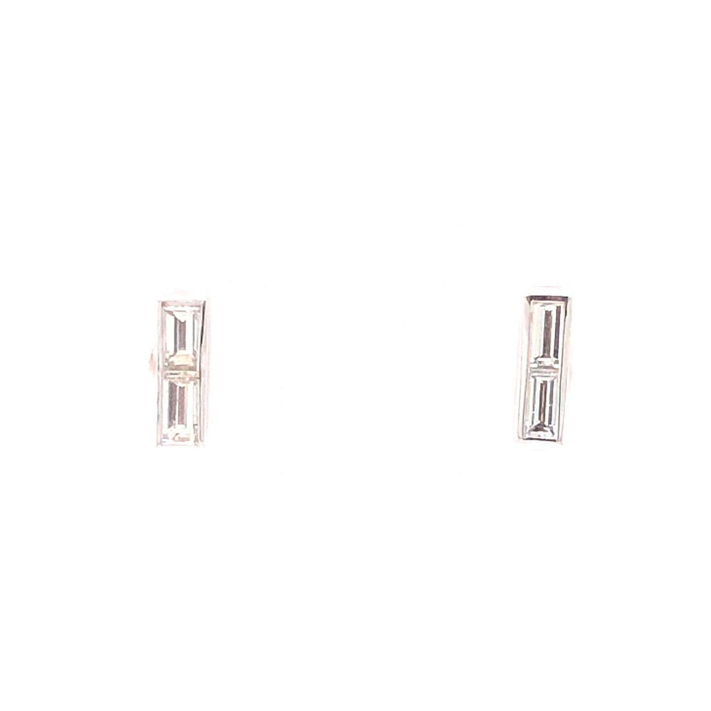 .32 Baguette Cut Diamond Stud Earrings 14K White Gold. These modern stud earrings feature .32 carats of baguette cut diamonds finished in 14 karat white gold. Four (4) .08 carat diamonds, each near colorless with rectangular facets, create the framework of these geometric diamond studs. Sleek and minimal, these sparkling stud earrings are fit for any occasion!