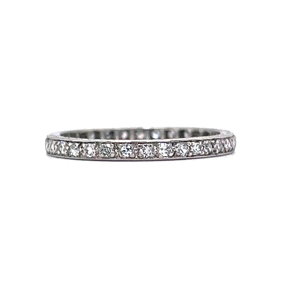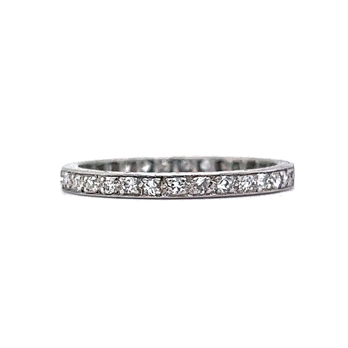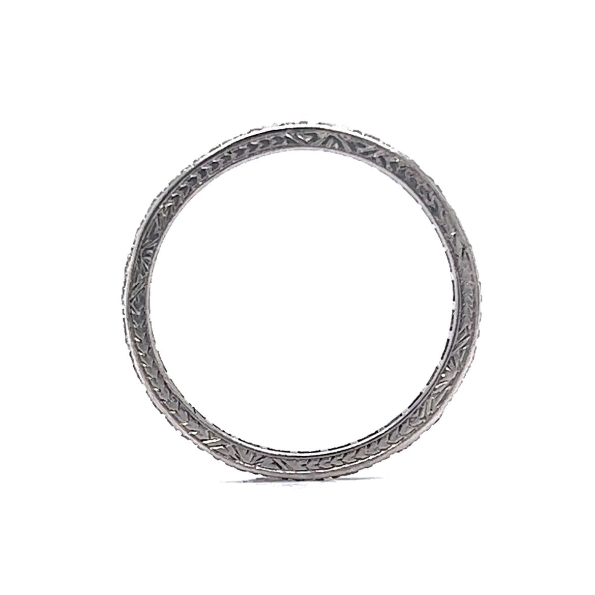 This Art Deco Era eternity wedding band is the perfect choice for someone looking for something unique and special. Its features single cut diamonds has .32 carats. The platinum band is engraved with a unique design that has stood the test of time. The diamonds are set in a channel which wraps around the entire band. Perfect match for a vintage engagement ring!