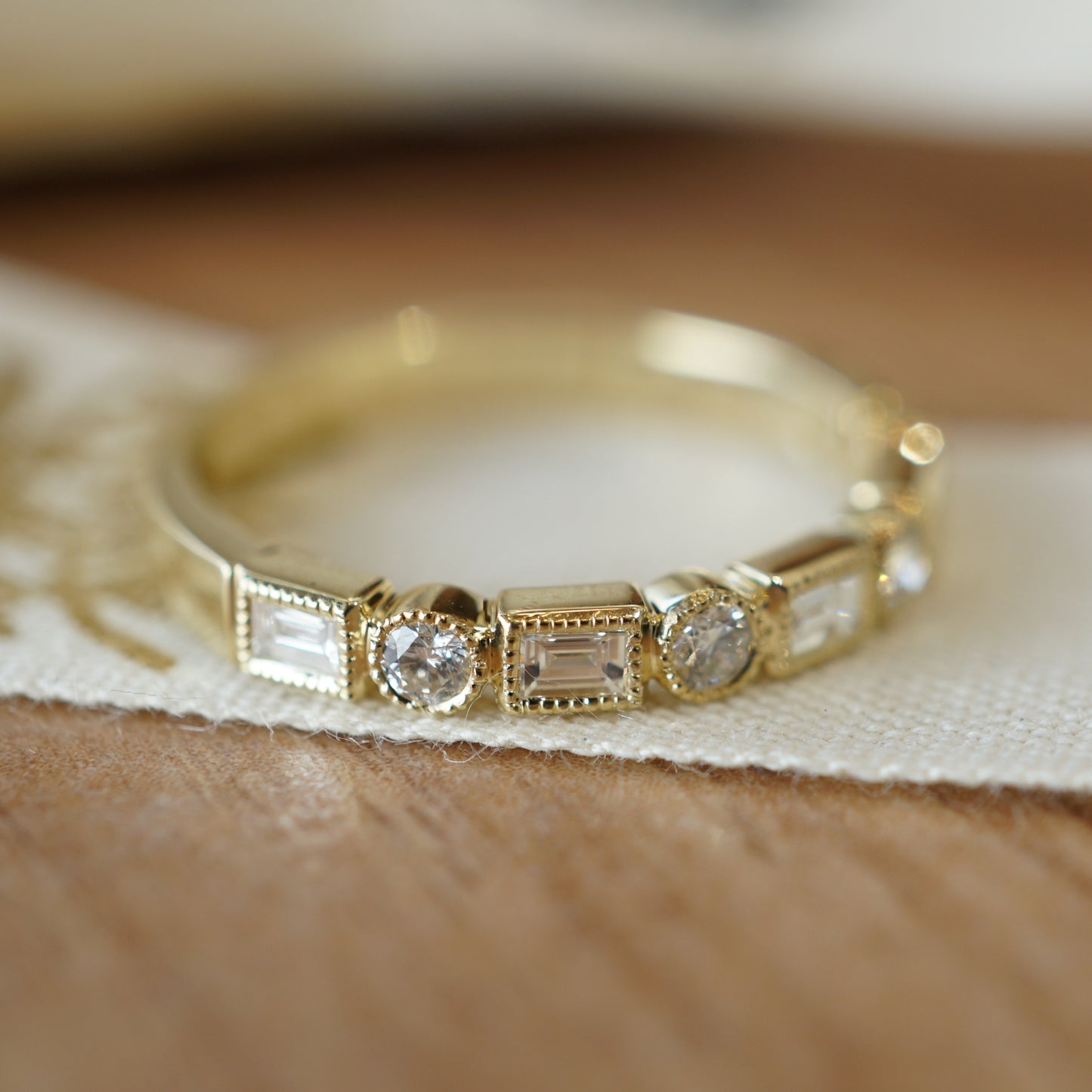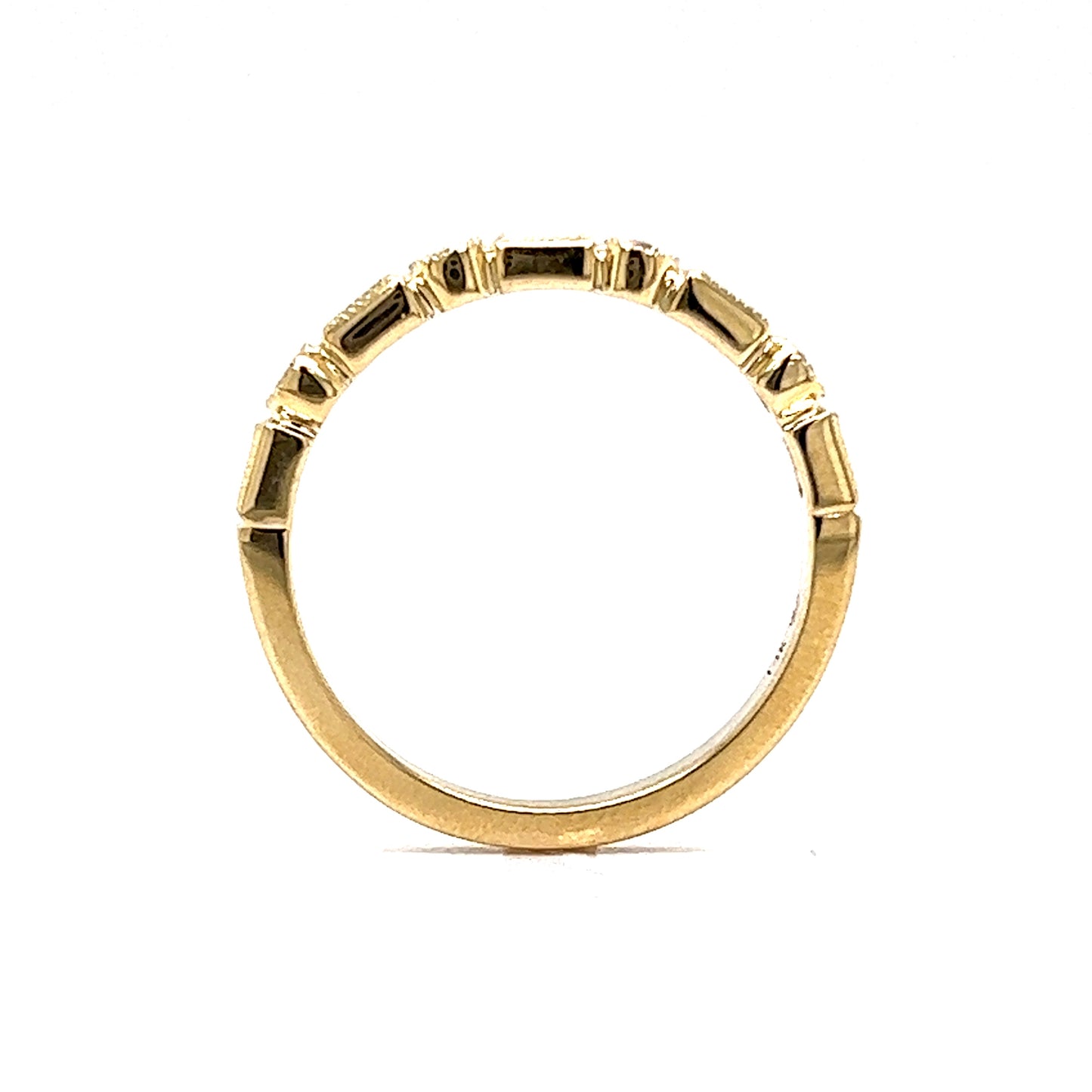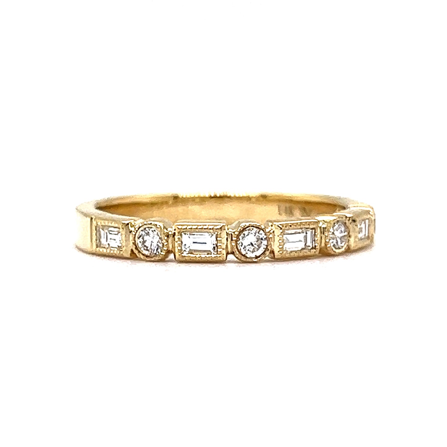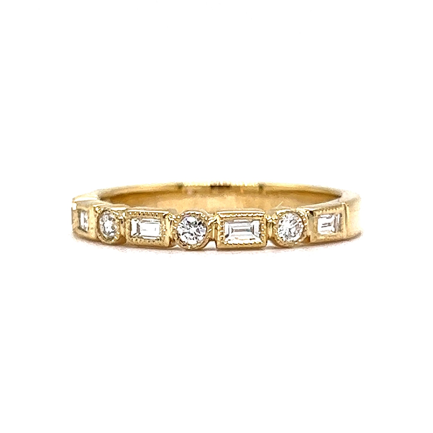 This structured wedding band features .33 carats of diamonds in 14 karat yellow gold. Five (5) .04 carat baguette diamonds and four (4) .0325 round cut diamonds decorate the front half of the ring. The bezel mountings feature detailed milgrain engravings. Stylish easy to stack. Finished on a polished 14k yellow gold band. This ring is sleek, modern, and would pair elegantly with any style of engagement ring!