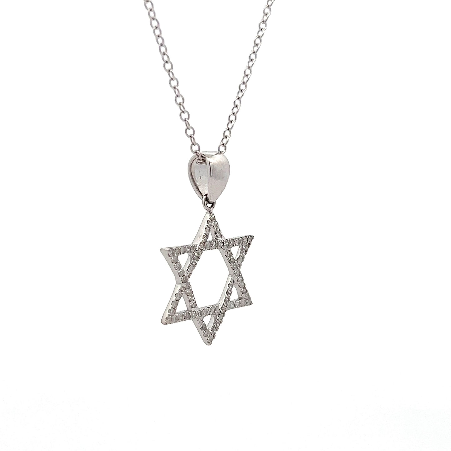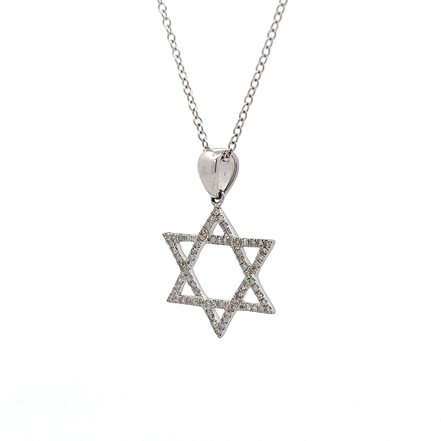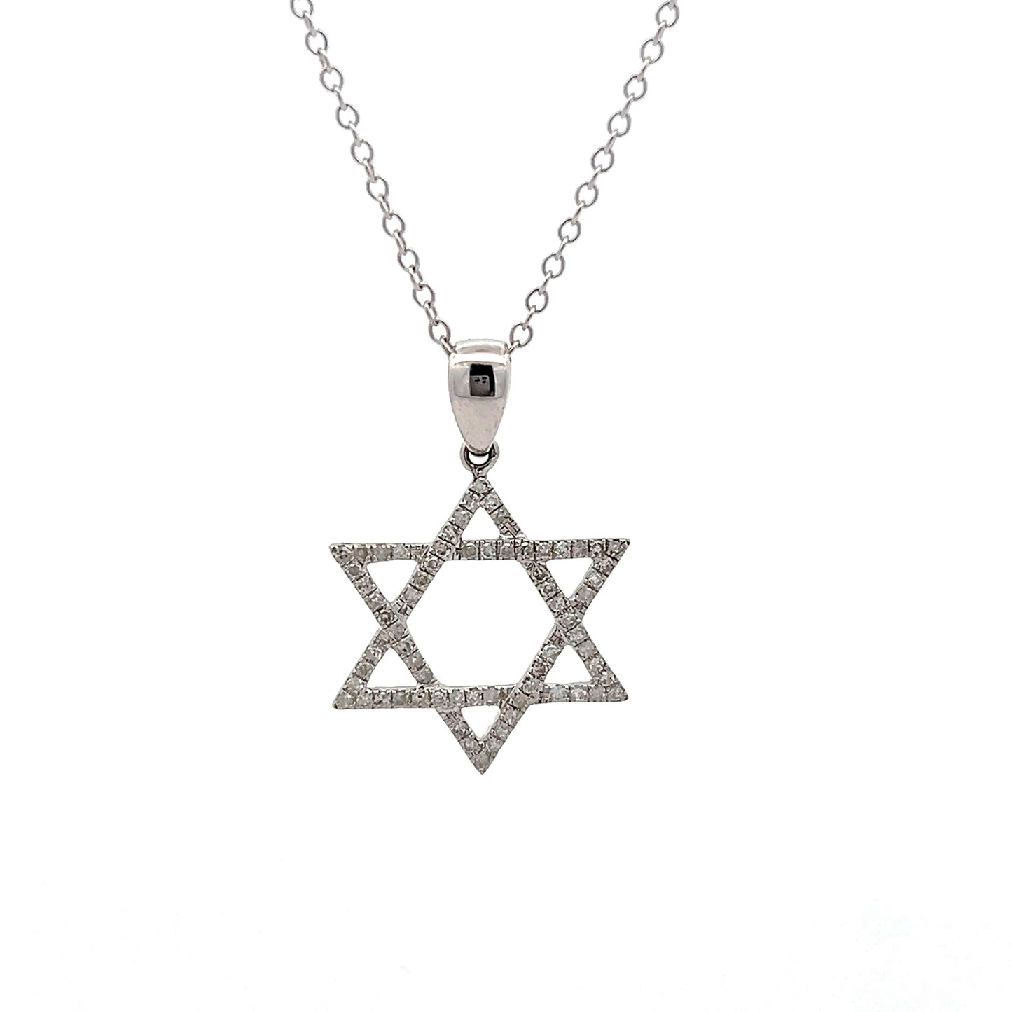 This Star of David pendant necklace features a polished 14 karat white gold setting. The pendant is adorned with .33 carats of single cut diamonds. Sixty-six (66) diamonds are meticulously set to enhance the pendant's overall brilliance. The necklace combines a meaningful design with the sparkle of diamonds, making it a versatile piece suitable for various occasions.