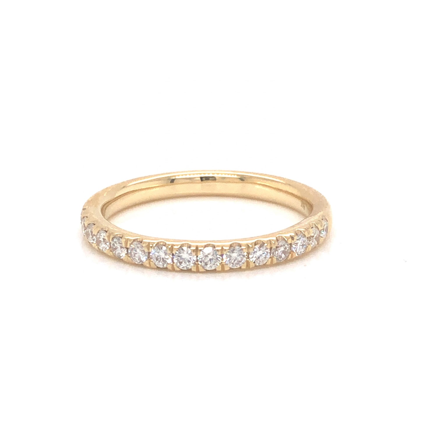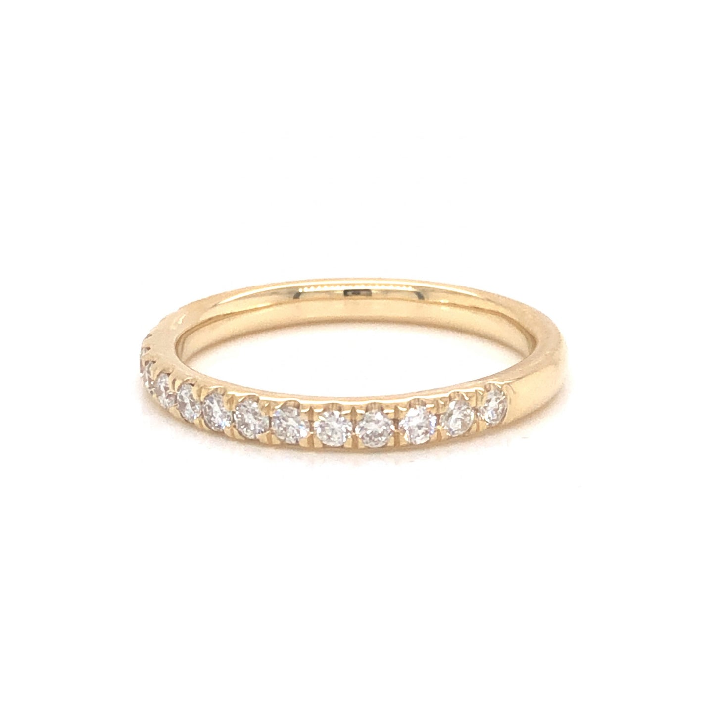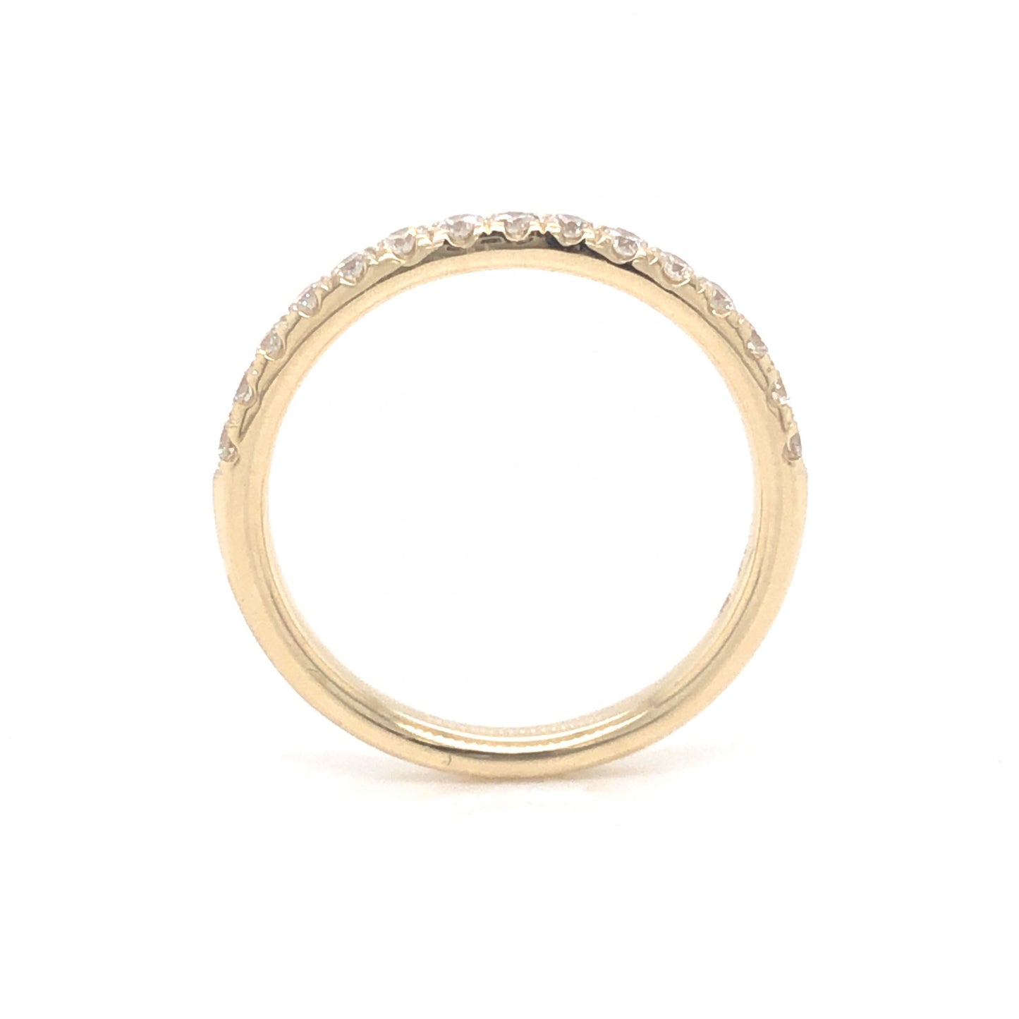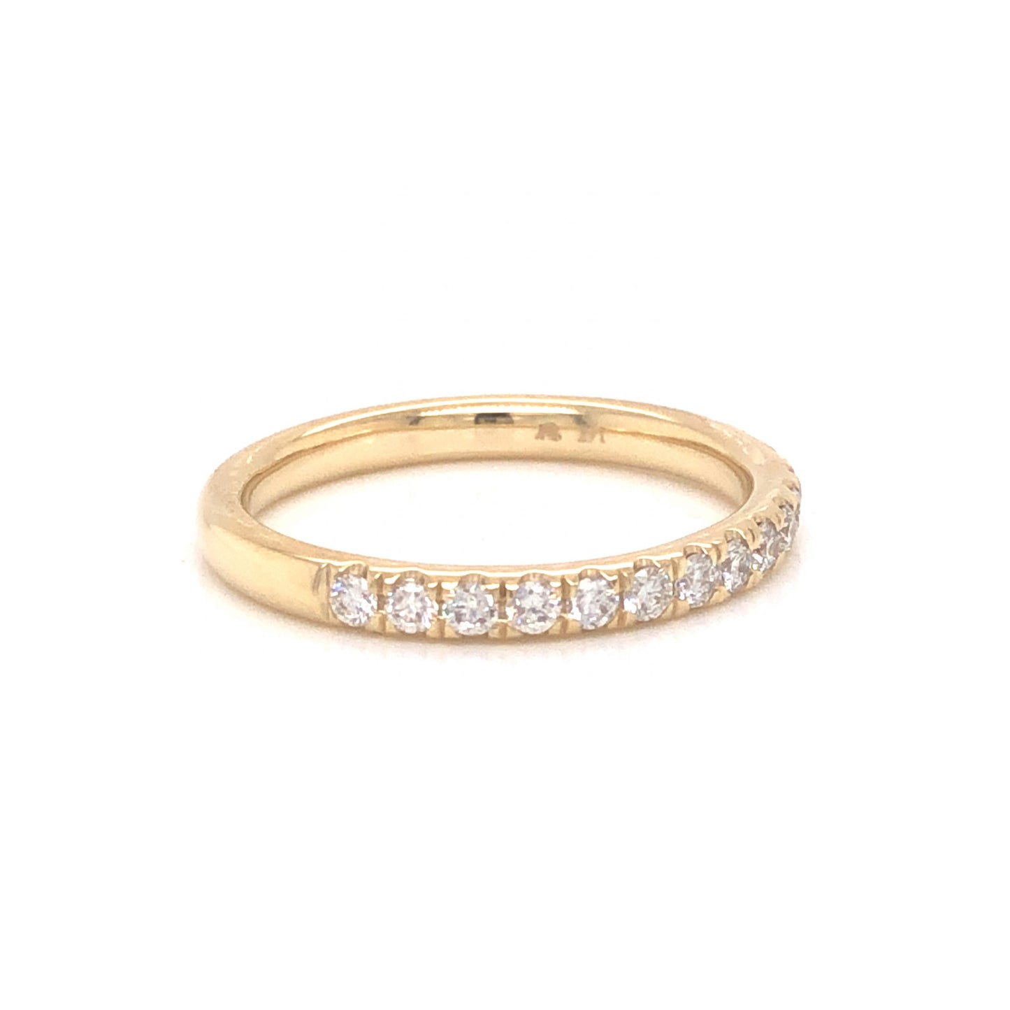 .33 Diamond Wedding Band in 14k Yellow Gold. This modern wedding band features .33 carats of Round Brilliant cut diamonds in vibrant 14k yellow gold. Eleven (15) .022 carat diamonds are set on the front half of the ring. The diamonds are near colorless and brilliant, finished on a high polished 14k yellow gold band. The band itself measures 2.32mm wide and would work well with most engagement rings.