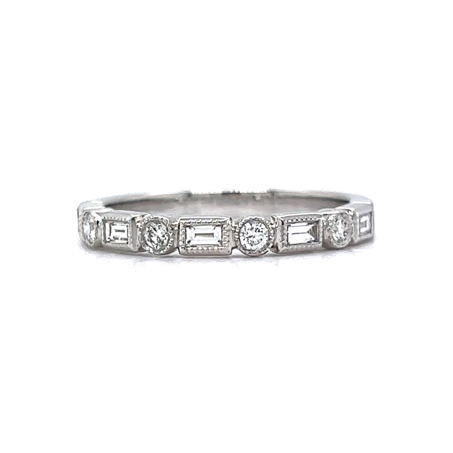 This half-eternity wedding band features .33 carats of baguette and round cut diamonds in shimmering 14 karat white gold. Five (5) .04 carat baguette diamonds and four (4) .0325 carat round cut diamonds decorate the front half of the ring. Delicate milgrain engravings in a unique geometric pattern. Full of sparkle and shimmer. A stylish wedding band to elevate your engagement ring stack!