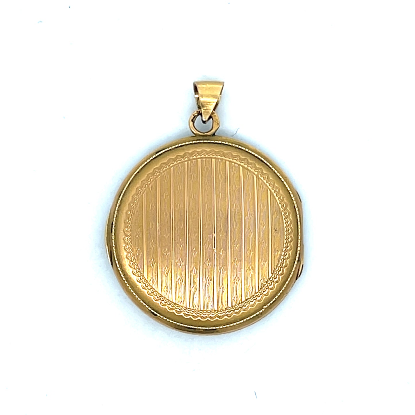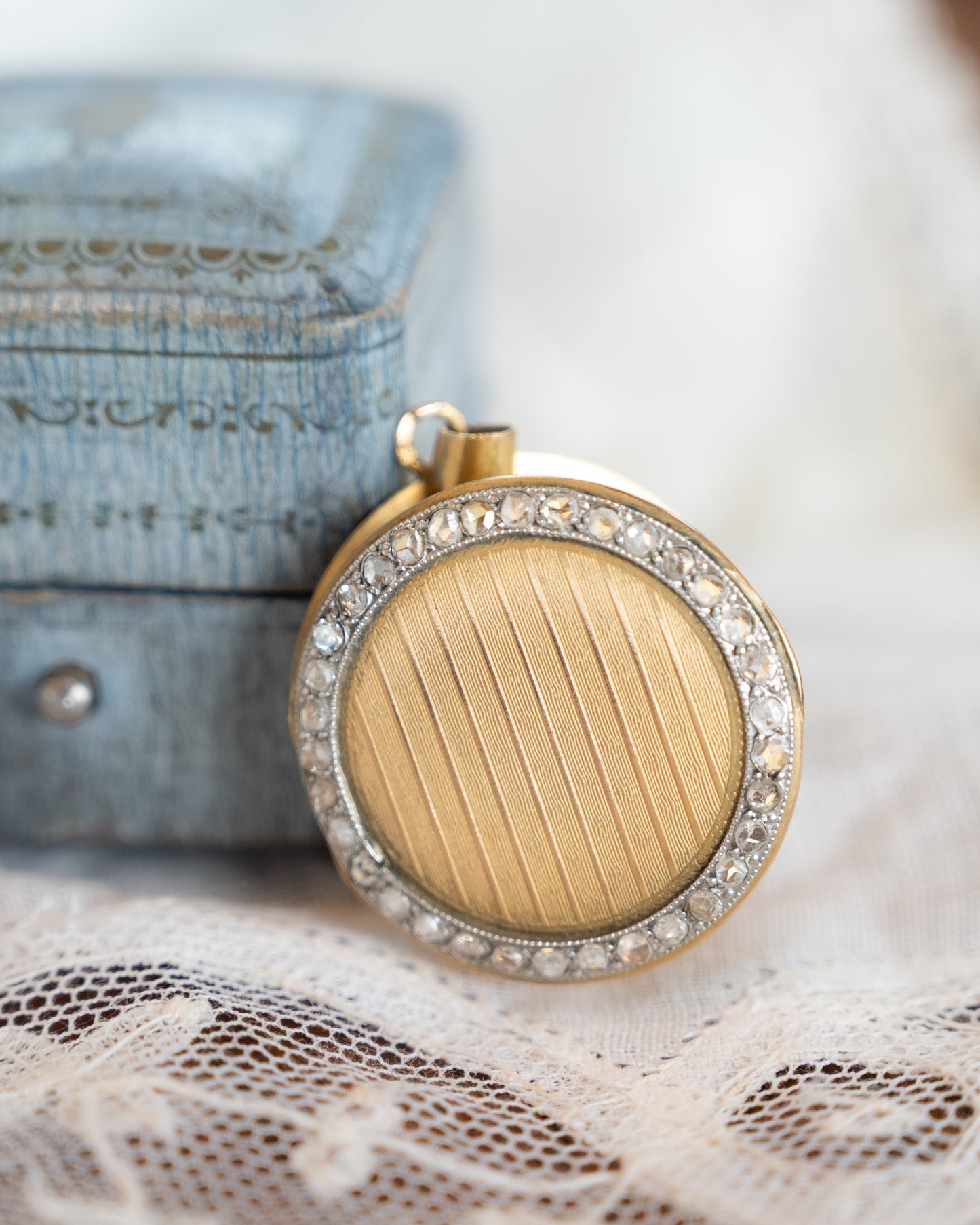 This Victorian-era locket pendant necklace features a .34 carat antique rose cut diamond with H,I color and I1 clarity set in 18 karat yellow gold. The diamonds form a halo around the outer edge that catch light from different angles. The locket design combines round shapes with engraved stripe patterns that add texture and visual interest to the piece. This piece balances Victorian styling with wearability for today, making it appropriate for both special occasions and everyday use.