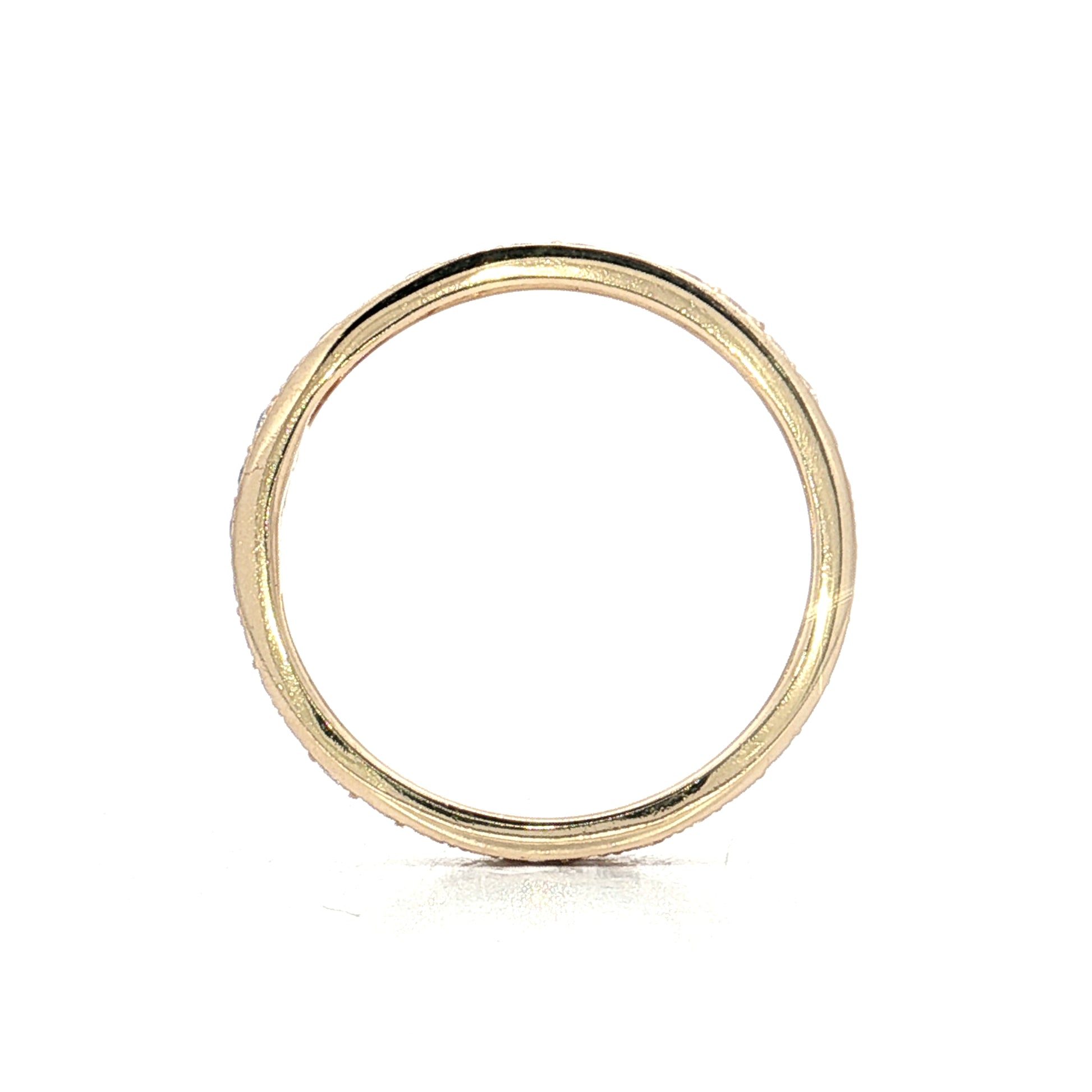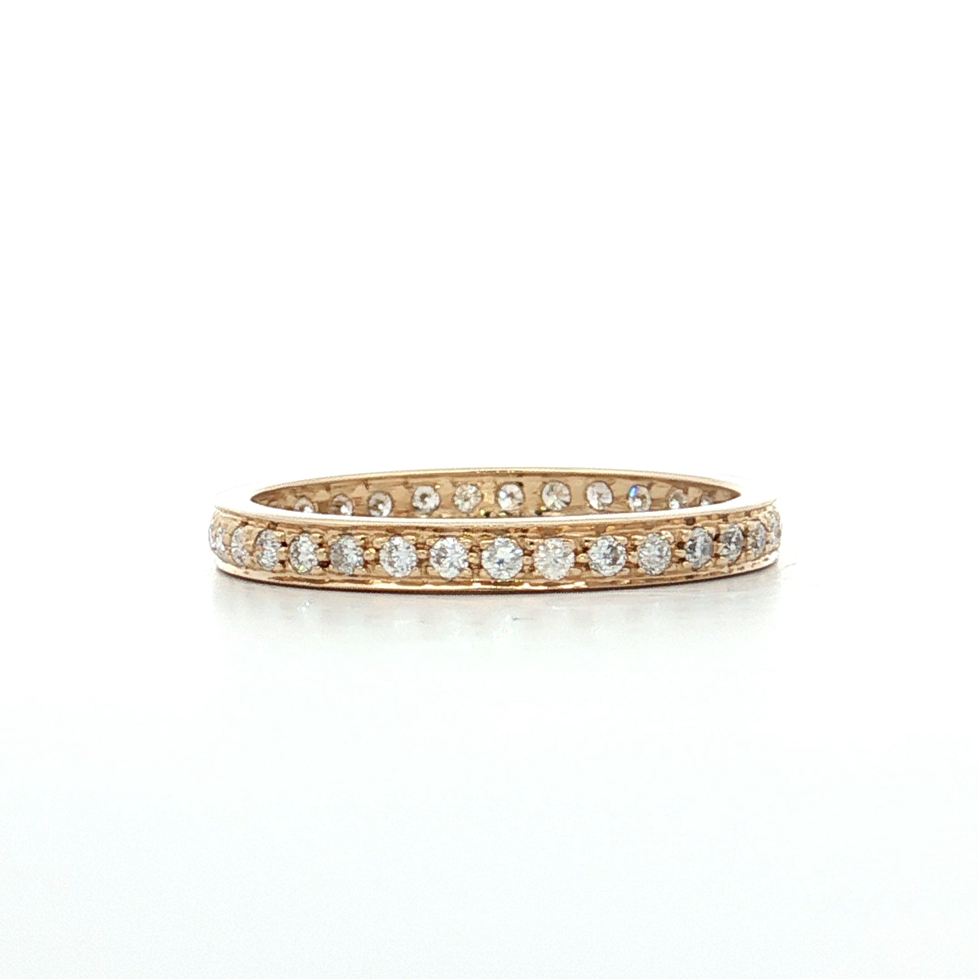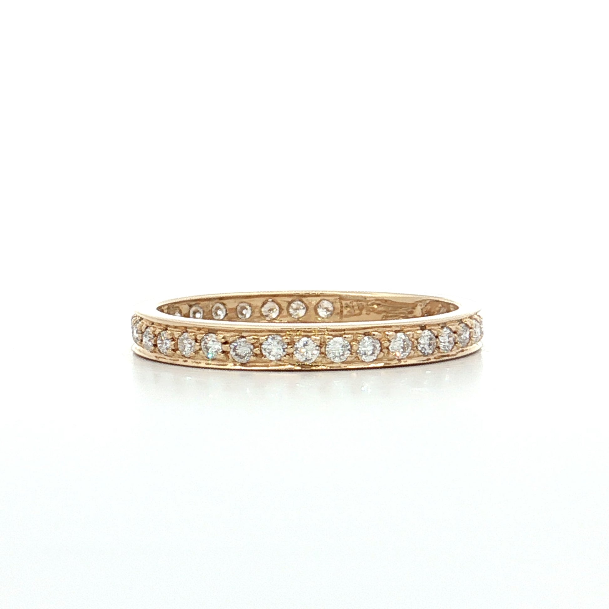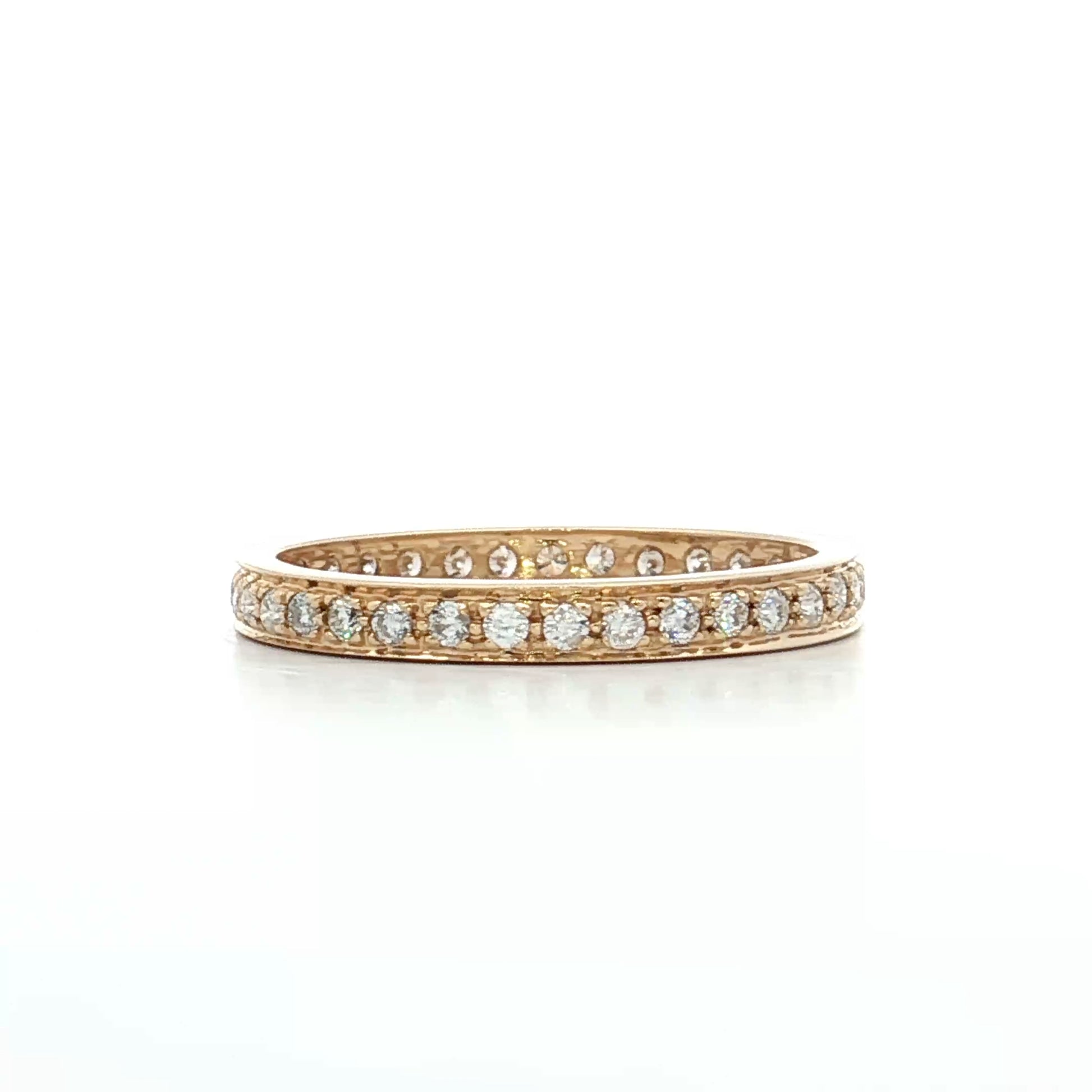 The round brilliant cut maximizes sparkle through 58 precisely angled facets that create fire and brilliance. A combination of channel and prong settings secures the diamonds, with some stones held by metal prongs while others sit within a metal channel for varied texture along the band. The 2.5mm width keeps the ring delicate enough for comfortable daily wear while still providing noticeable sparkle.