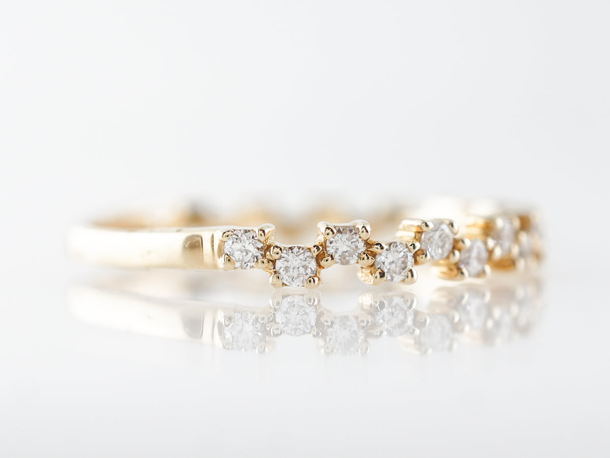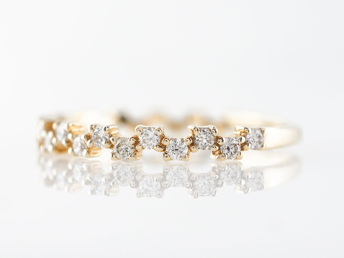 .34 Carat Alternating Diamond Ring in 14k Yellow Gold. This modern diamond wedding band has a pattern of alternating settings to give it depth and a much larger diamond presence than its weight would imply. The band features .34 carats of round brilliant cut diamonds set across the face. Finished in 14k yellow gold, this very thin band is a unique look to pair with an engagement ring!