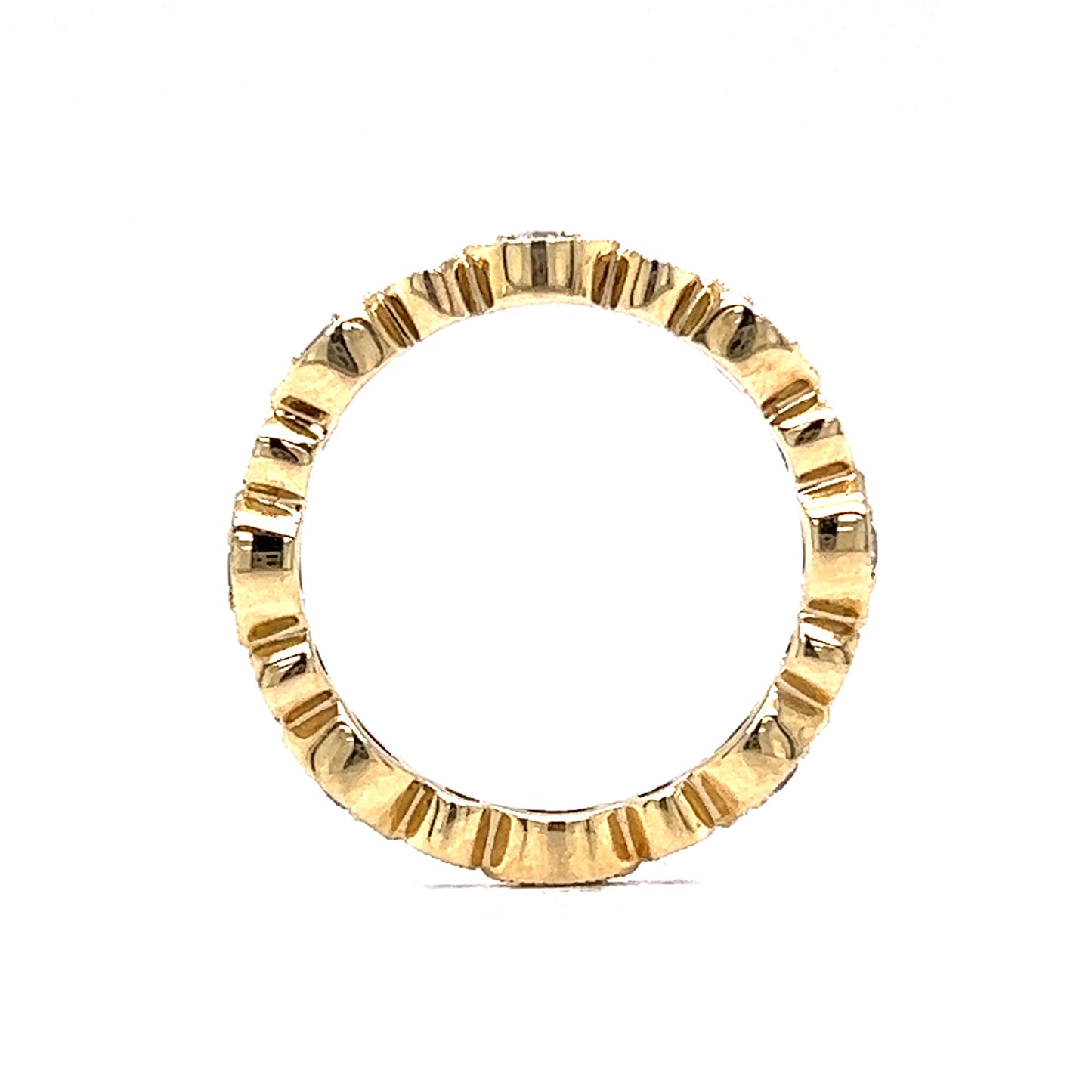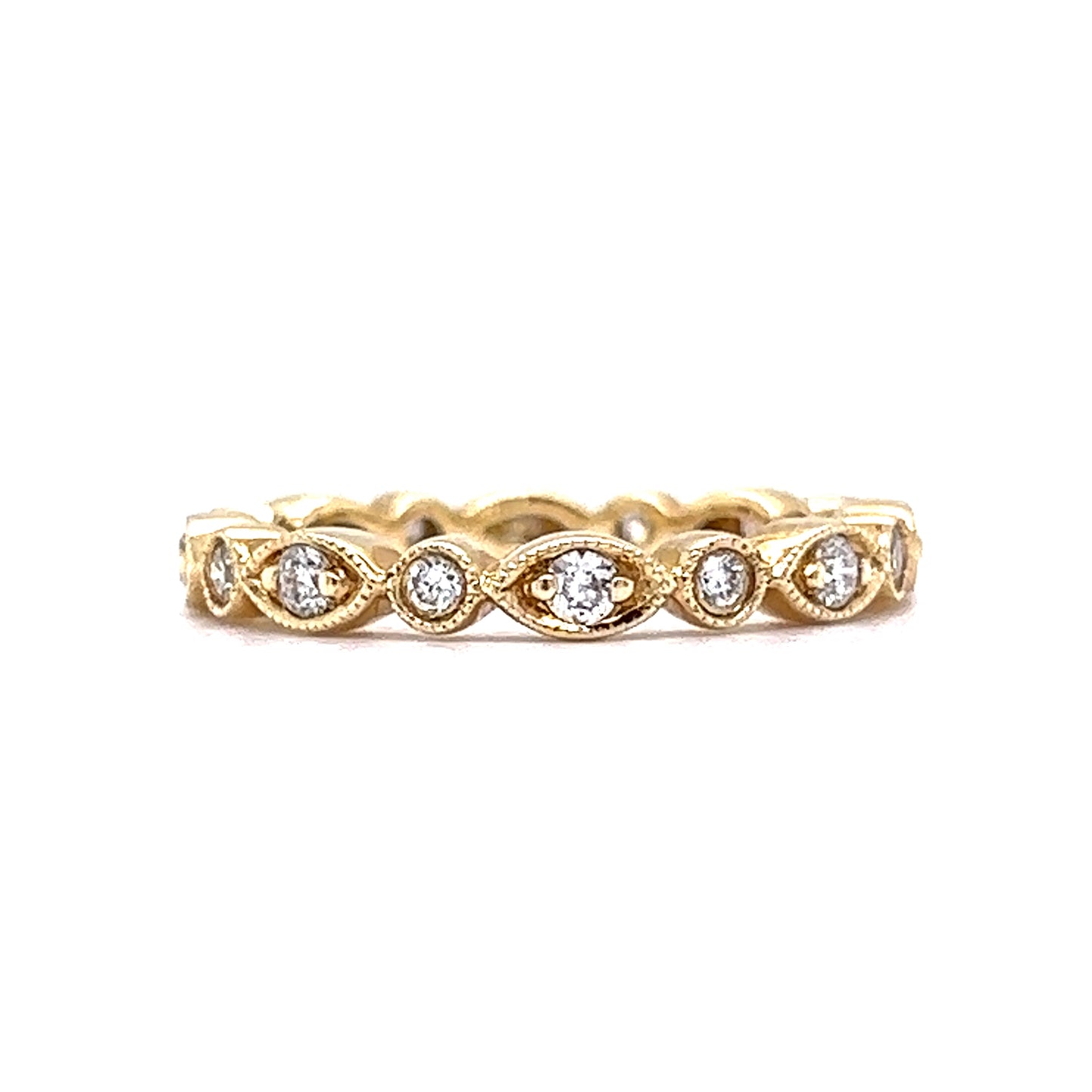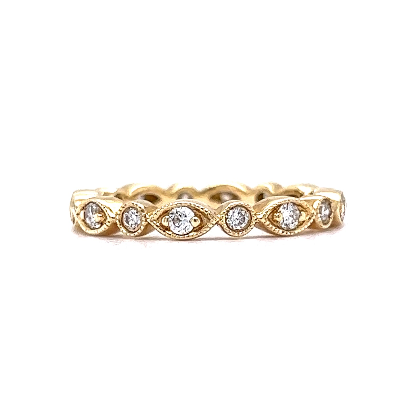 .34 Carat Diamond Eternity Band in 14k Yellow Gold.  This fine modern eternity band features .34 carats of round brilliant cut diamonds set in 14 karat yellow gold. The diamonds are set in a repeating pattern of marquise shaped stations and round stations with milgrained borders. This could be a great addition to a right hand stack as it so bright and lively.