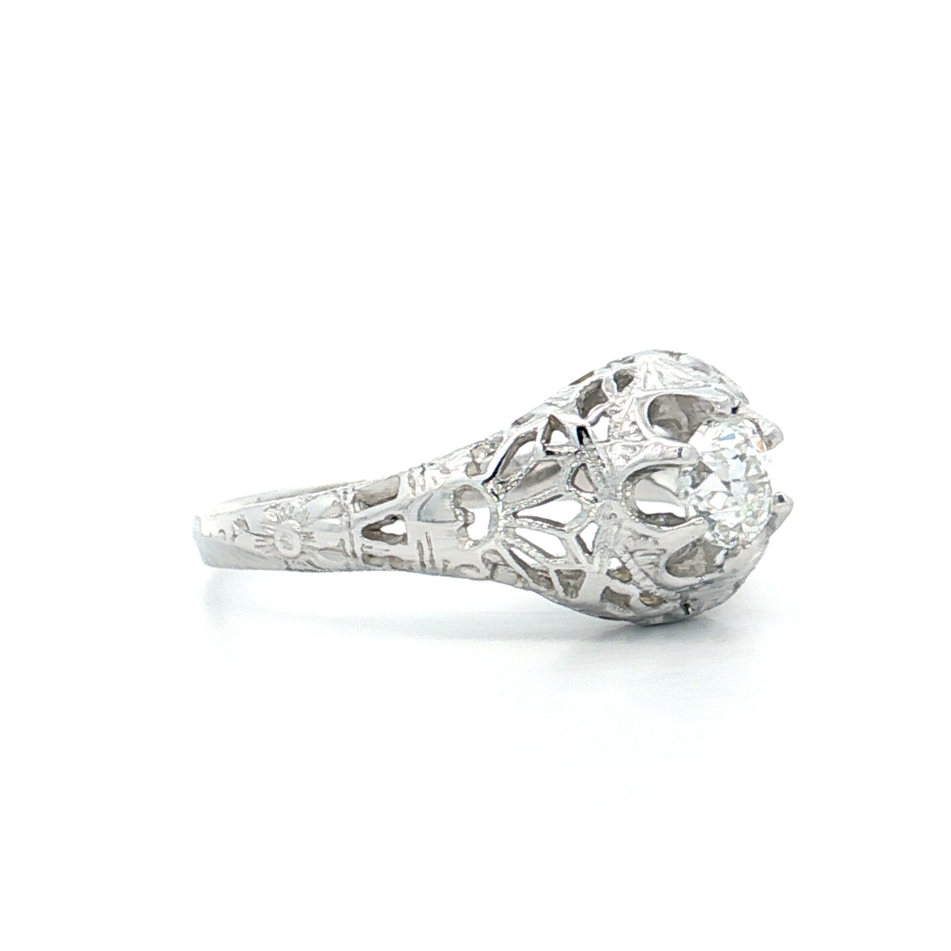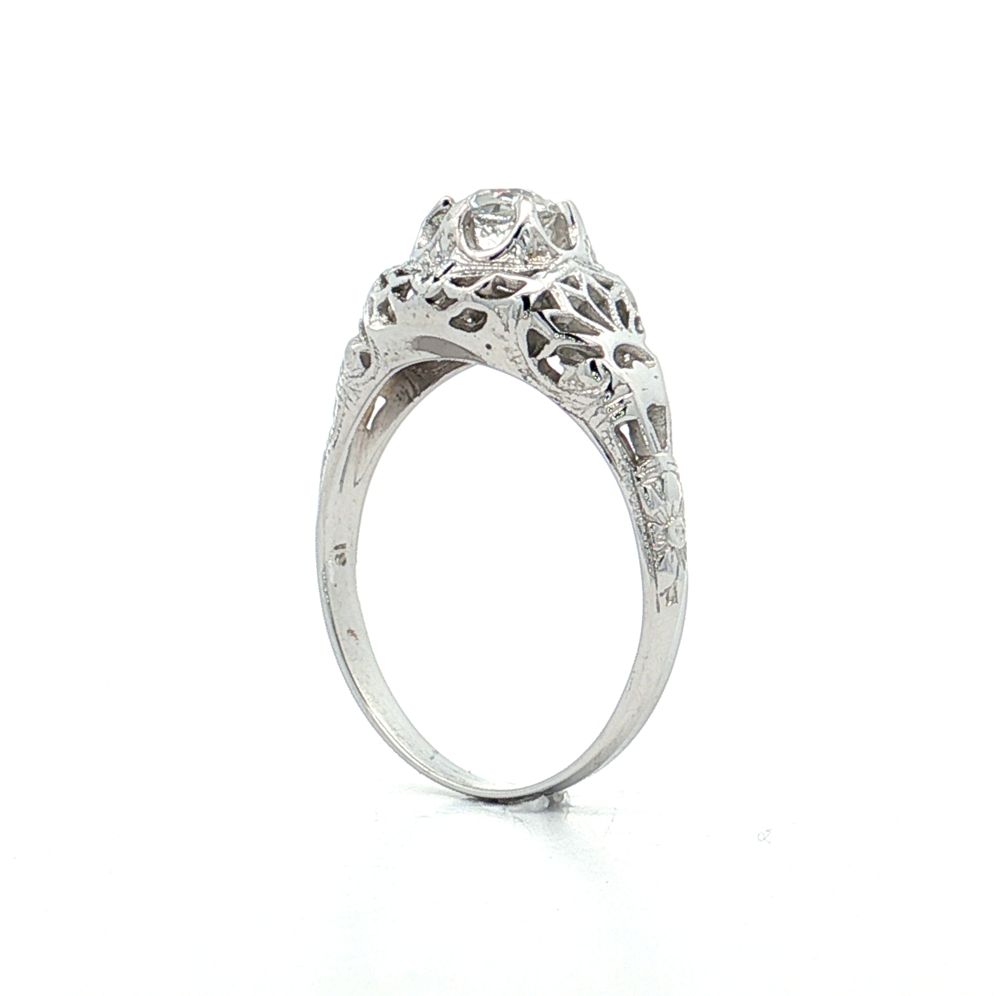 This Art Deco era solitaire engagement ring features a .35 carat old mine cut diamond with SI1 clarity and I color, set in prongs made from 18 karat white gold. The square-shaped diamond with rounded corners creates distinctive light reflection patterns typical of old mine cuts. The intricate filigree mounting displays milgrain detailing along the band edges, characteristic of Art Deco craftsmanship from the 1920s and 1930s. The ornate white gold setting provides depth and texture that highlights both the diamond and the period-specific metalwork.