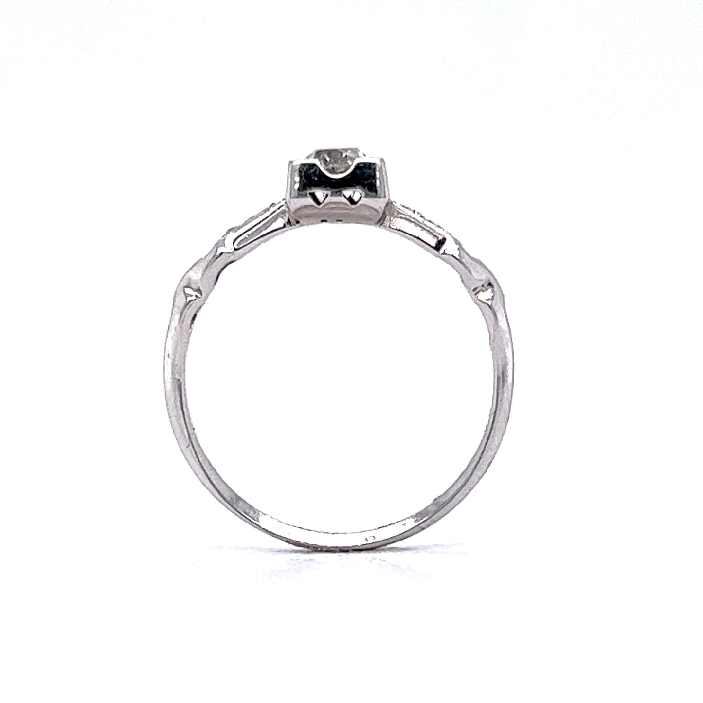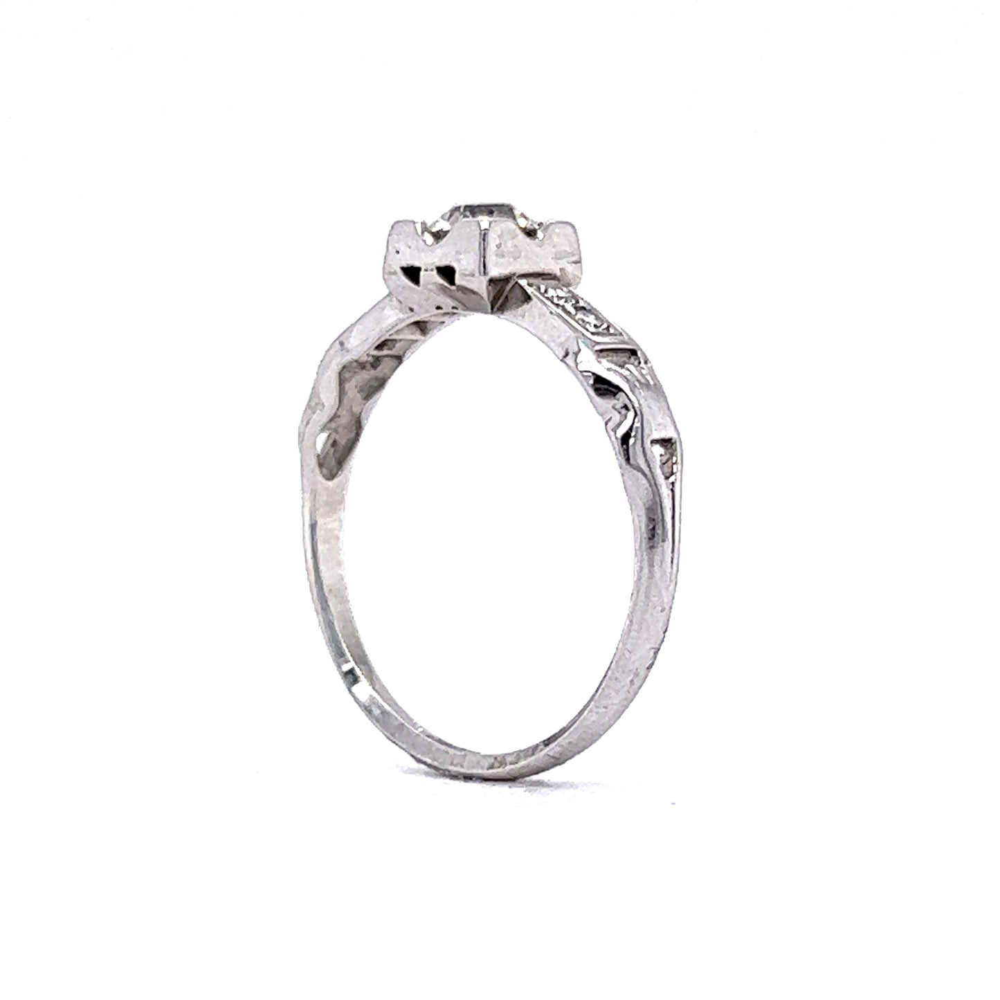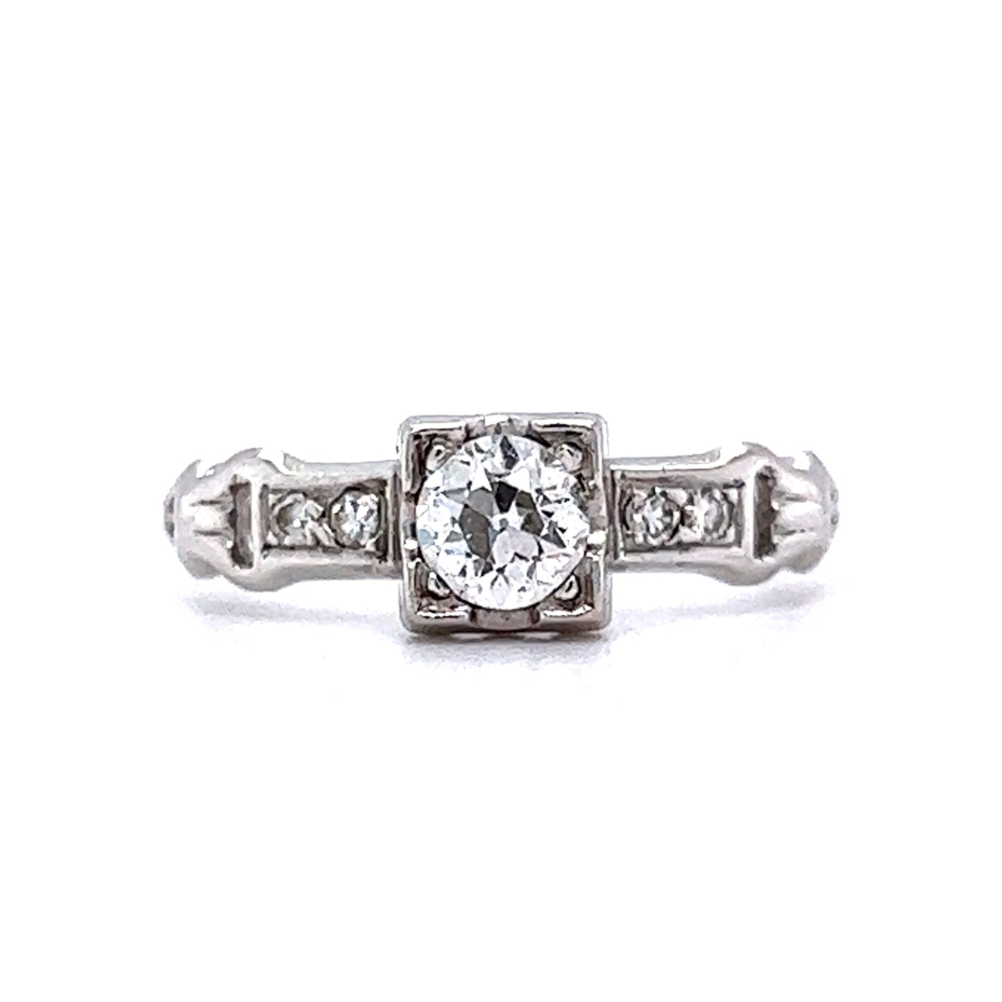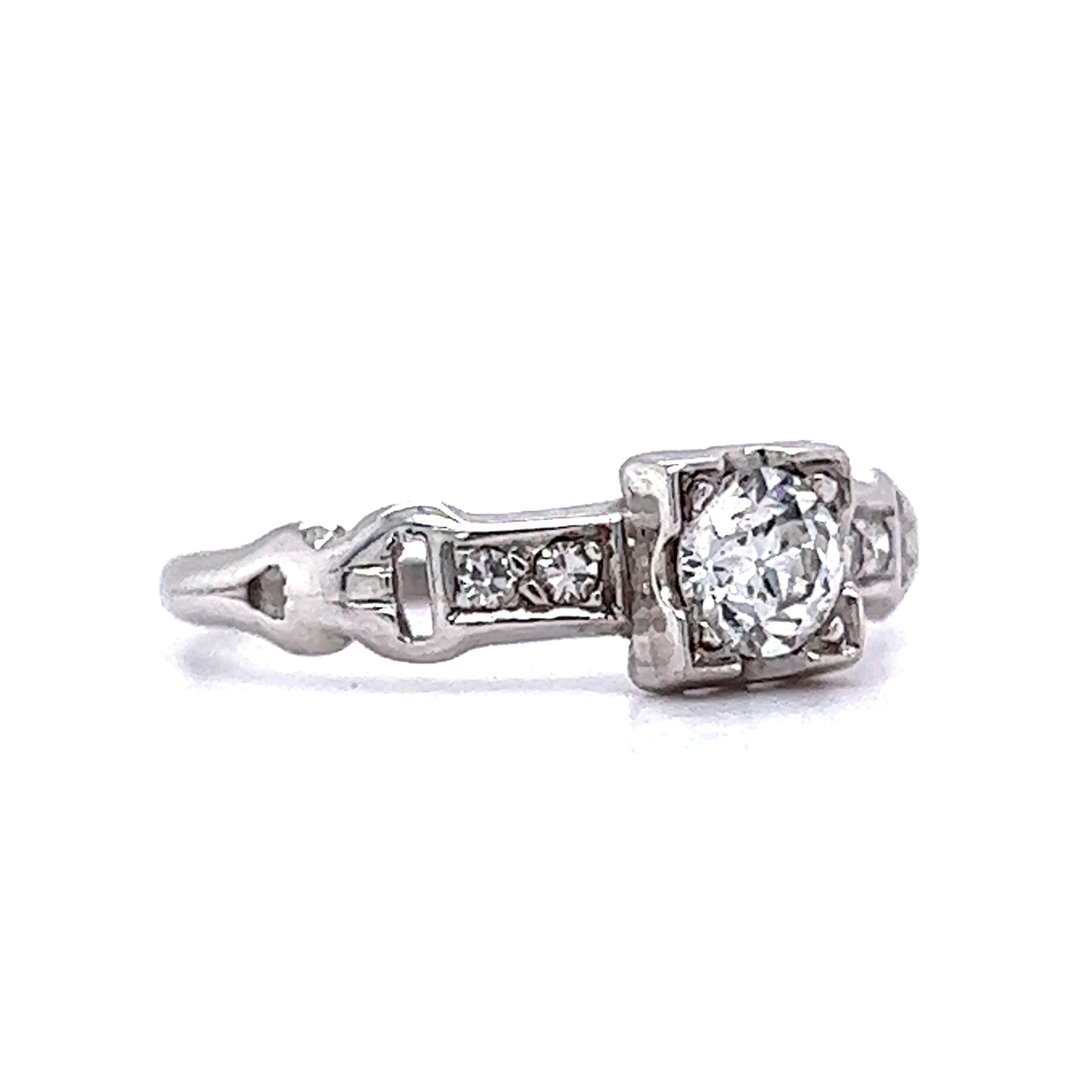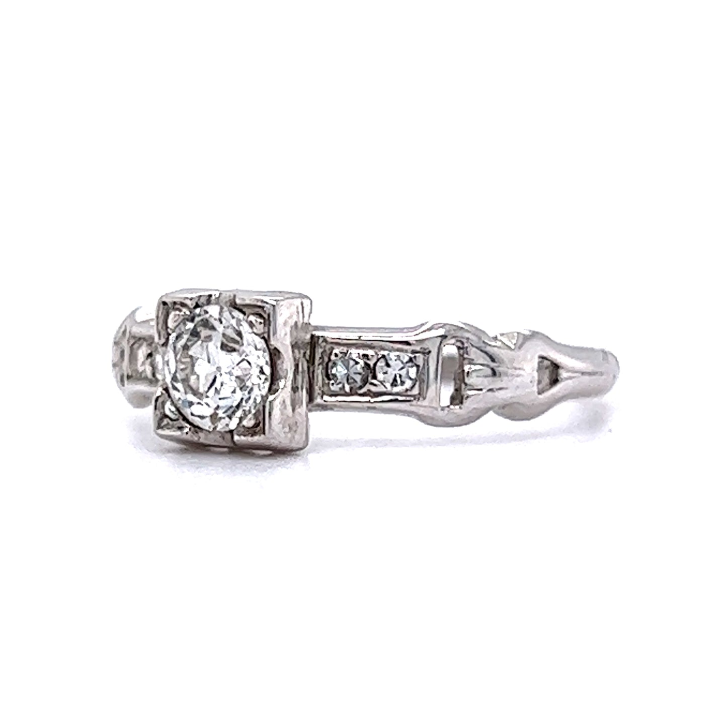 .35 Art Deco Engagement Ring in 18k White Gold. This Art Deco engagement ring is composed of a .35ct Old European cut diamond with single cut accent diamonds in an interesting 18k white gold band. Forming a unique, “buckle” shape, with a square setting and two strap-like shoulders, this one-of-a-kind vintage ring is one of our new favorites. When looking at the profile, the embellishments in the white gold band are boxy and architectural, very characteristic of Art Deco era jewelry designs. A special engagement ring for your bride-to-be!