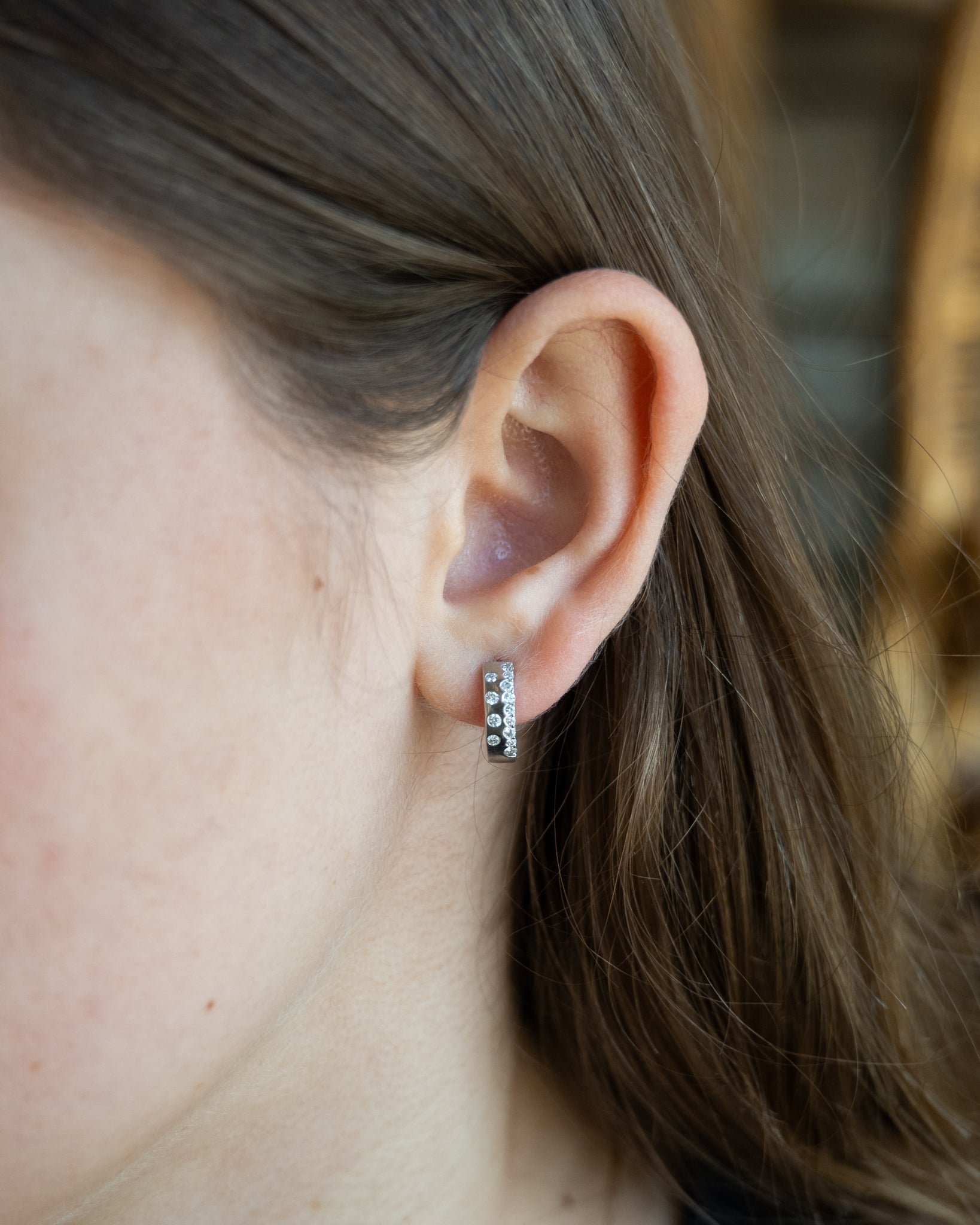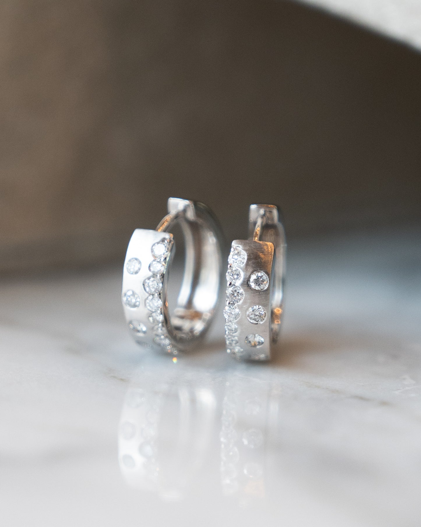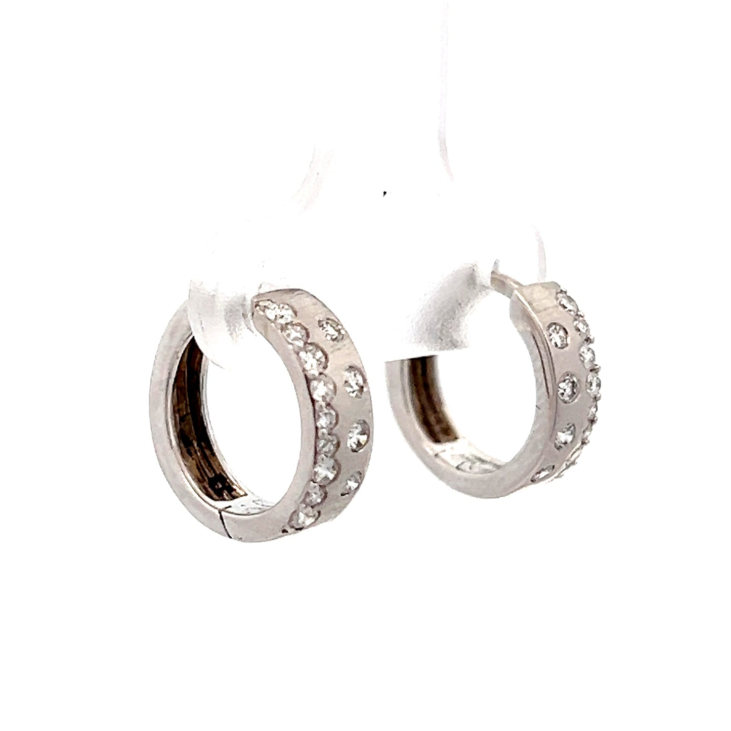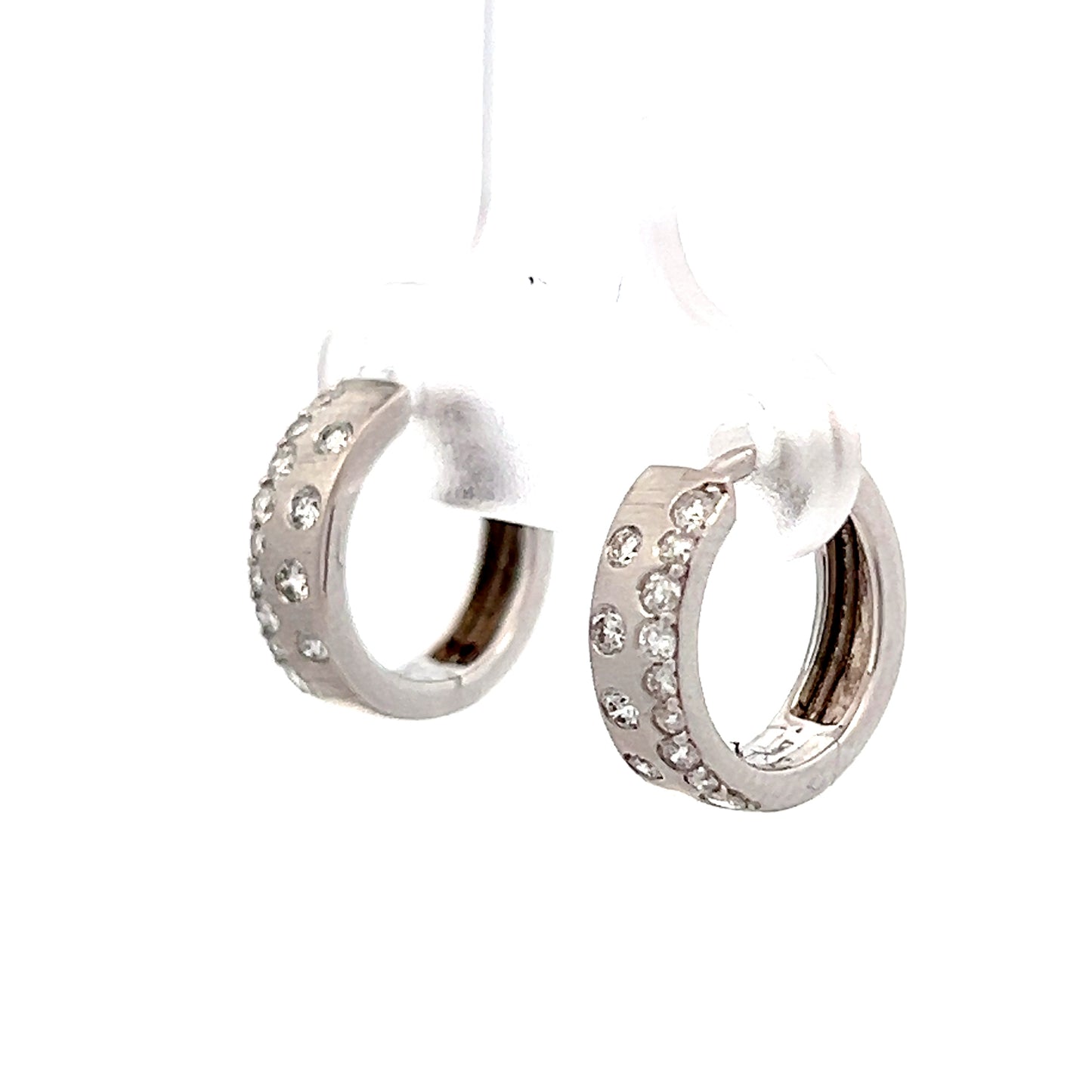 These small huggie hoop earrings are made from 14 karat white gold and hold 26 round brilliant cut diamonds. Each diamond weighs .013 carats and is set in an asymmetrical pattern that creates a simple yet modern design that catches light from every angle. The post backings provide comfortable, secure wear throughout the day.