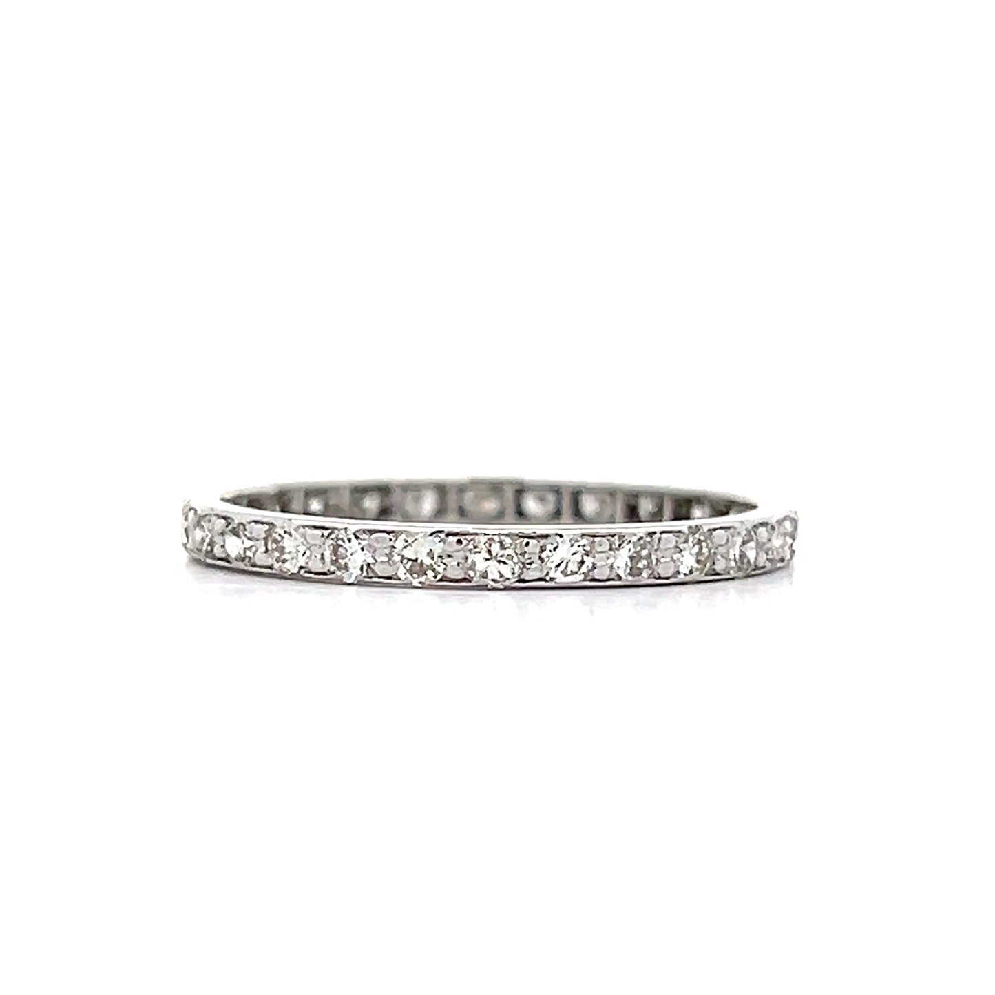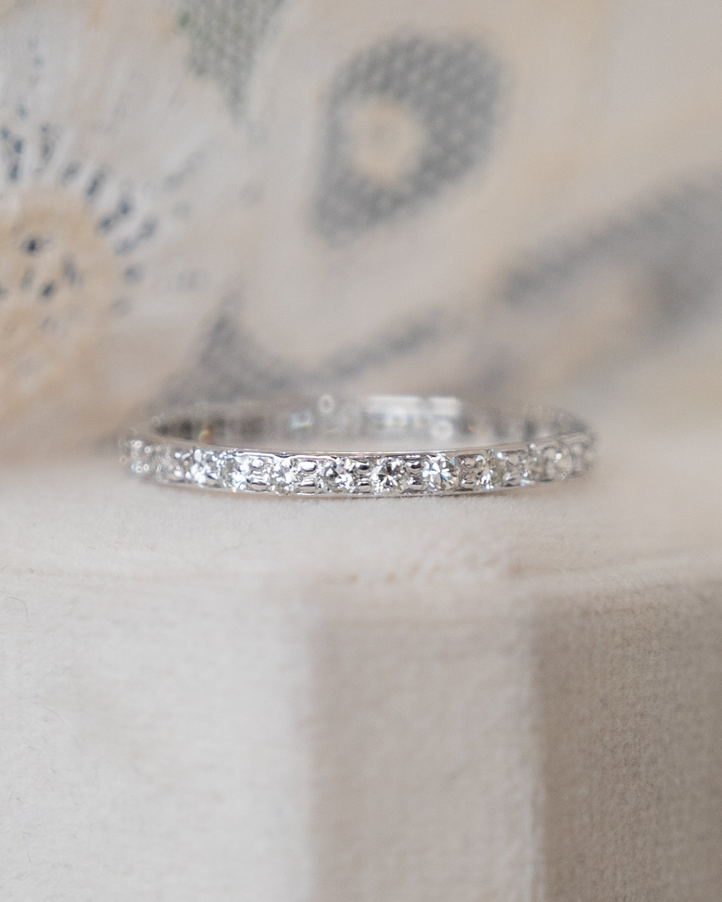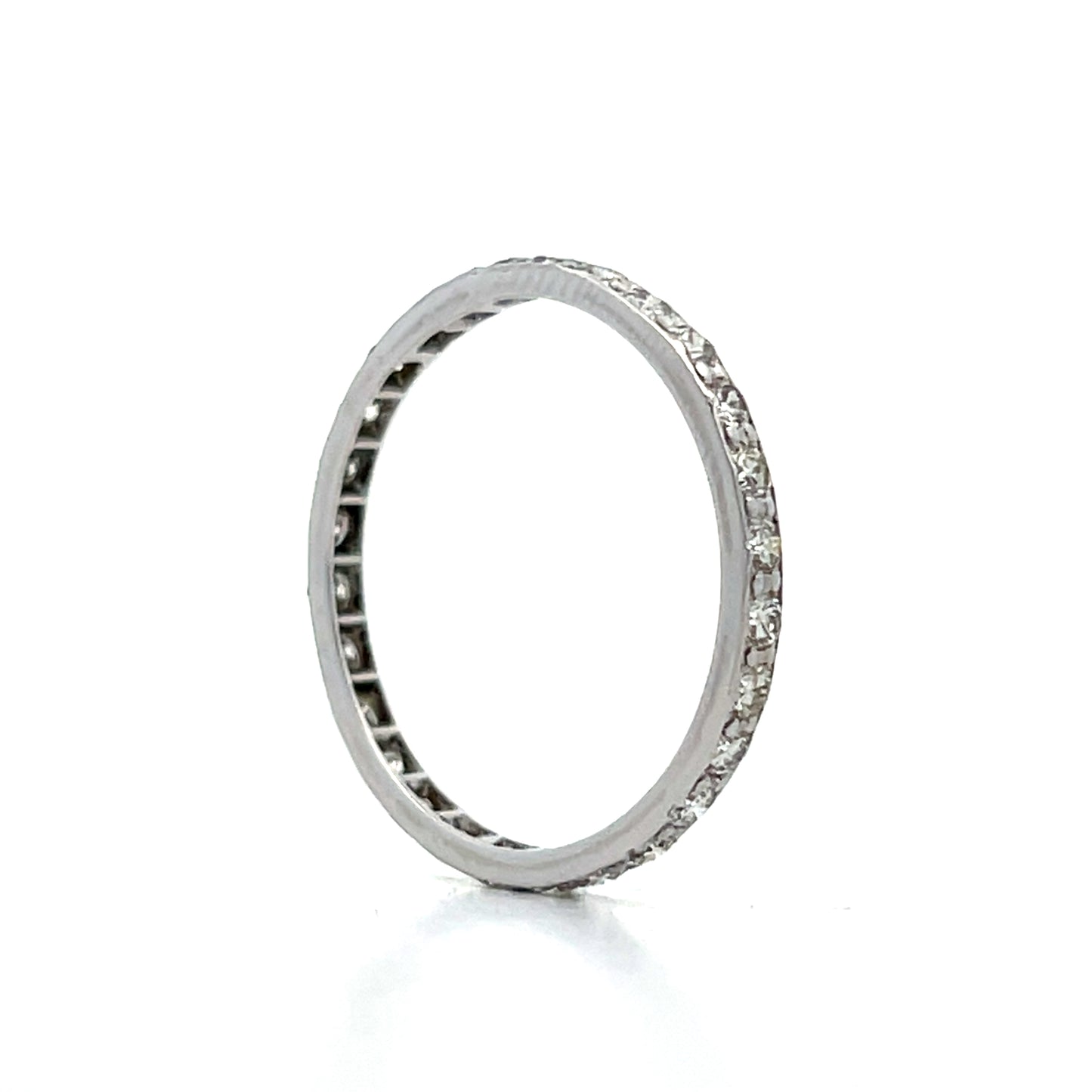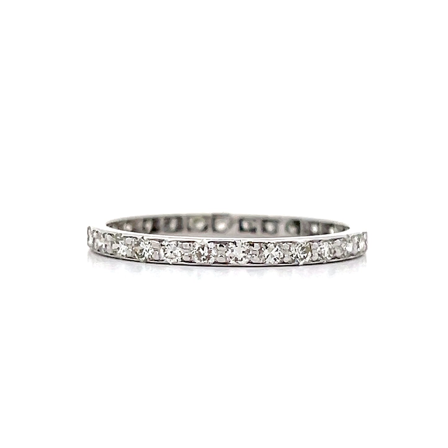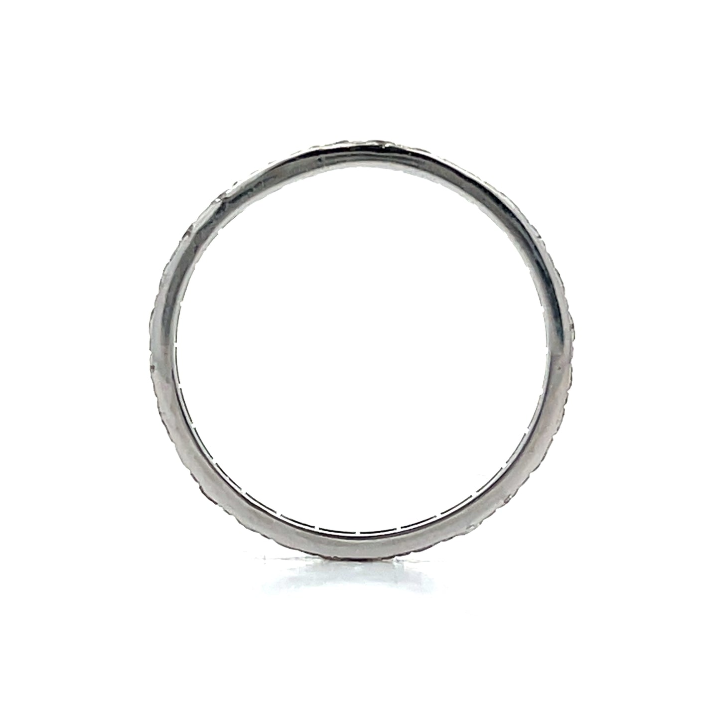 This diamond eternity wedding band features a complete circle of diamonds set in 18 karat white gold. The band measures 2mm wide and contains .35 carats of round brilliant cut natural diamonds that go all the way around the ring.