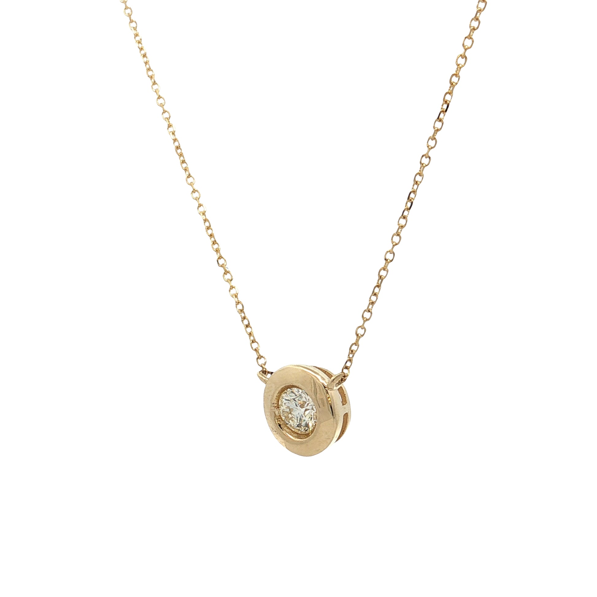 This 14 karat yellow gold pendant holds a .35 carat round brilliant cut diamond with L color and SI1 clarity in a heavy bezel setting. The L color means the diamond has noticeable warmth—there's a faint yellow tint visible to the eye, but the yellow gold setting actually complements this rather than contrasting it. The substantial bezel completely surrounds the diamond with a thick frame of gold, giving the pendant a bold, protective setting with plenty of visual weight.