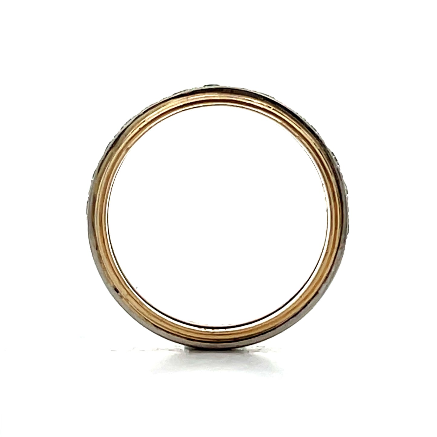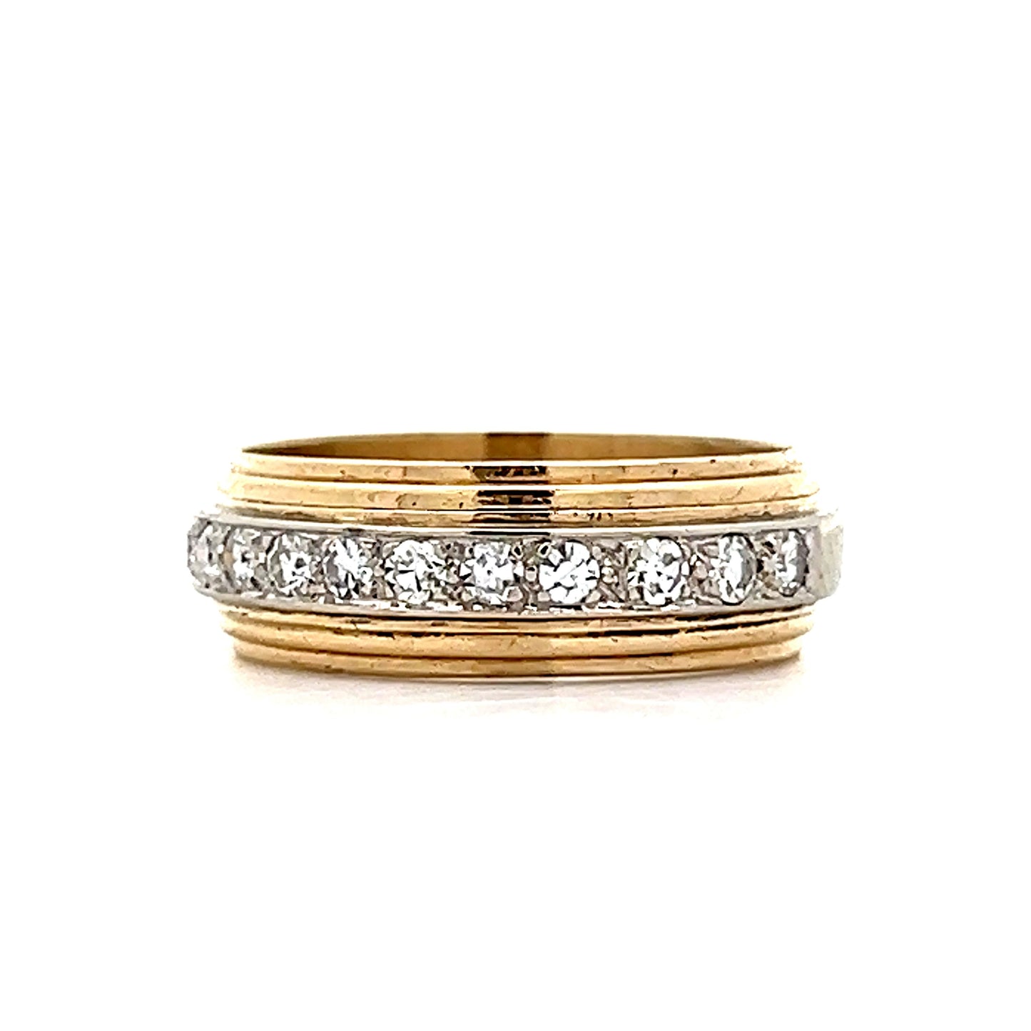 This vintage Retro stacking band is full of retro charm with a two-tone design in 14k yellow and white gold. The white gold center band is framed by yellow gold edges, accented by a step edge detail for added texture. Single-cut diamonds, with a total weight of .35 carats wraps halfway around the band and have a brilliant sparkle. The size of the ring makes it perfect for stacking or as a chic right hand ring.