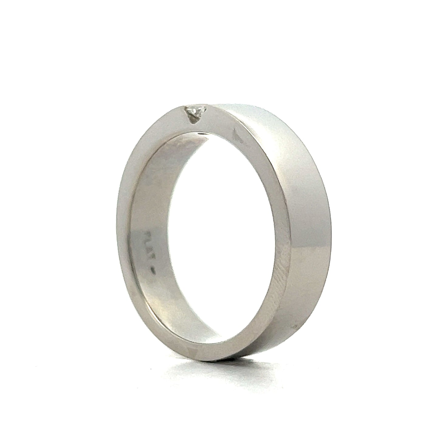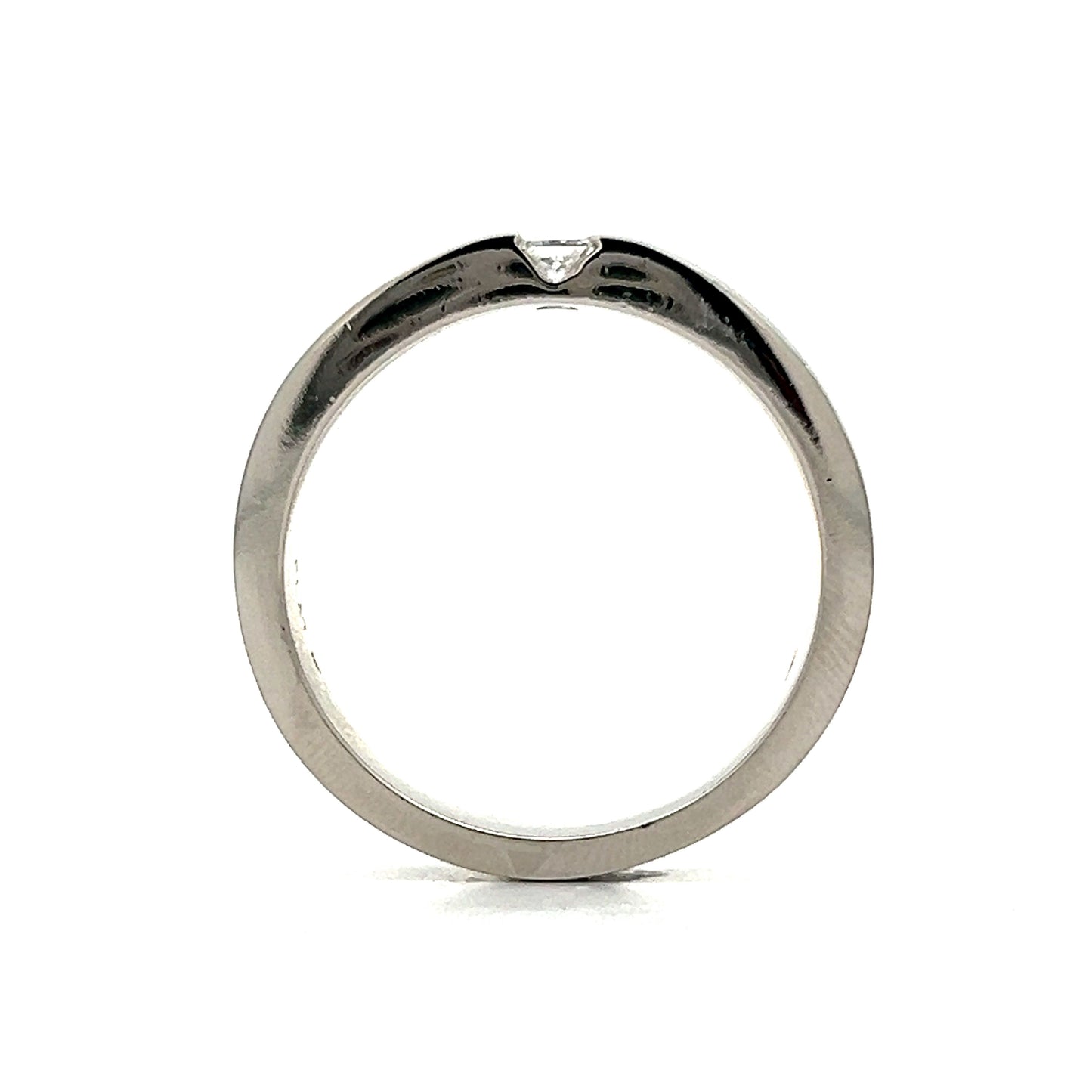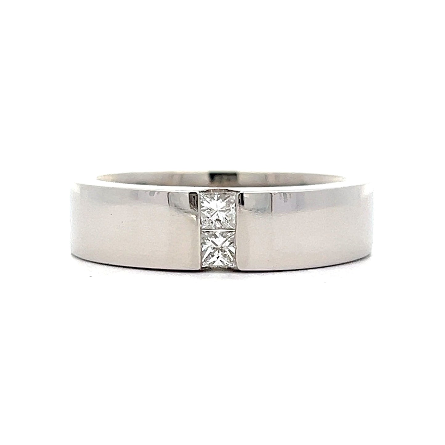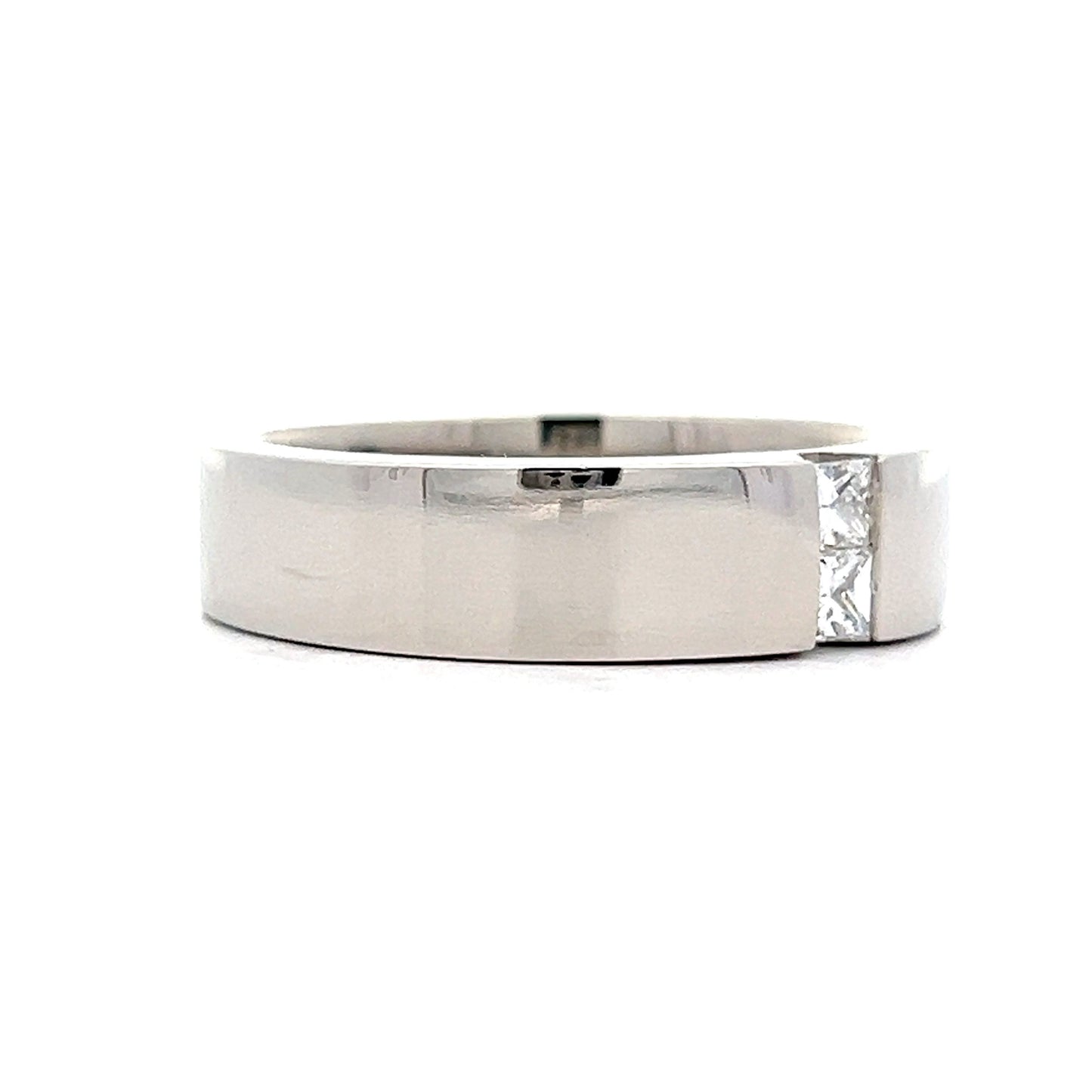 This modern men's wedding band is sleek with a bit of sparkle. Finished in platinum, the band features two princess cut diamonds that are channel set on the top of the ring. The two square cut stones combine with the channel for a linear look and add just enough sparkle to keep things interesting. The band is 6.5mm wide, giving it a substantial look and presence.