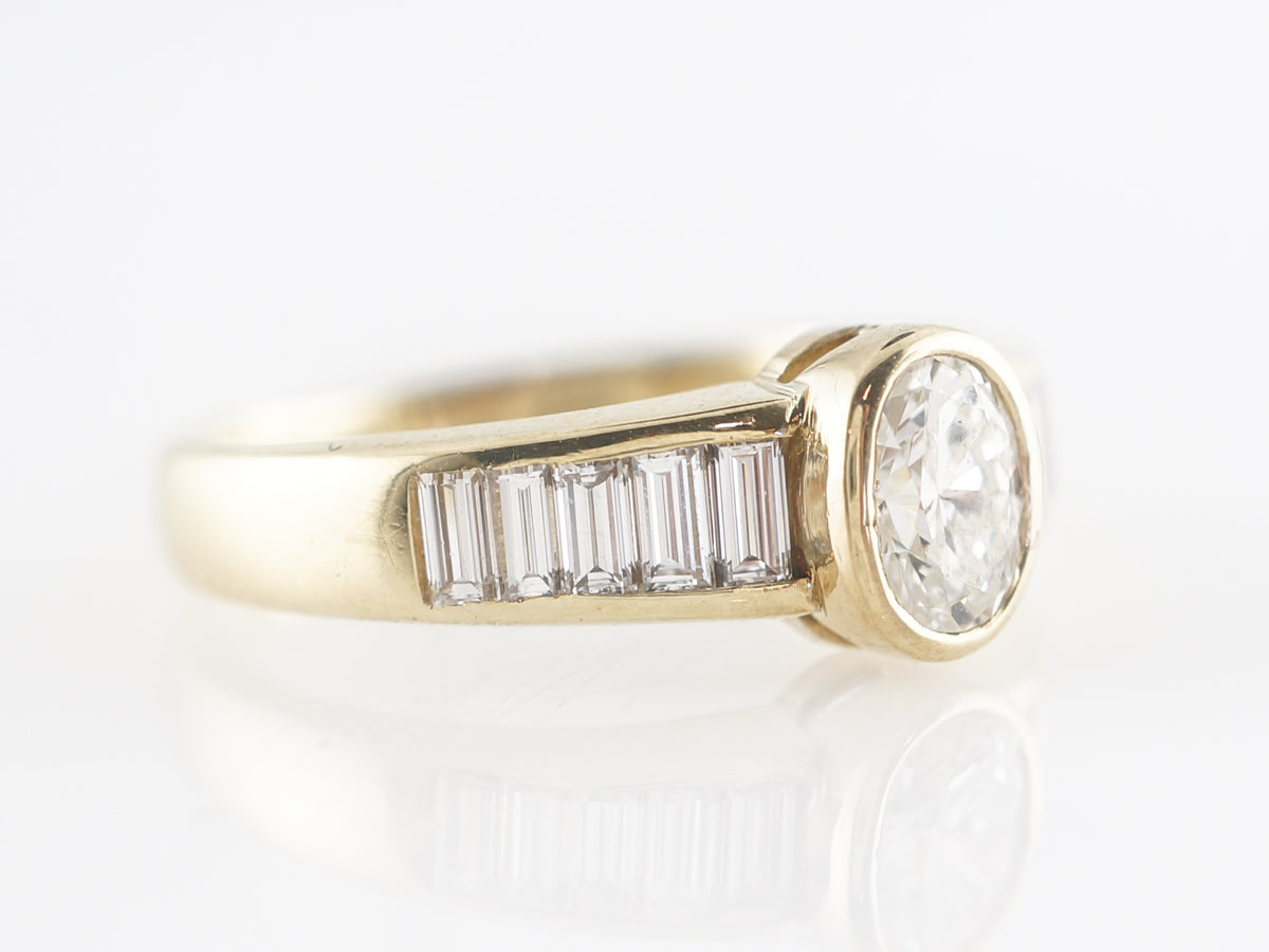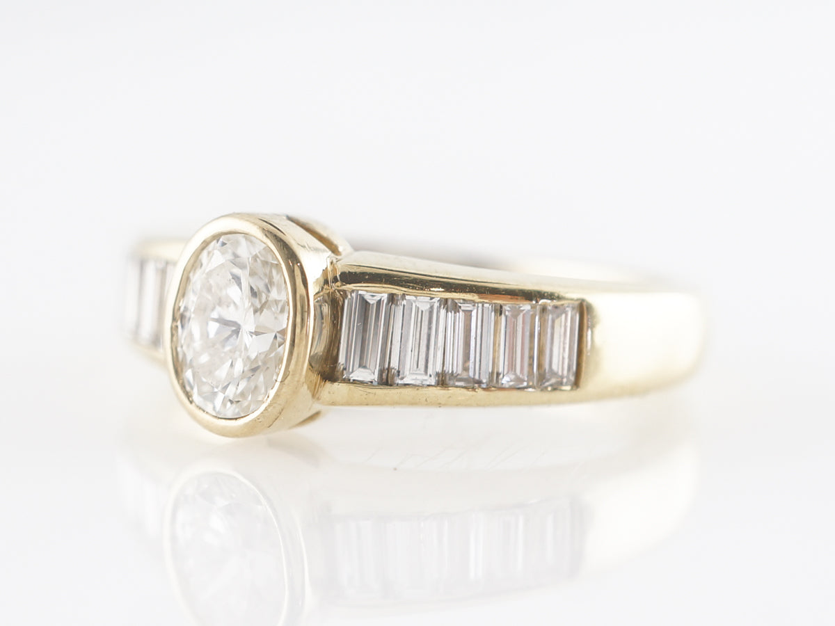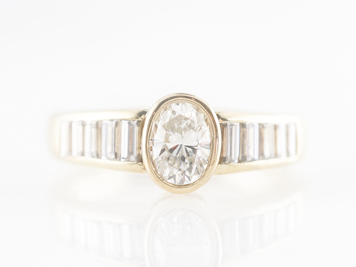 .36 Oval Diamond Engagement Ring in 18k Yellow Gold. This modern engagement ring has a .36 carat oval cut diamond set in 18 karat yellow gold with baguette accents. The .45 carats of baguette cut diamonds are channel set down the shoulders and provide a wonderful symmetry to the face of this ring. Clean and minimalist, this ring would look amazing with a thin diamond wedding band.