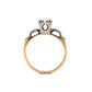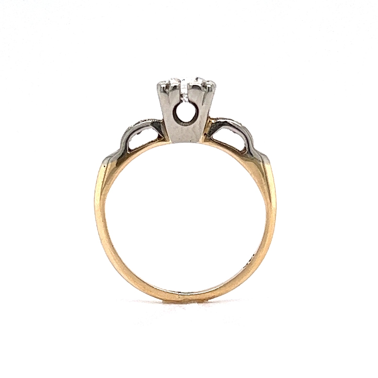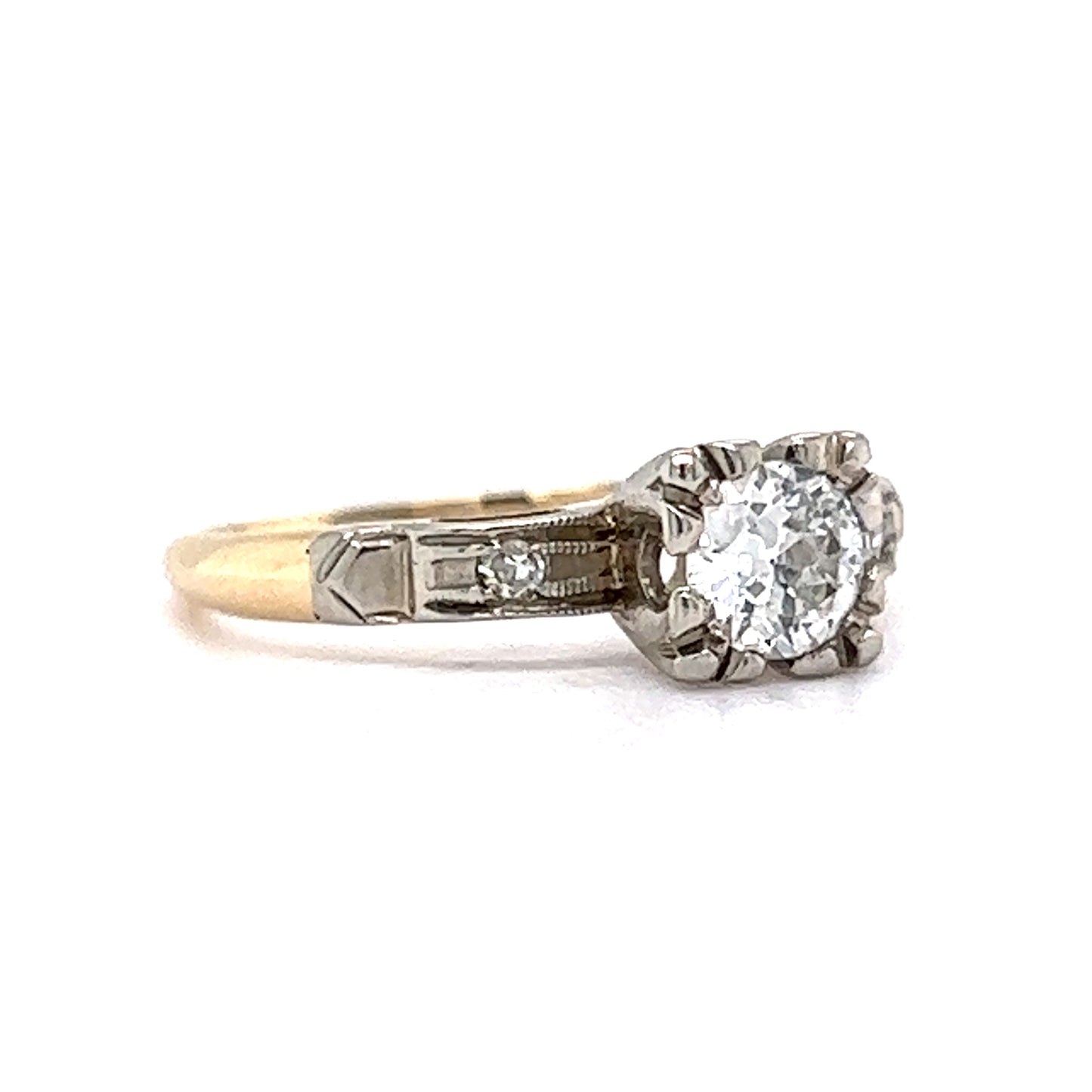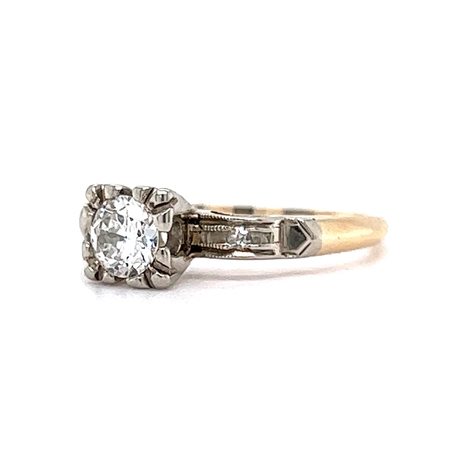 This romantic engagement ring features a .36 carat transitional cut diamond and two natural diamond accents in 14 karat yellow and white gold. Flanked by two small natural diamonds, the center diamond sparkles with a captivating brilliance. The two accent diamonds each have a carat weight of .015 and a 1.5mm size. The 14 karat yellow and white gold band adds an elegant contrast to the classic shimmer of the diamonds. This beautiful antique engagement ring is a perfect symbol of your everlasting love.