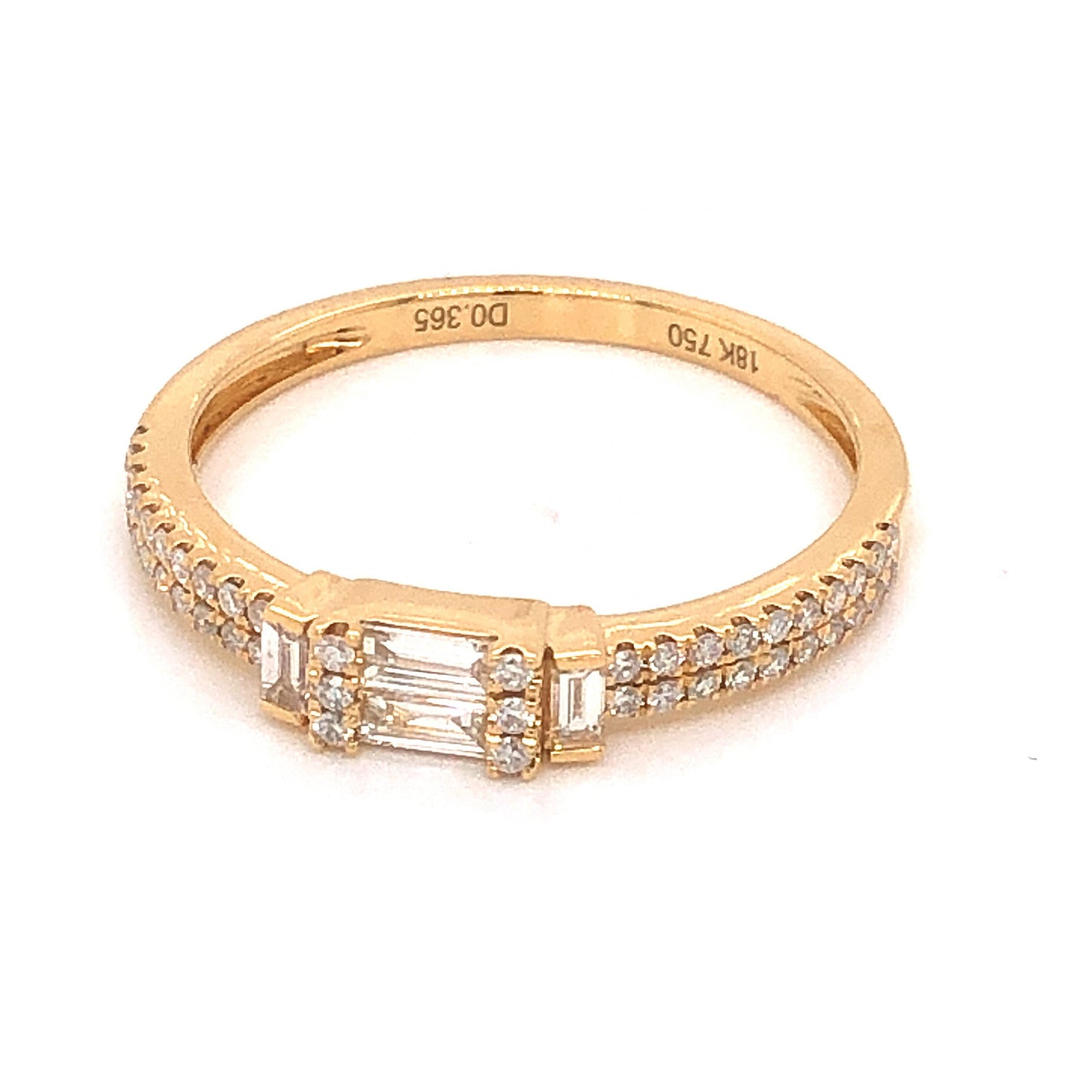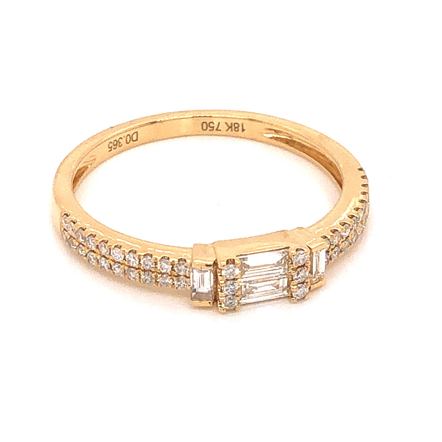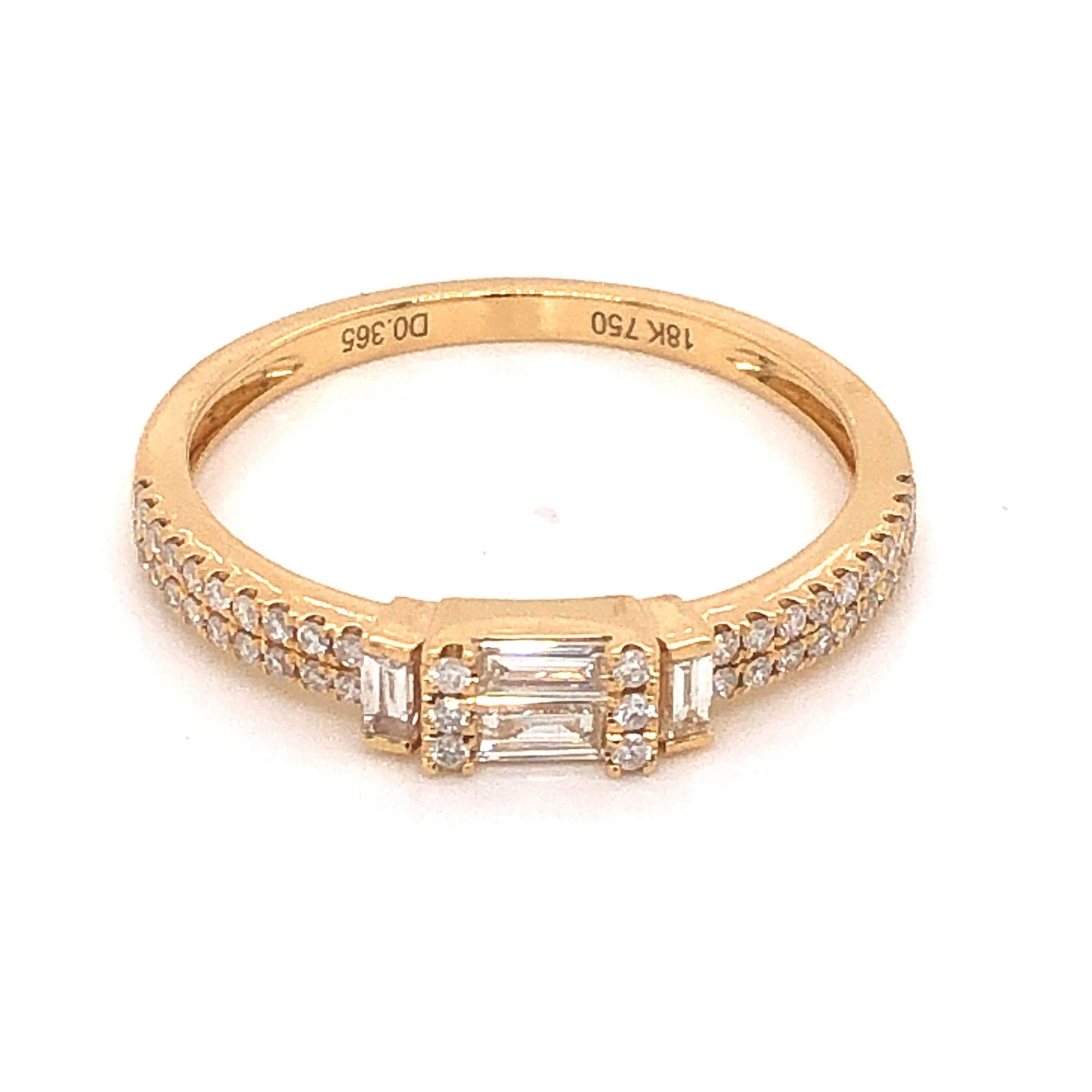 .37 Diamond Cluster Half-Eternity Band in 18k Yellow Gold. This sparkling wedding band features .37 carats of diamonds finished in 18 karat yellow gold. Four (4) .0525 carat baguette diamonds are set at the head and beginning of the shoulders of the band. Six (6) .005 carat diamonds are prong set around the two center stones. Completed in a half-eternity band style, forty (40) .00325 carat diamonds are set in scallop setting around the front half of the ring. This polished 18k yellow gold wedding ring has structure and sparkle and would also make for a stunning stacking ring!