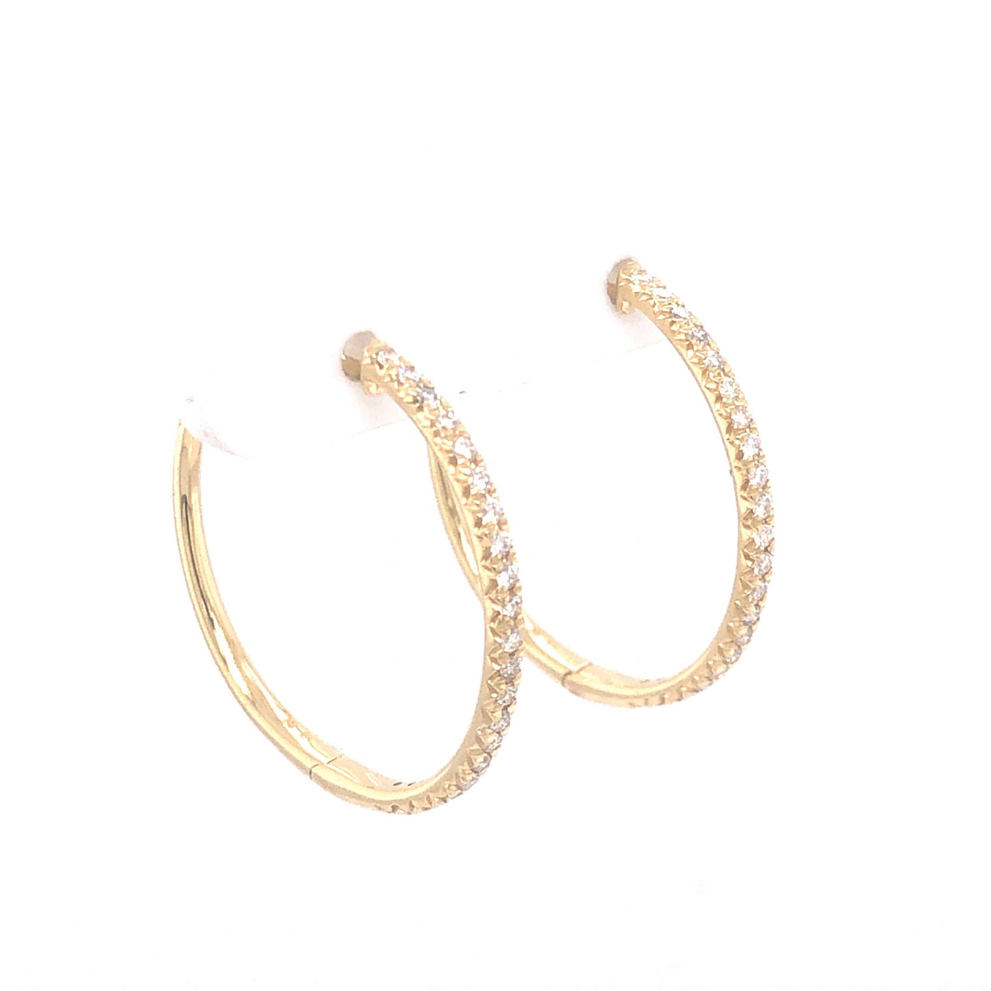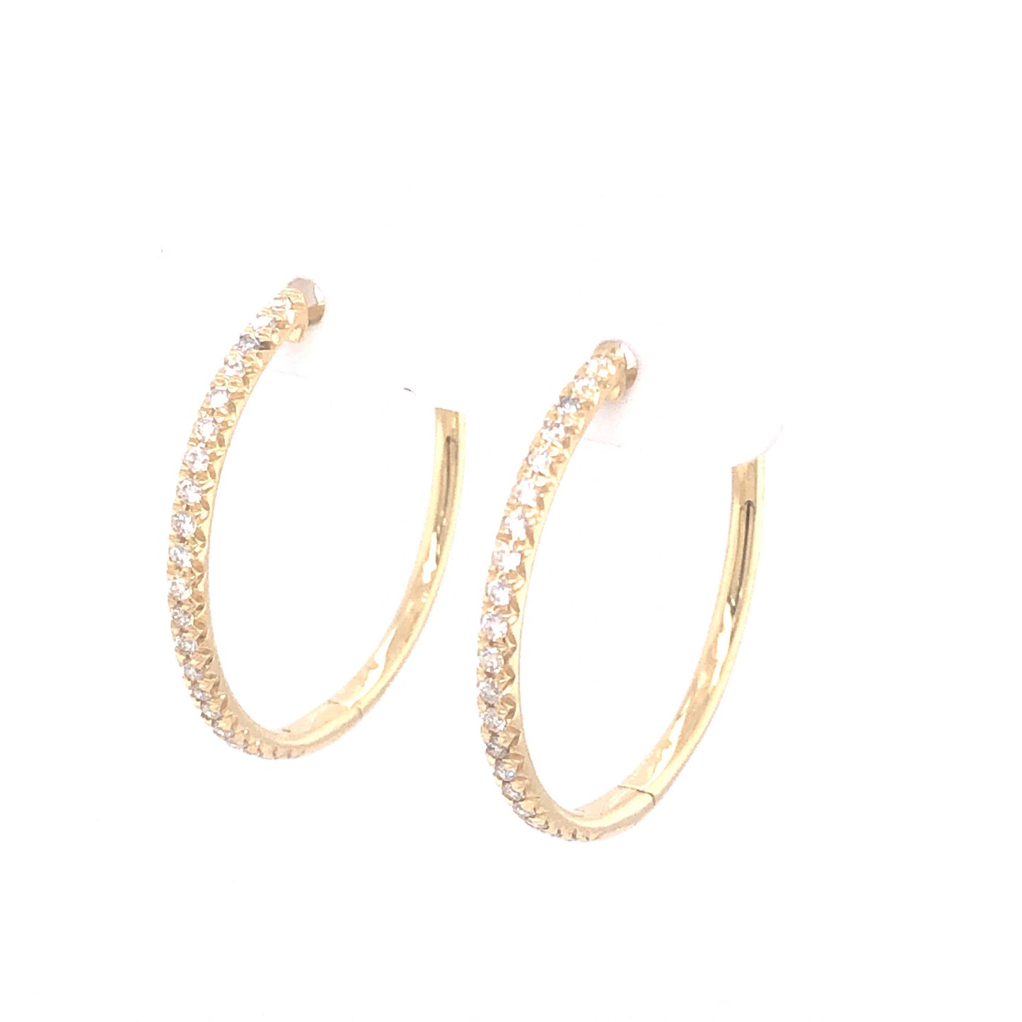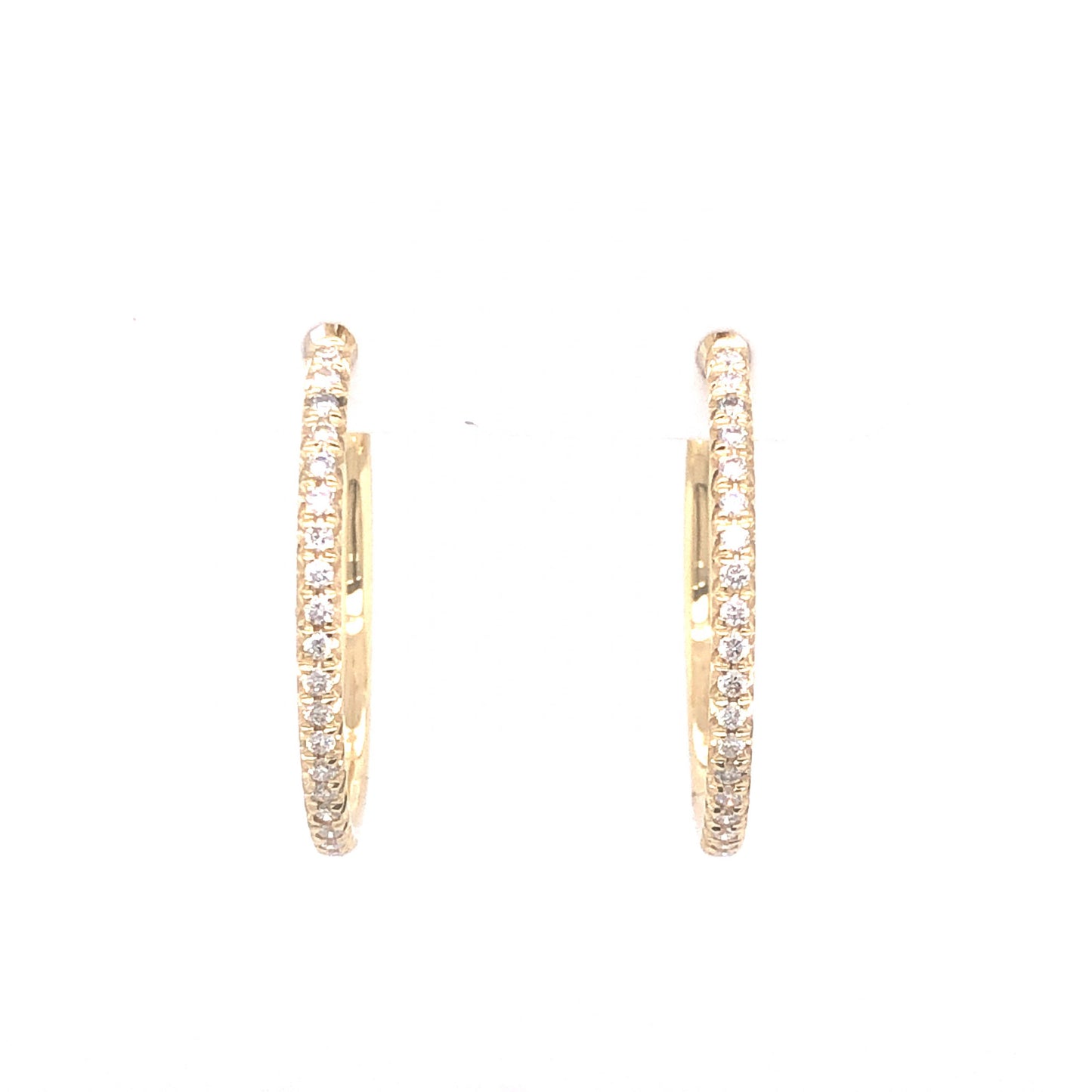 .37 Diamond Hoop Earrings in 14K Yellow Gold. These stunning hoop earrings feature .37 carats of sparkling diamonds in polished 14 karat yellow gold. Curving halfway around the hoops, forty-two (42) .0088 carat diamonds give an impactful brilliance to the warm yellow gold structure. The diamonds are near colorless and set in delicate French V split prongs. Finished with secure yellow gold backings, these hoops will glitter from every angle and are perfect for any wardrobe style!