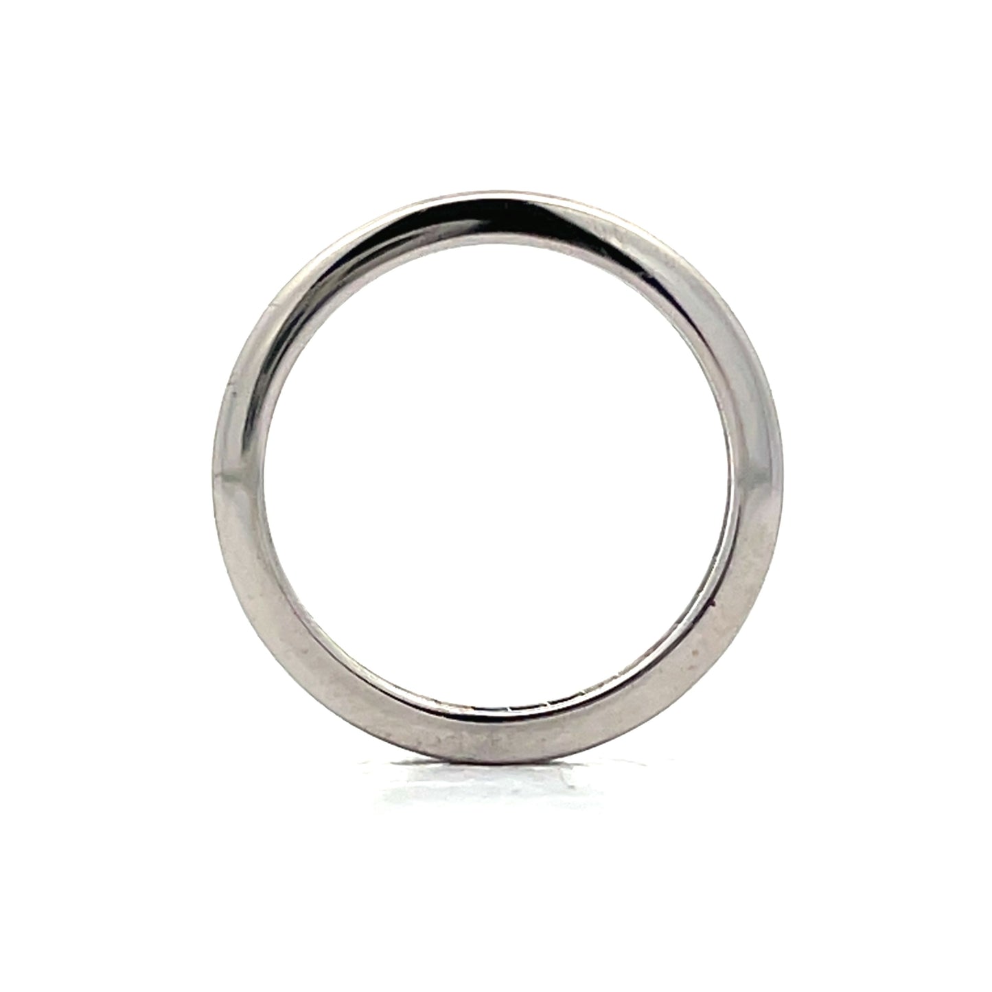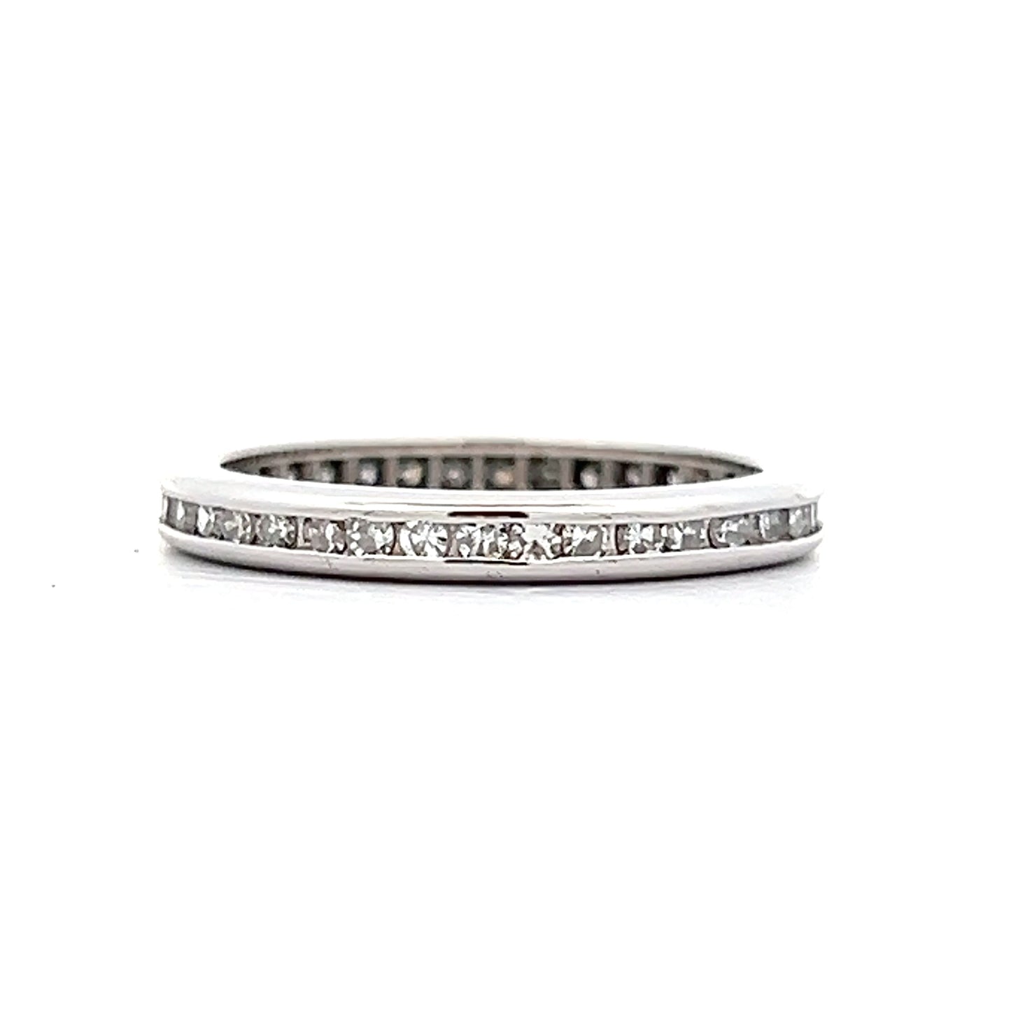 This Mid-Century eternity wedding band in 14 karat white gold is a true classic. A continuous line of single-cut diamonds, each with VS2 clarity and H color, wraps elegantly around the band that brilliantly catches light from every angle. The channel setting creates a sleek, secure profile, whether paired with an engagement ring or worn alone. With its polished finish, this band captures the classic appeal of the era, making it a graceful yet striking yet understated addition to any look.