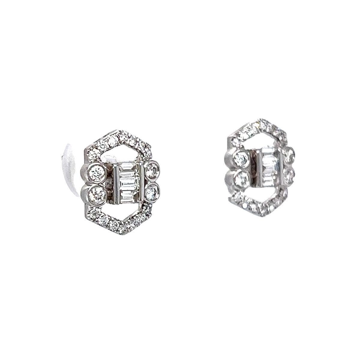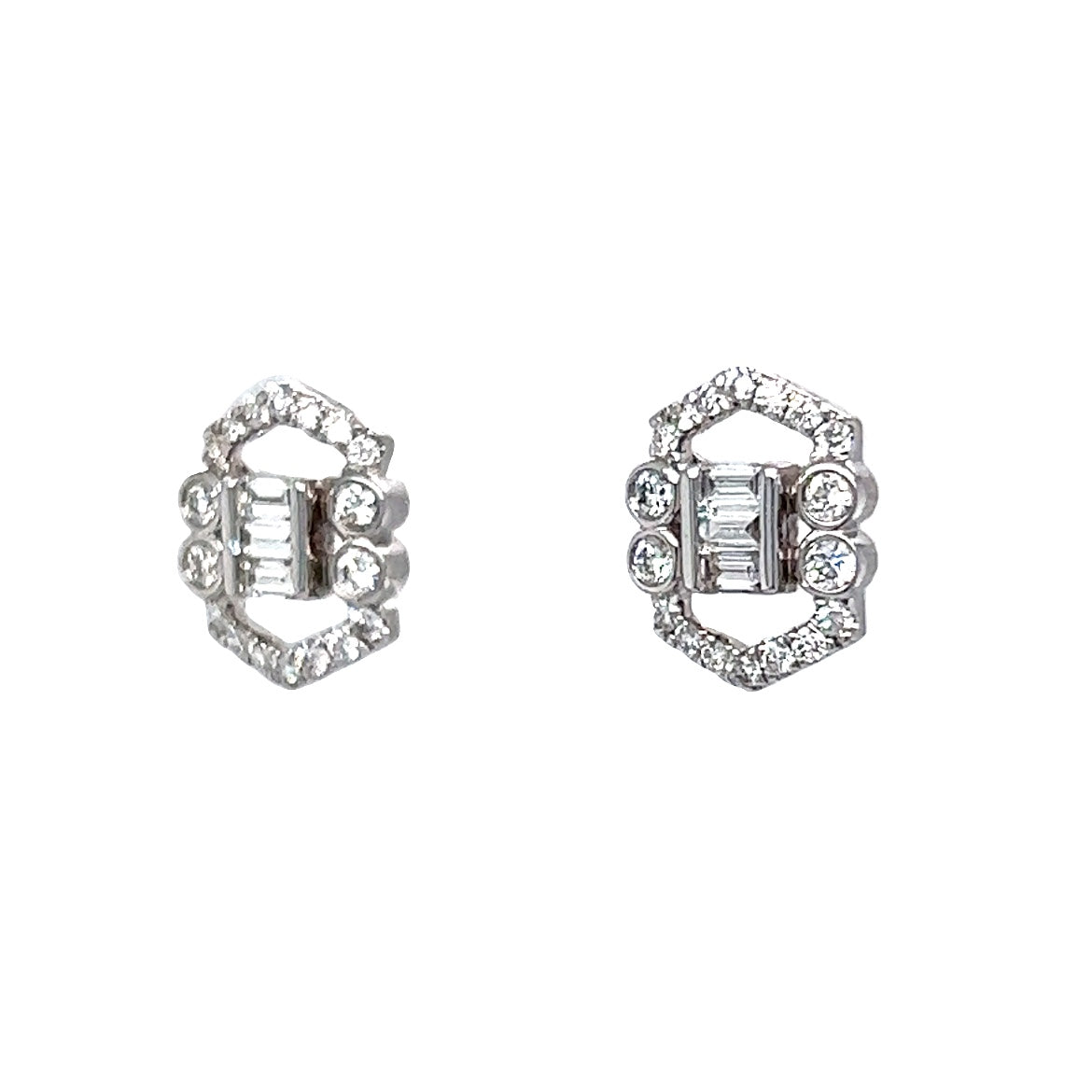 .39 Diamond Earring Studs in 18k White Gold. These gorgeous stud earrings feature .39 carats of diamonds on a geometric mounting finished in 18k white gold. Six (6) .025 carat baguette diamonds are set in sleek channel bars at the centers of the studs. Near colorless and eye clean, the baguettes create a beautiful “hall of mirrors” light play that catches the eye. Four (4) .015 carat Round Brilliant cut diamonds are bezel set at the tops and bottoms of the studs. An additional thirty-two (32) .0056 carat Round Brilliant cut diamonds wreath the geometric mounting in white gold.