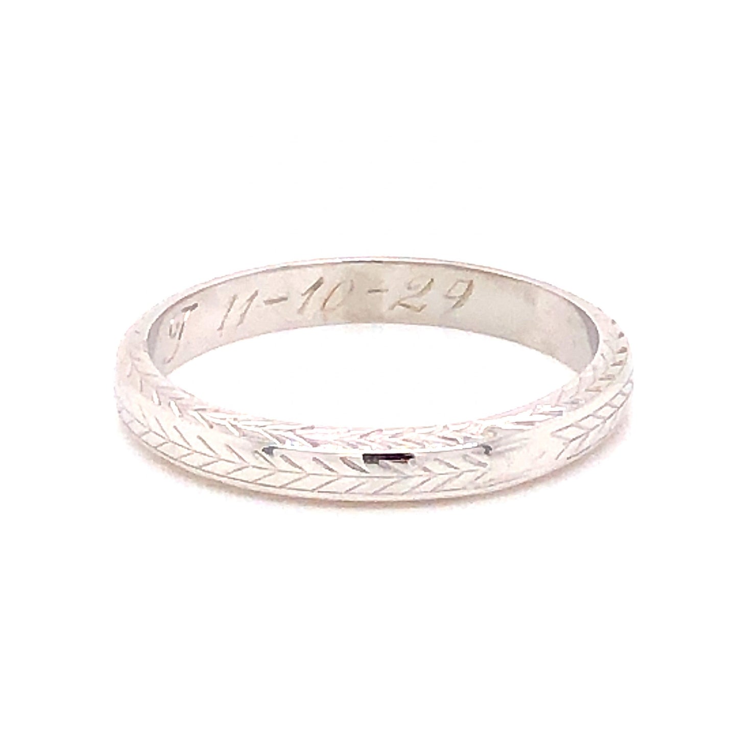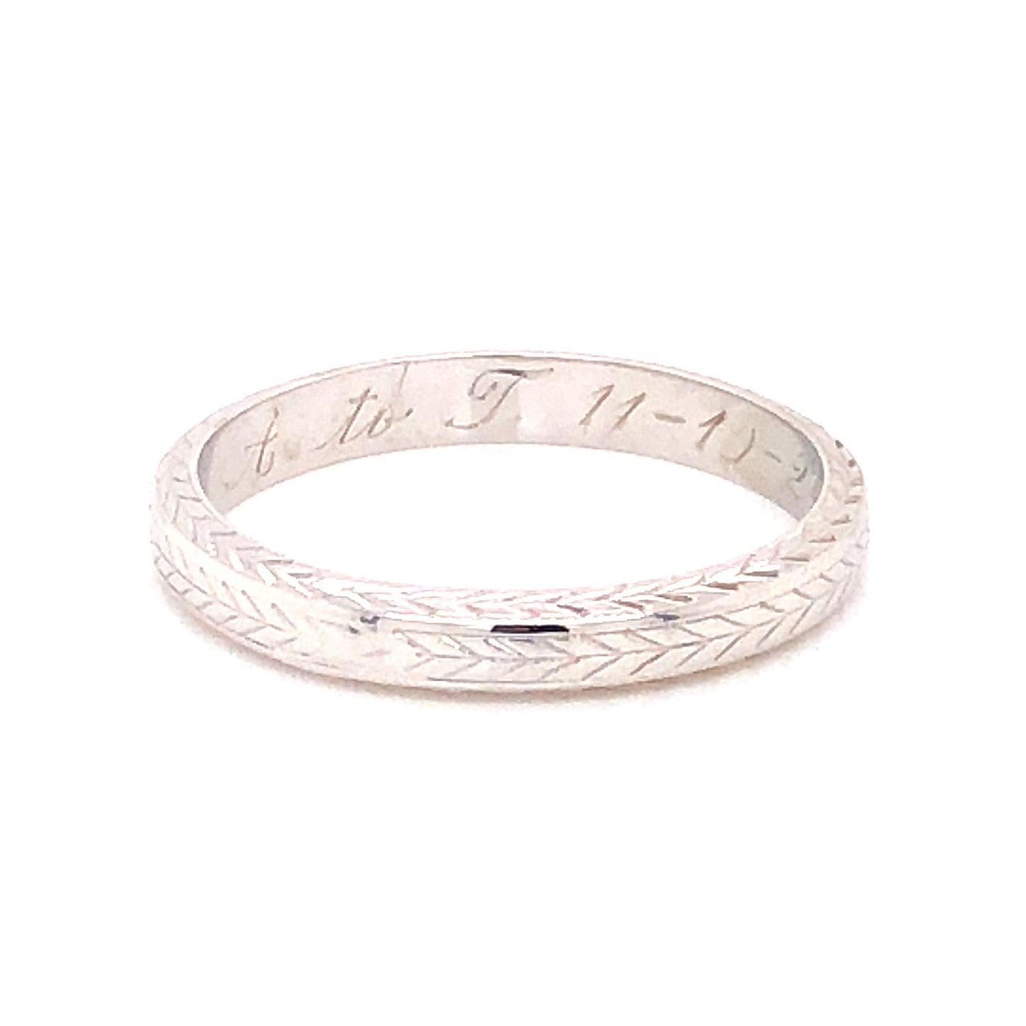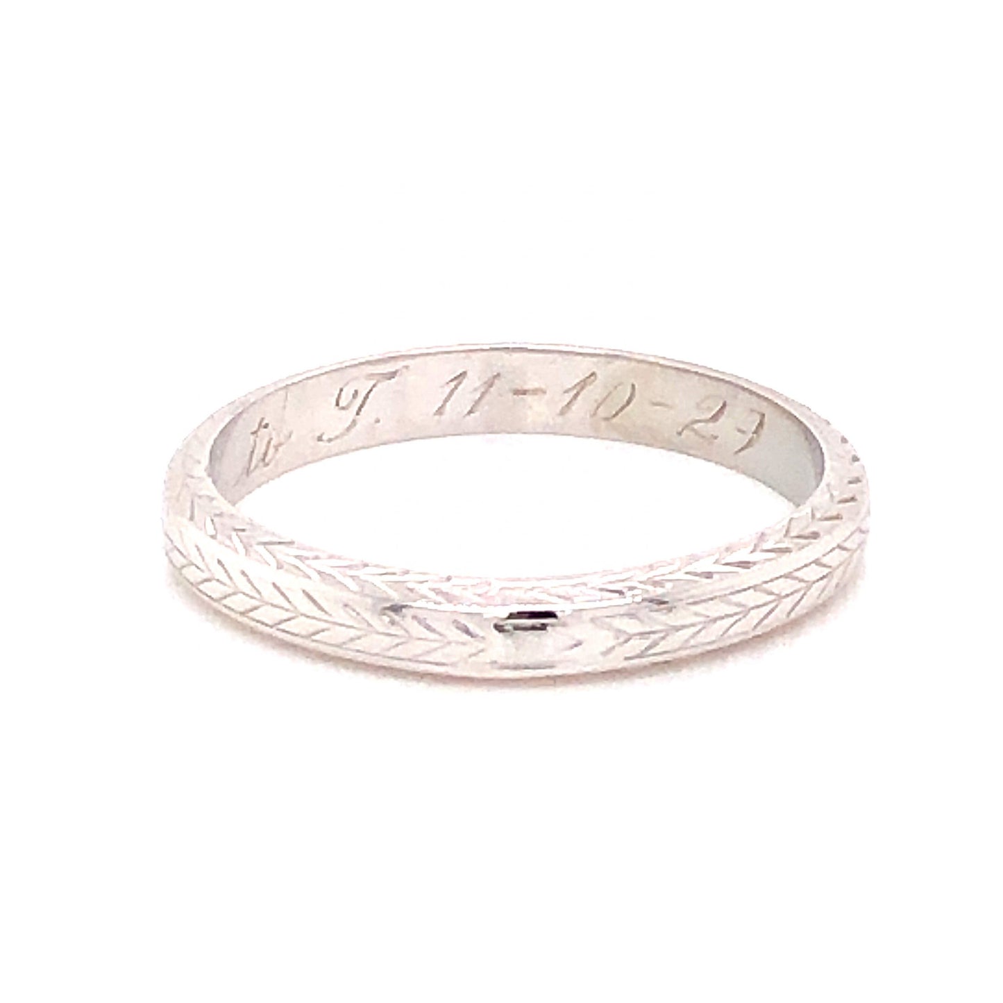 3mm Art Deco Chevron Wedding Band in 18k White Gold. This 3mm Art Deco wedding band features an engraved chevron pattern finished in 18 karat white gold. The band has a flat exterior profile that is engraved in a geometric Art Deco pattern. This antique wedding band has style and elegance. A gorgeous choice for your wedding ceremony!