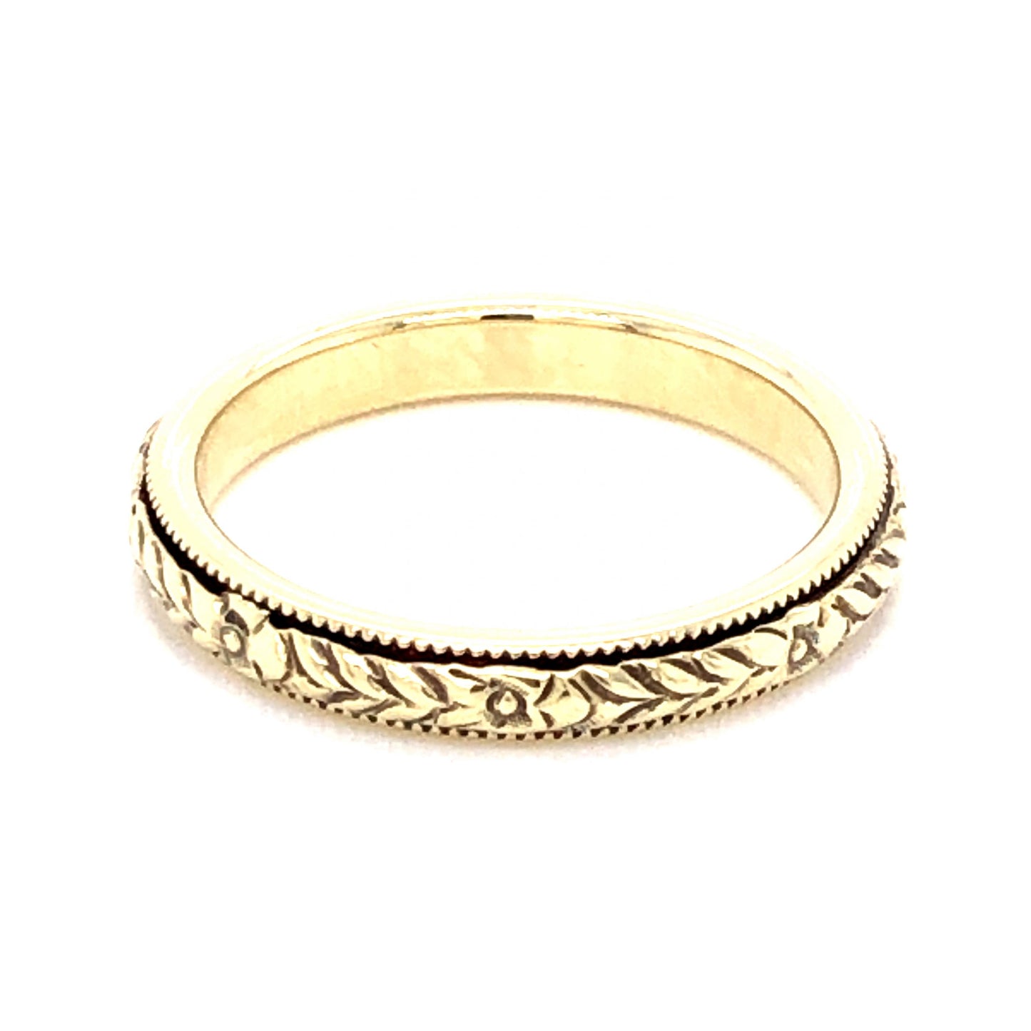 3mm Art Deco Engraved Wedding Band in 14k Yellow Gold. This chic Art Deco wedding band features bold engravings finished in polished 14 karat yellow gold. The band measures 3.03mm wide and has a flat profile. Leafy patterns are engraved on the outside of the band with a milgrain style trim. A small inscription of “14K” is stamped on the inside of the shank, ensuring that it is 14 karat yellow gold.