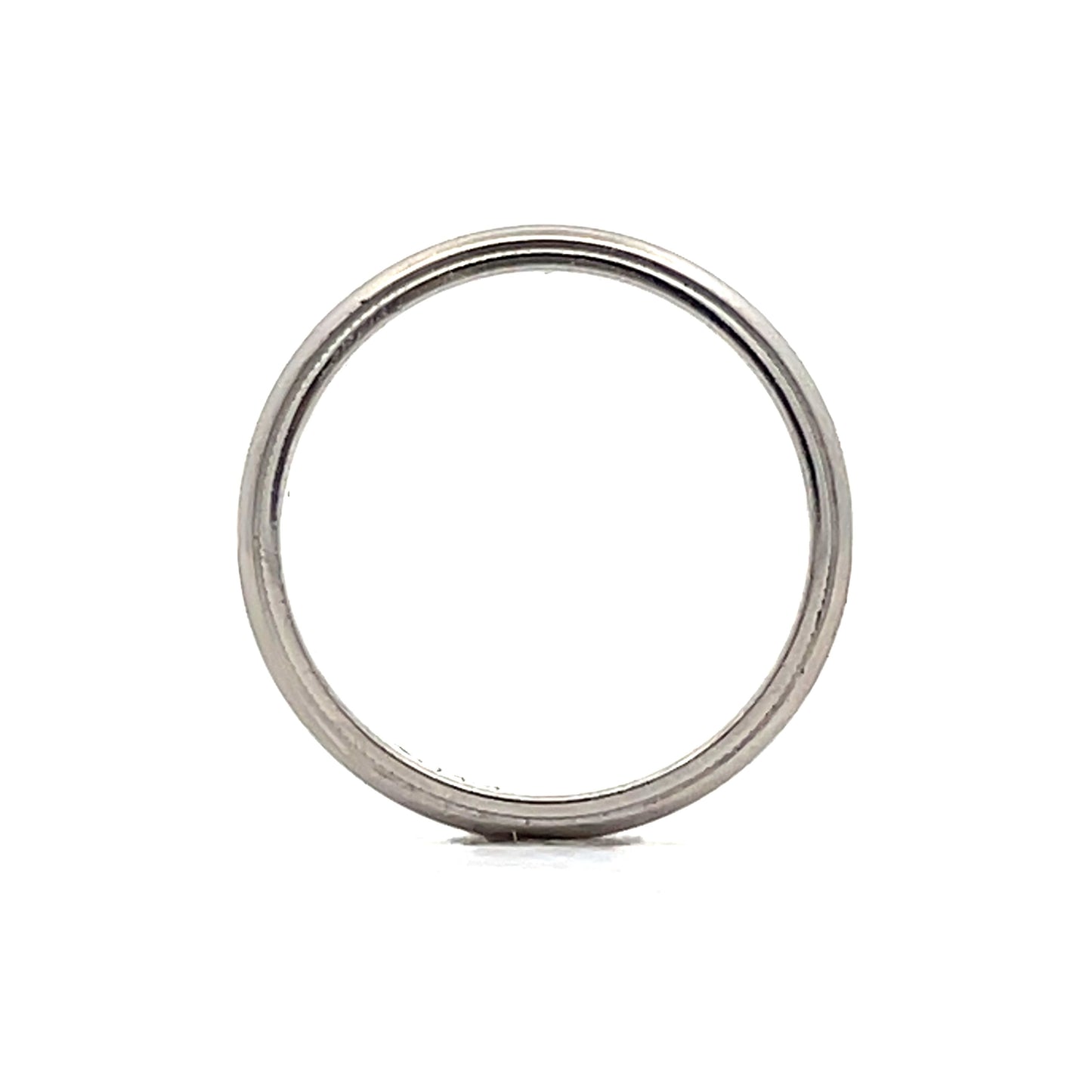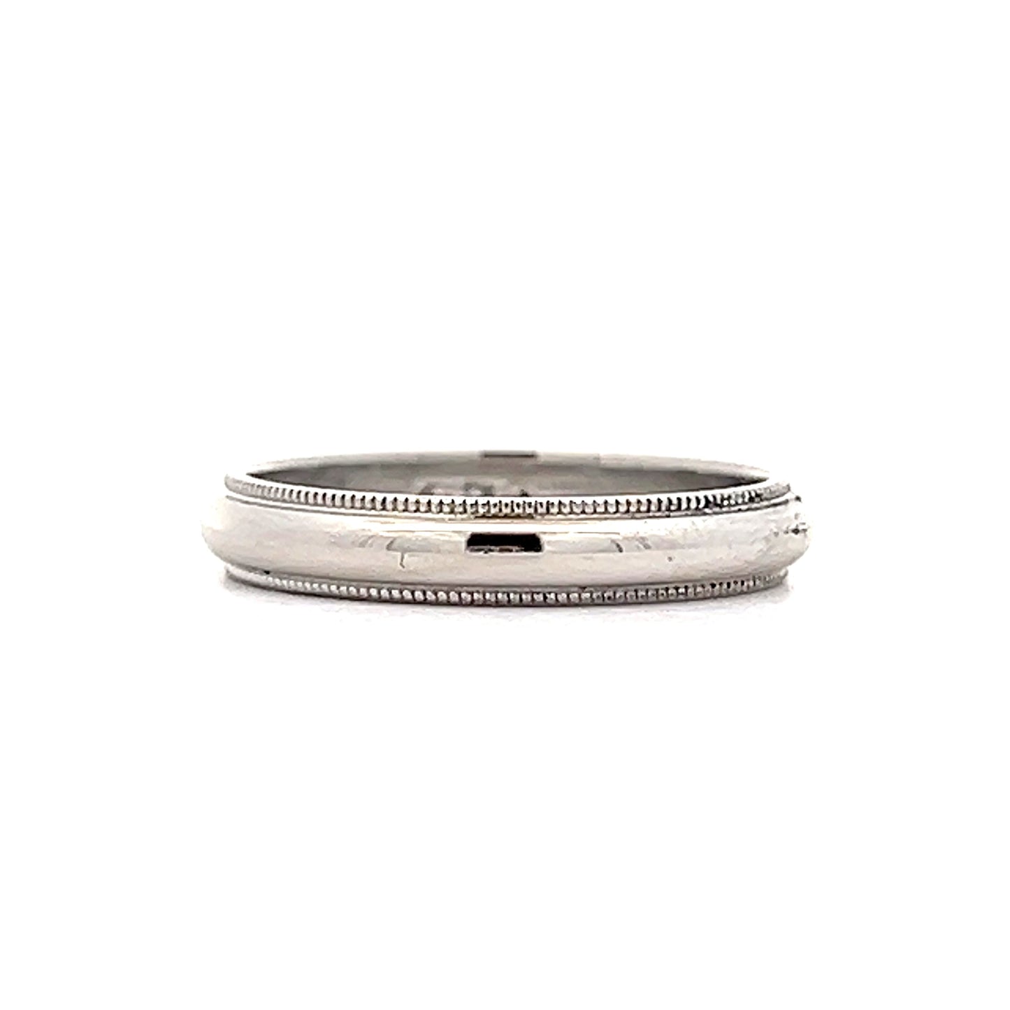This 3mm wide wedding band in 14 karat white gold features a half-round design. The standout detail is its milgrain edge, offering a subtle understated texture. Whether worn solo or paired with an engagement ring, it’s a versatile piece designed to complement any style.