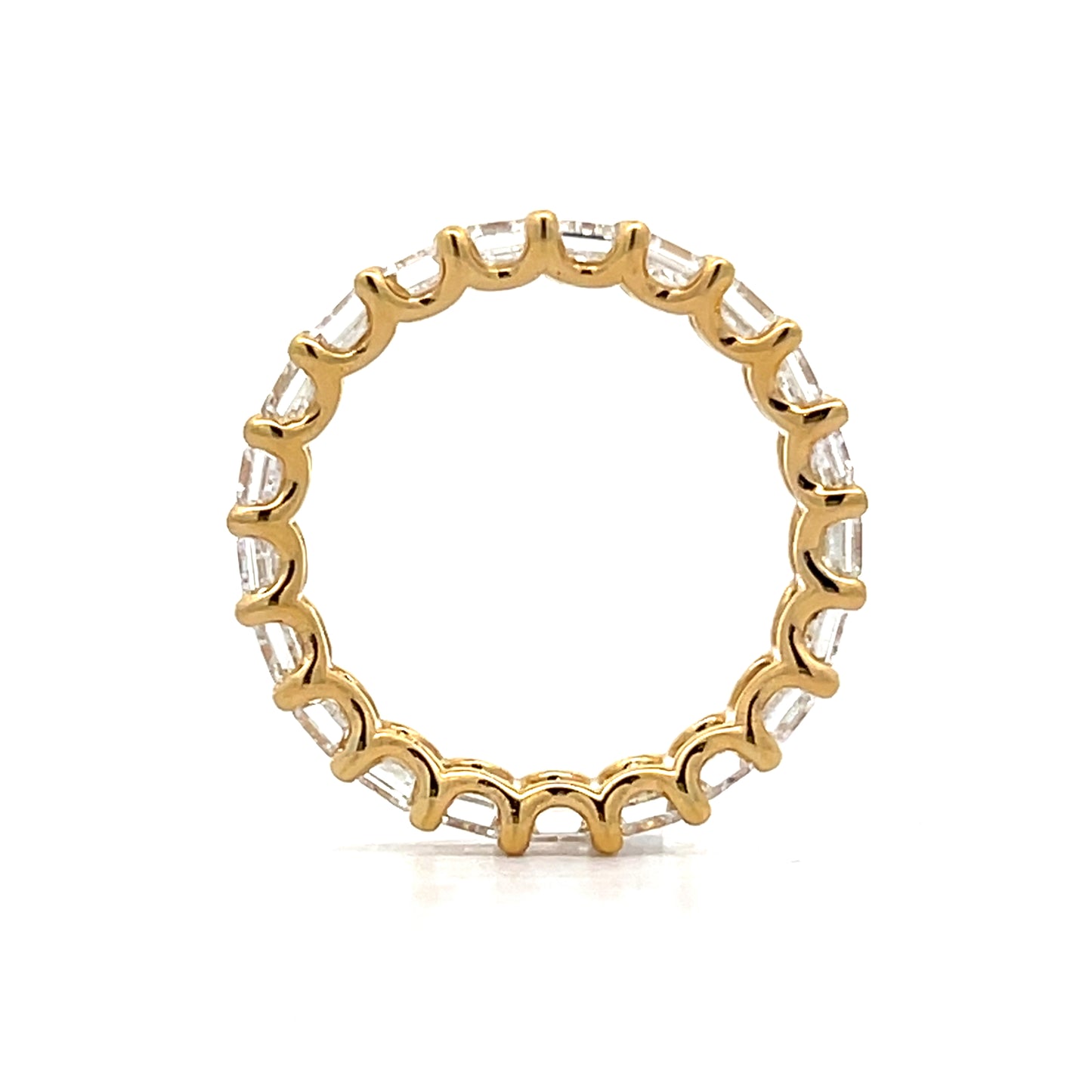 This modern eternity band is crafted in 18 karat yellow gold and features emerald-cut diamonds encircling the entire ring. The diamonds have a combined weight of 4.01 carats, with a VS2 clarity grade and H color. The prong setting secures each diamond while allowing for maximum brilliance. The band’s continuous design symbolizes enduring love, and its stackable style offers versatility for pairing with other rings.