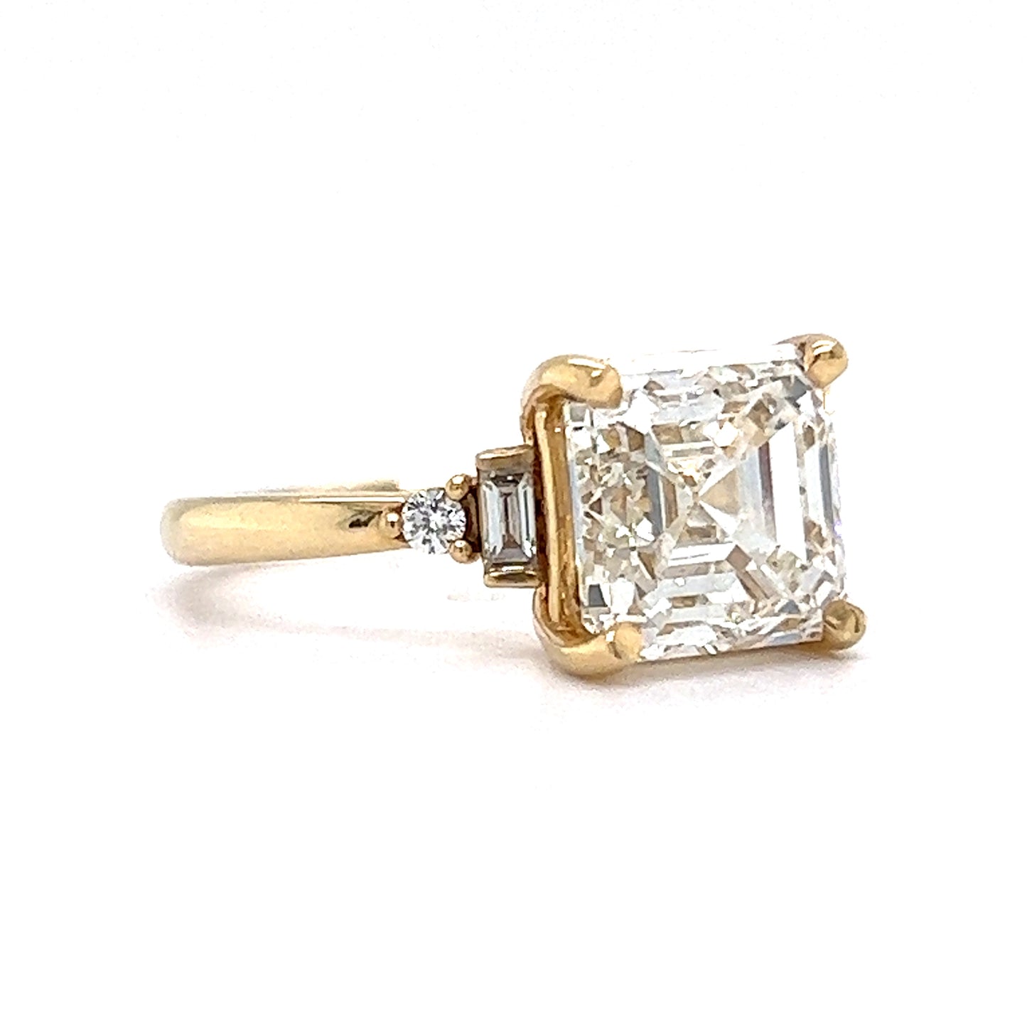 This elegant engagement ring features a GIA-certified 4.01 carat Asscher cut diamond set in 14 karat yellow gold. The center stone is eye-clean and dazzling, with iconic Asscher facets that catch the eye. Set in four golden prongs, the primary diamond is accented by two (2) .06 carat baguette diamonds and two (2) .03 carat accent diamonds. The style of diamond variety gives this ring dimension and range of brilliance. The slight warm hue of the center stone pairs well with the high polished 14k yellow gold band. A lovely addition to our Future Classic Engagement Rings collection.