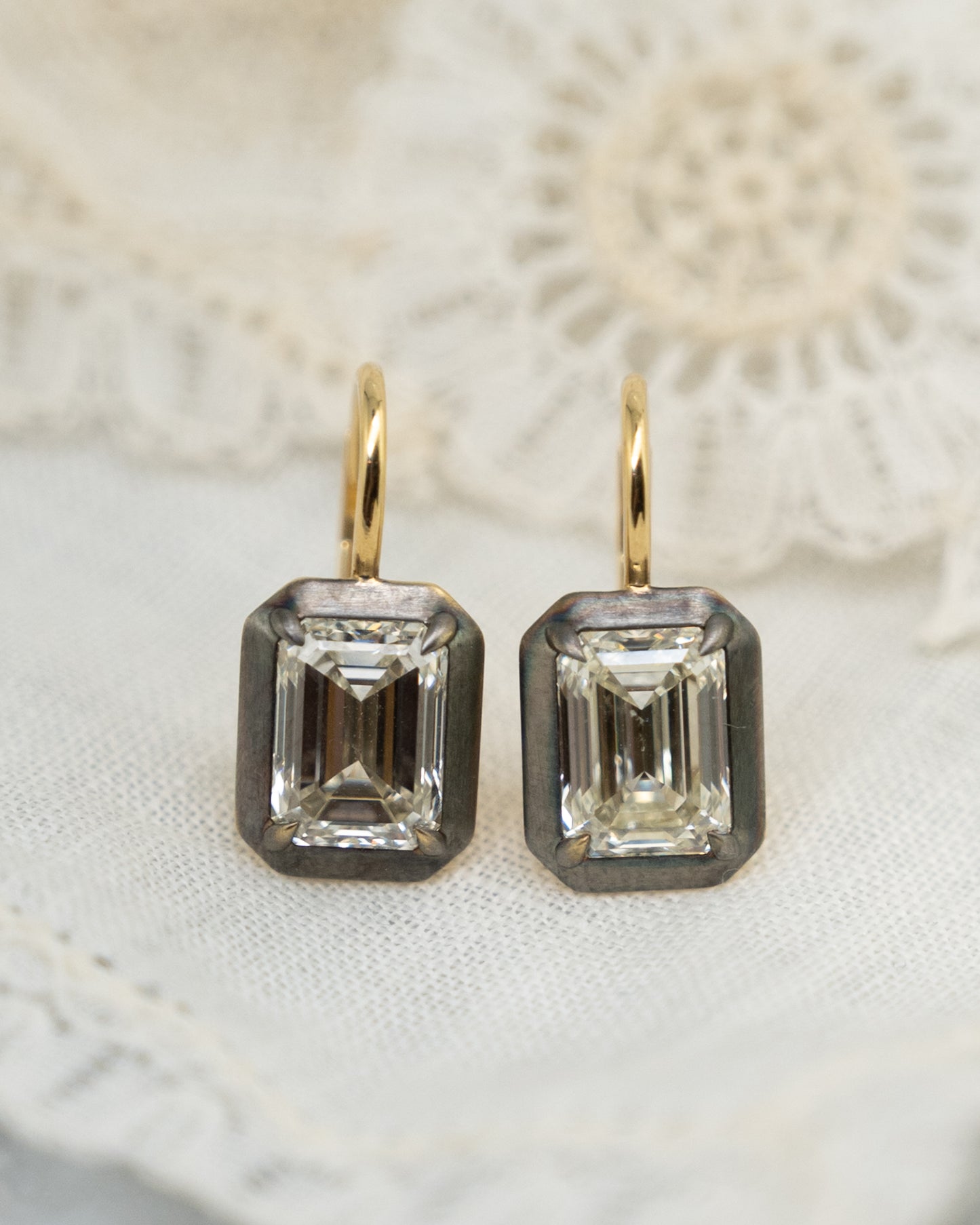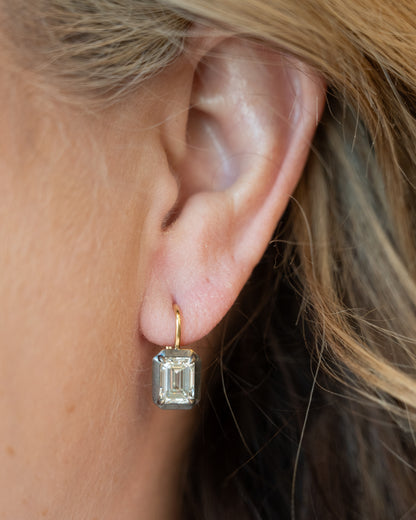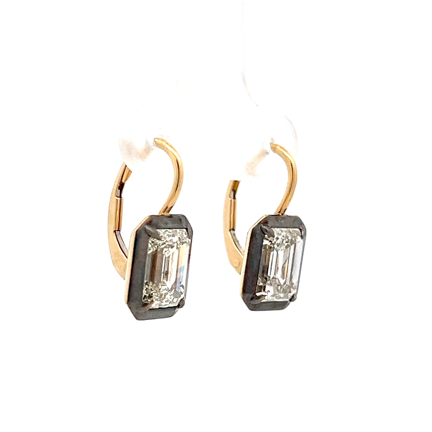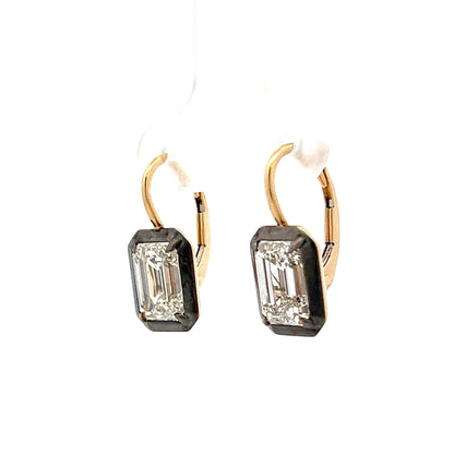 This pair of diamond drop earrings features a total diamond carat weight of 4.04, with two main emerald-cut natural diamonds at 2.02 carats each. The earrings measure 8.18 x 6.06 x 4.17 and combine 18 karat yellow gold with black rhodium finish giving them a bold, modern look. Light moves beatifully through the stones as they gently dangle from the earlobes.