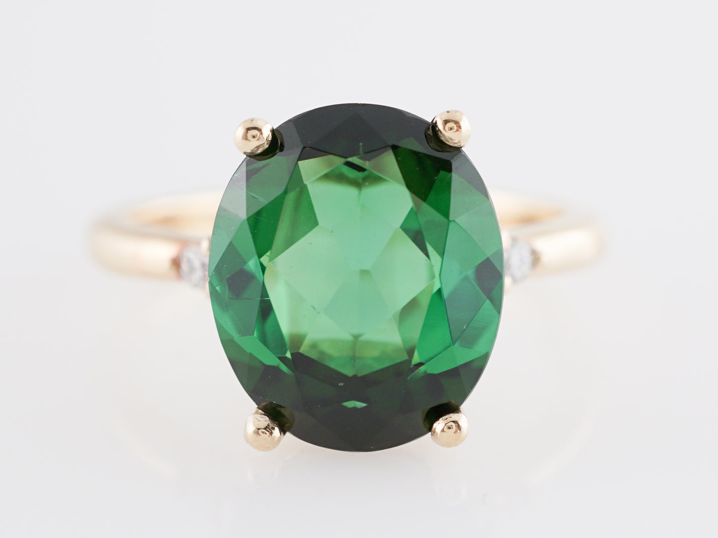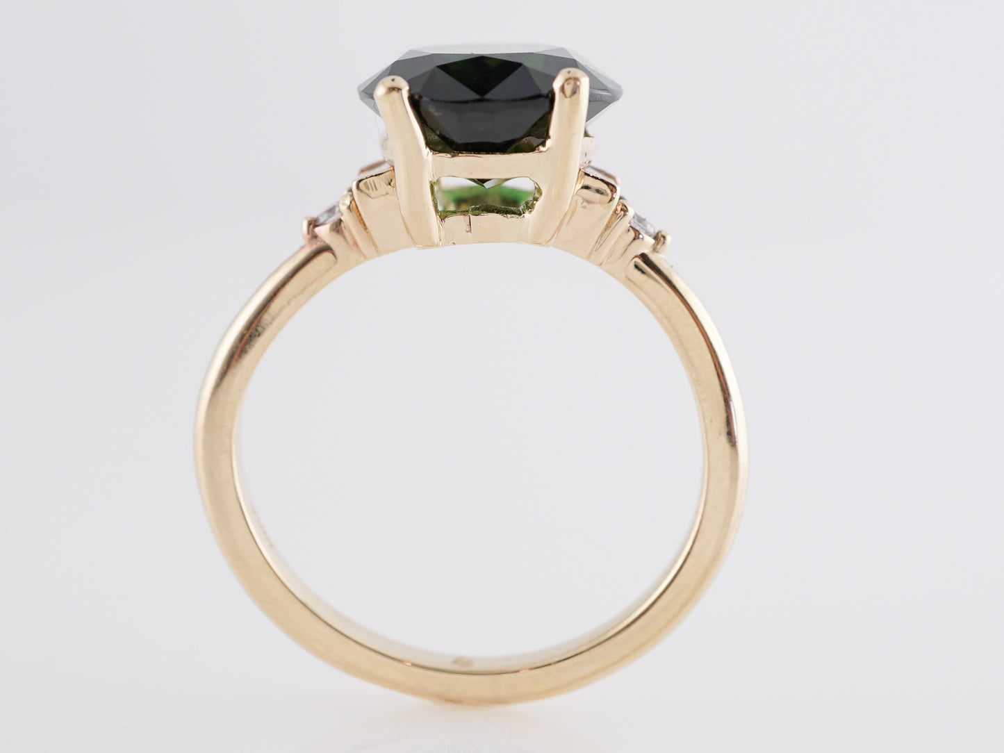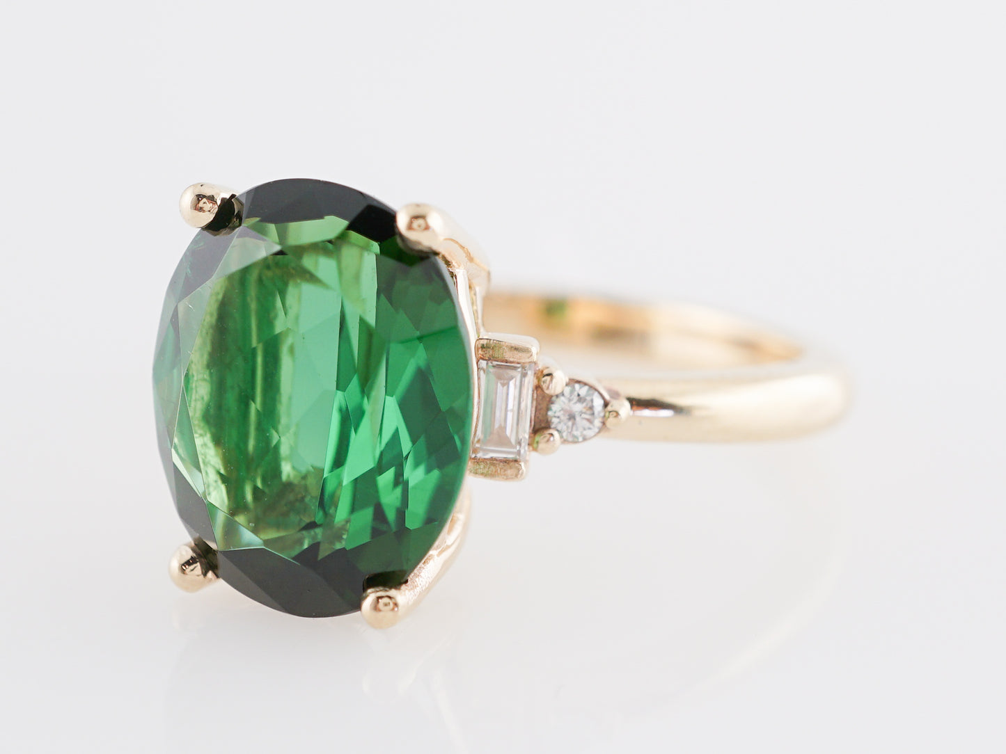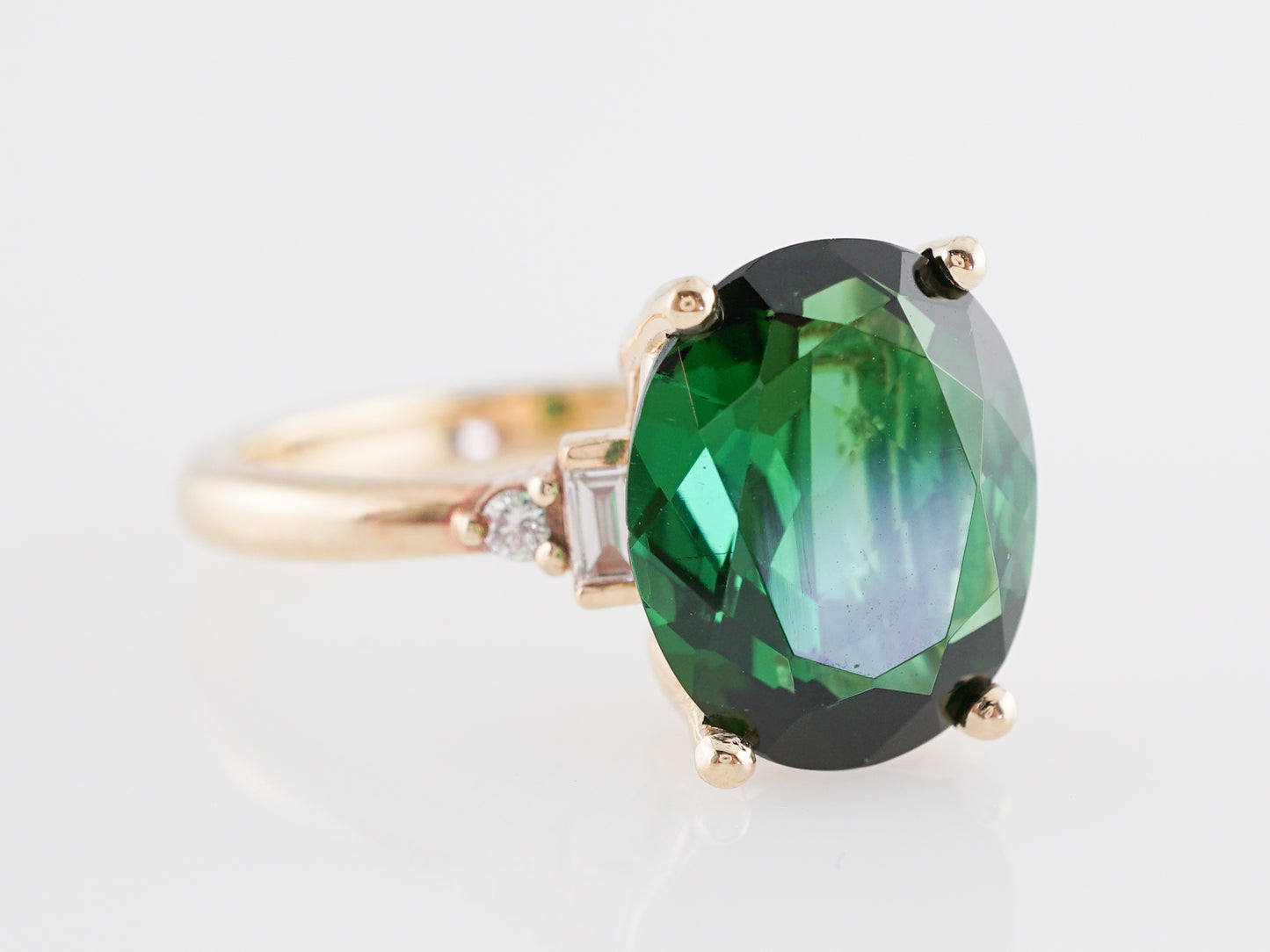 4.27 Oval Cut Tourmaline Engagement Ring in 14k Yellow Gold. This impressive engagement ring features a 4.27 carat green tourmaline in 14k yellow gold. The bright, forest green hues of the tourmaline are cut into an oval shape that bursts with fire and brilliance. The primary stone is prong set and is nestled between two beautiful .055 carat baguette diamonds on either side. Two secondary accent diamonds, each weighing .025 carats finish the elegant shoulders of the head of the band. From the profile, the golden, open work setting features space for the tourmaline to rest in elegant fashion. The band is polished, strong, and comfortable to wear. Reaching 6.88 mm above the finger and weighing a total of 4.6 grams, this breathtaking engagement ring is a modern classic!