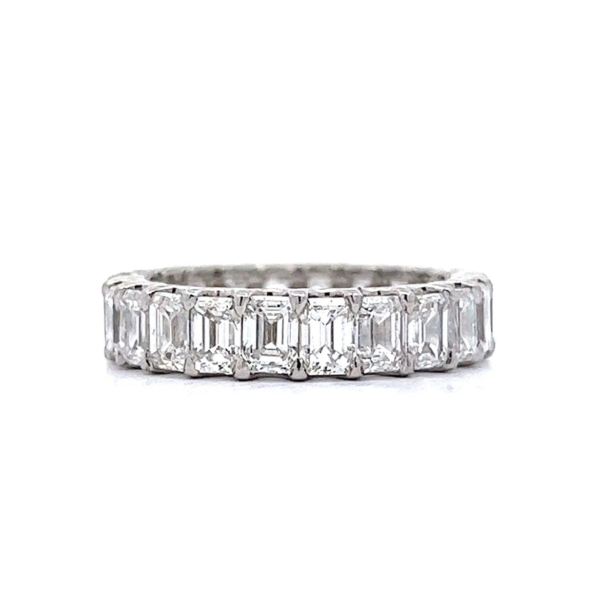 This enchanting eternity ring features 4.39 carats of emerald cut diamonds finished in platinum. Twenty-two (22) .199 carat near colorless diamonds are set around the entire ring. Set in shared platinum prongs, this stylish 4.39mm wide band would look lovely with many modern engagement ring designs. The band can also function as a stackable right hand ring.