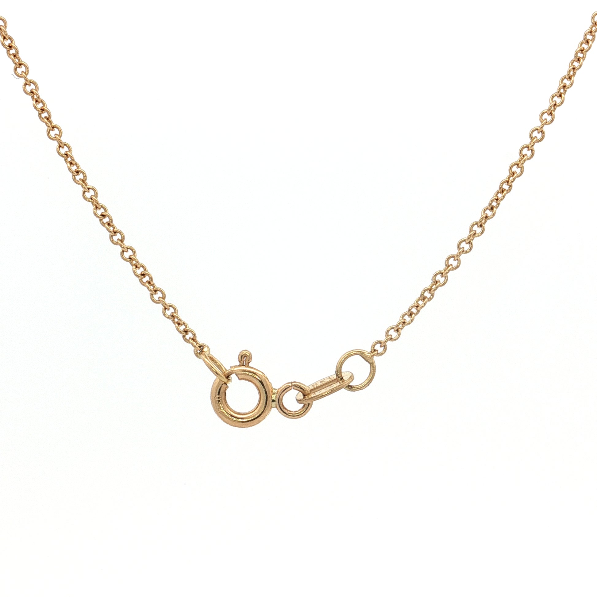An 18.5-inch cable chain with a spring ring clasp suspends the pendant at a length that works well for layering or wearing alone.