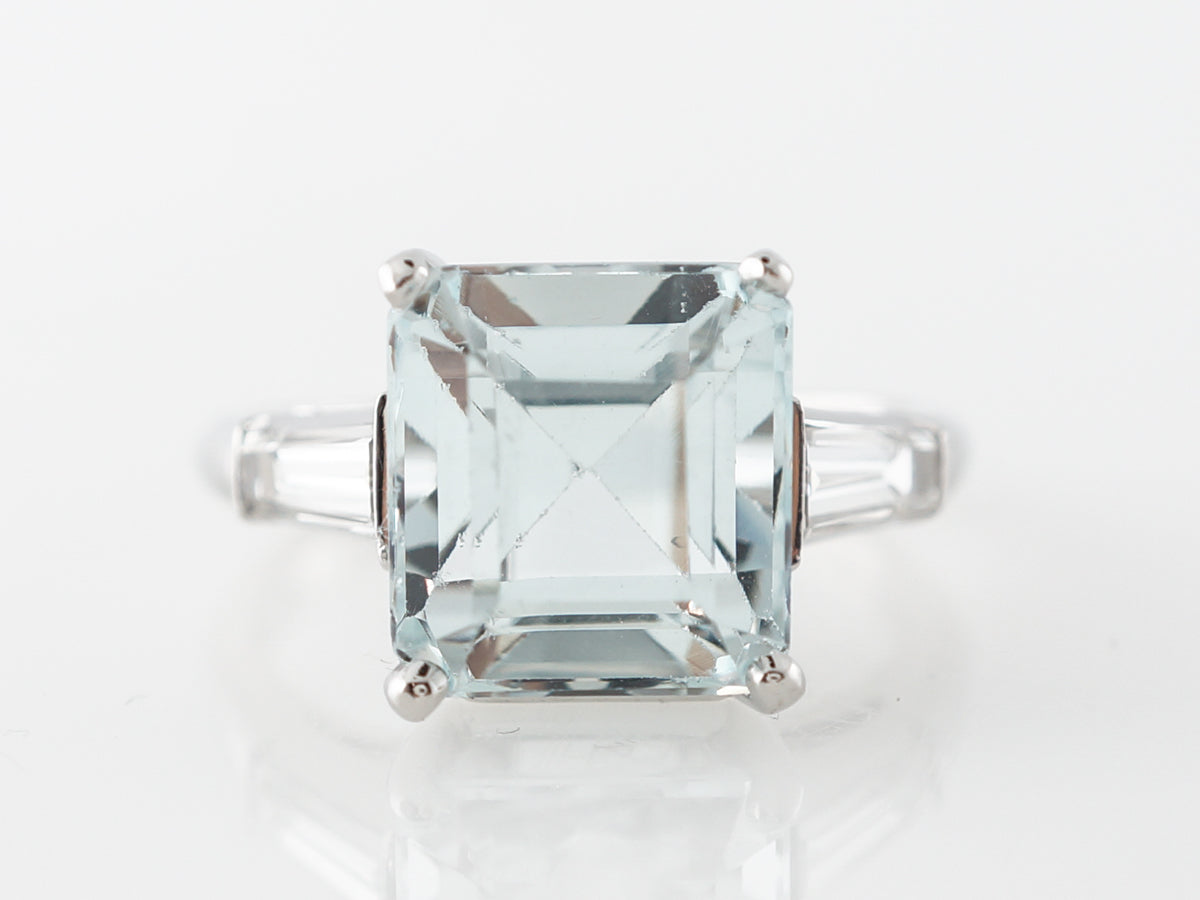 4 Carat Aquamarine Cocktail Ring w/ Diamonds in Platinum. This modern square cut aquamarine cocktail ring features a 4 carat aquamarine that is accented by two (2) baguette diamonds and finished in platinum. The 4 carat aquamarine is a perfect size for someone who wants a beautiful colored stone that has plenty of presence but is still understated. This is a fabulous right hand ring that you will love and cherish!