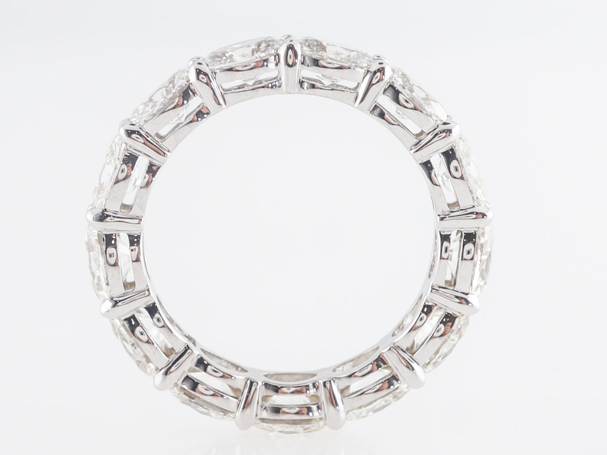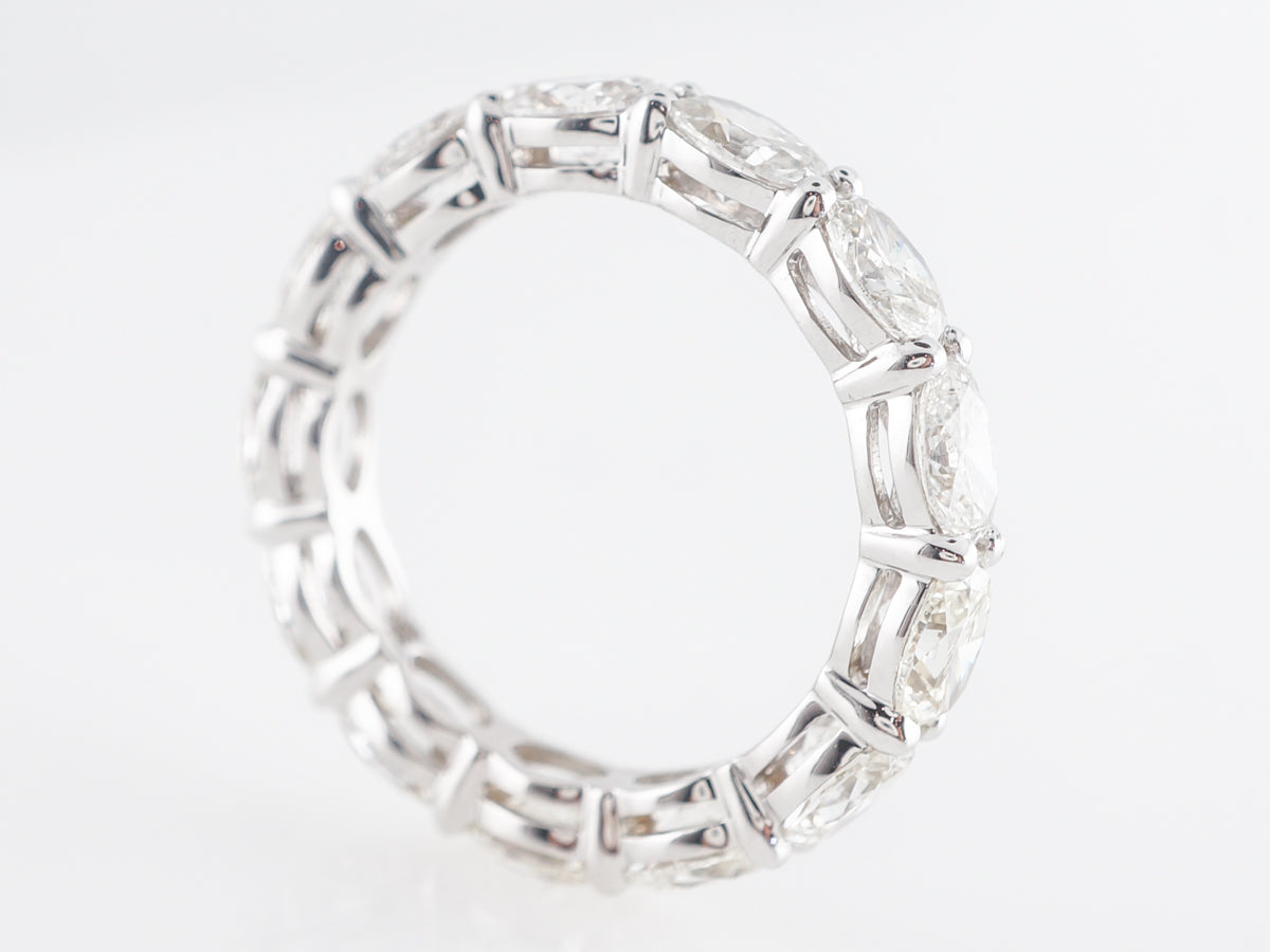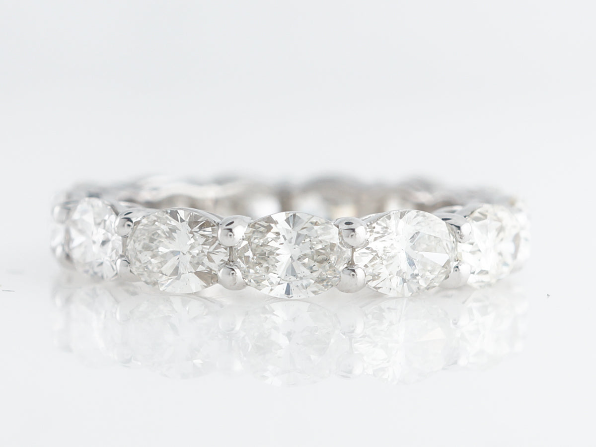 4 Carat Diamond Wedding Band in 18k White Gold. This eternity band features 4.28 carats of oval cut diamonds and is set in 18 karat white gold. The stones are set with large shared beads that nicely enhance their whiteness. This would be a statement piece on your right hand or could be a fabulous addition to an engagement ring.