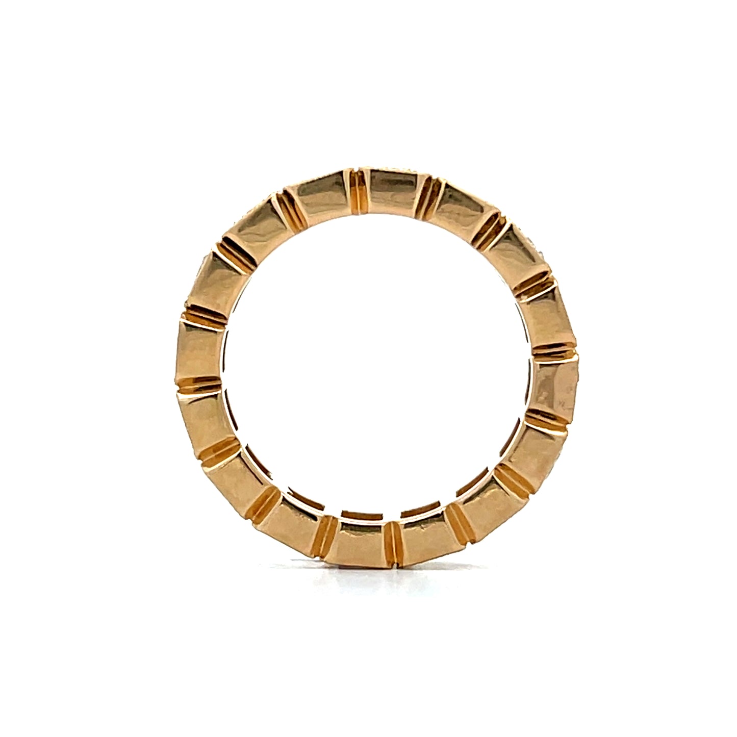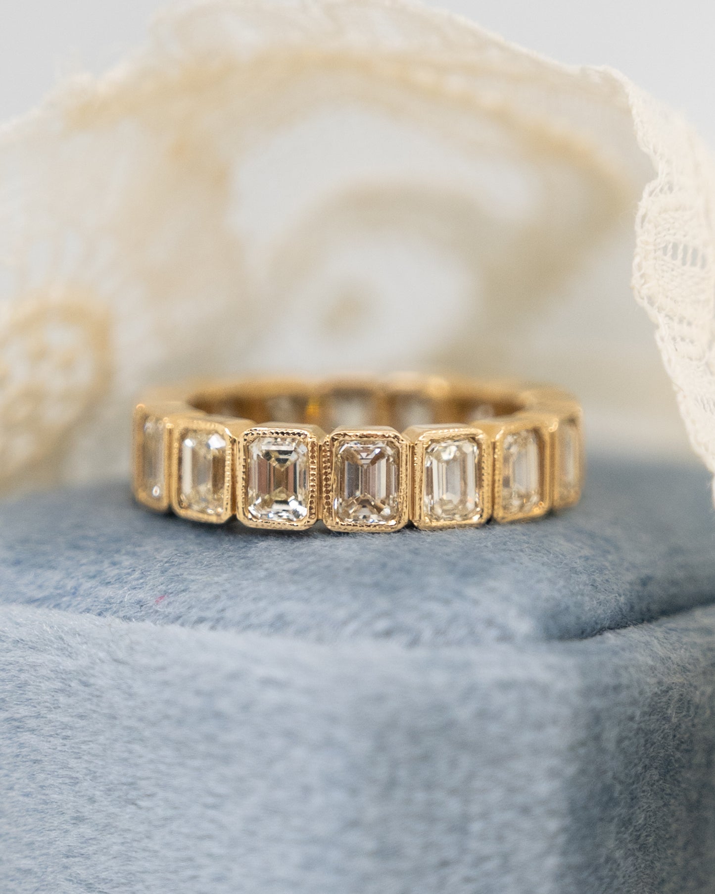 This modern diamond eternity band is made from 14 karat yellow gold with 16 bezel-set emerald cut diamonds. The diamonds total 4.00 carats with an H color and VS1-VS2 clarity, creating plenty of sparkle as they catch the light. The band features decorative milgrain edge details that add an older-style element to the newer overall design. The combination of bright yellow gold and white diamonds creates a strong visual contrast that draws attention to the hand.