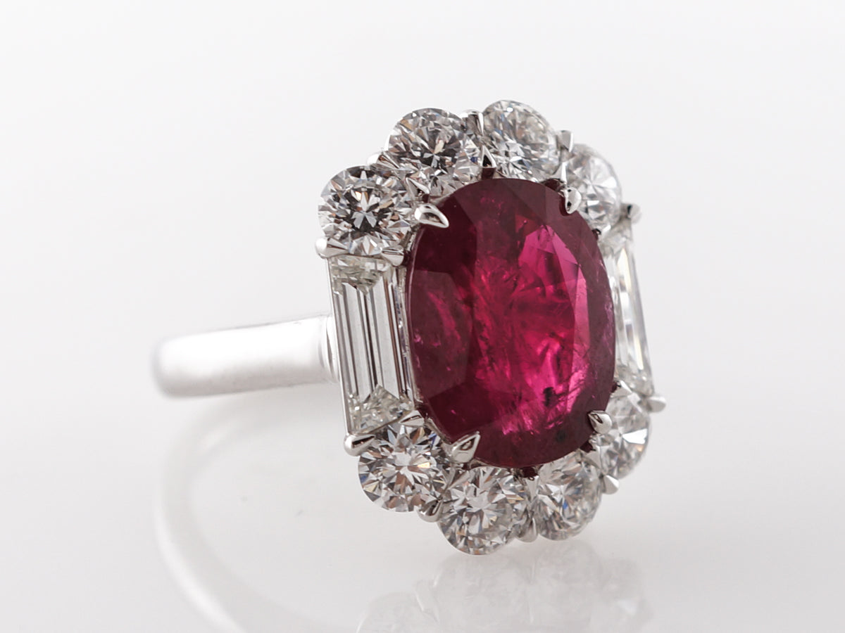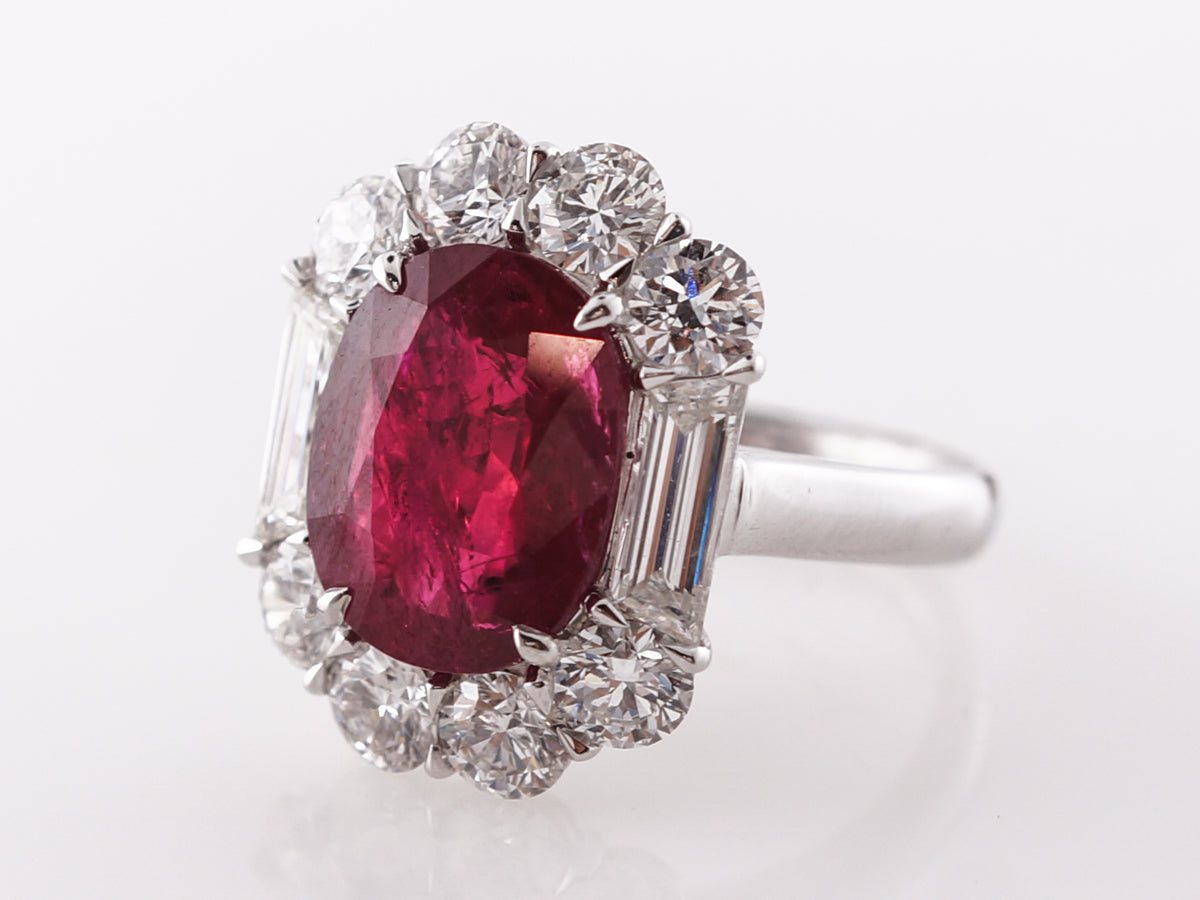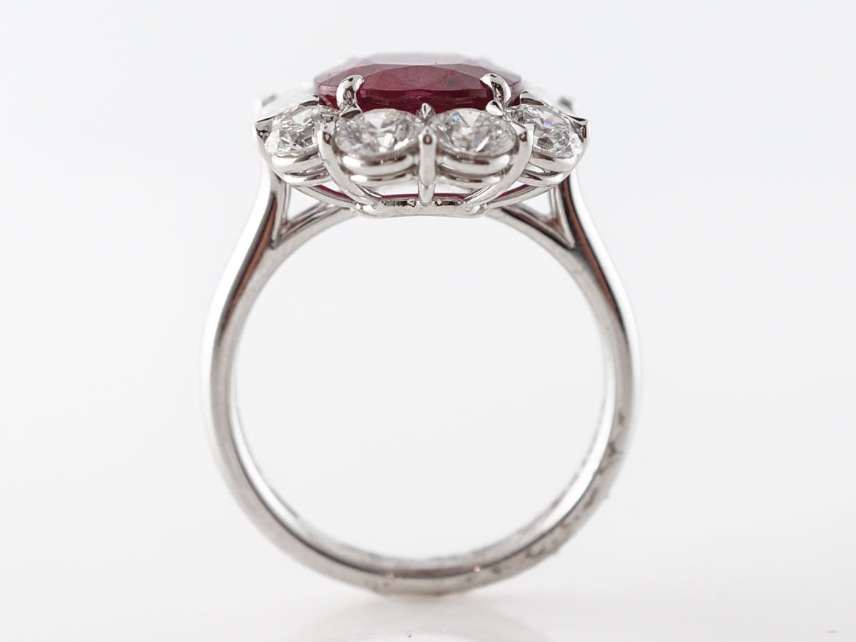 4 Carat Ruby Diamond Cocktail Ring in Platinum. This fabulous cocktail ring features an amazing 4.45 carat oval shaped ruby that is accented by 2.56 carats of diamonds. The accent stones in this ring contain eight (8) Round Brilliant Cut and two (2) Trapezoid Cut diamonds to complete a gorgeous dynamic of red and white. The ruby is prong set in platinum, which gives this ring another slight contrasting element of the deep red color. This fine piece will be a staple in any jewelry collection!