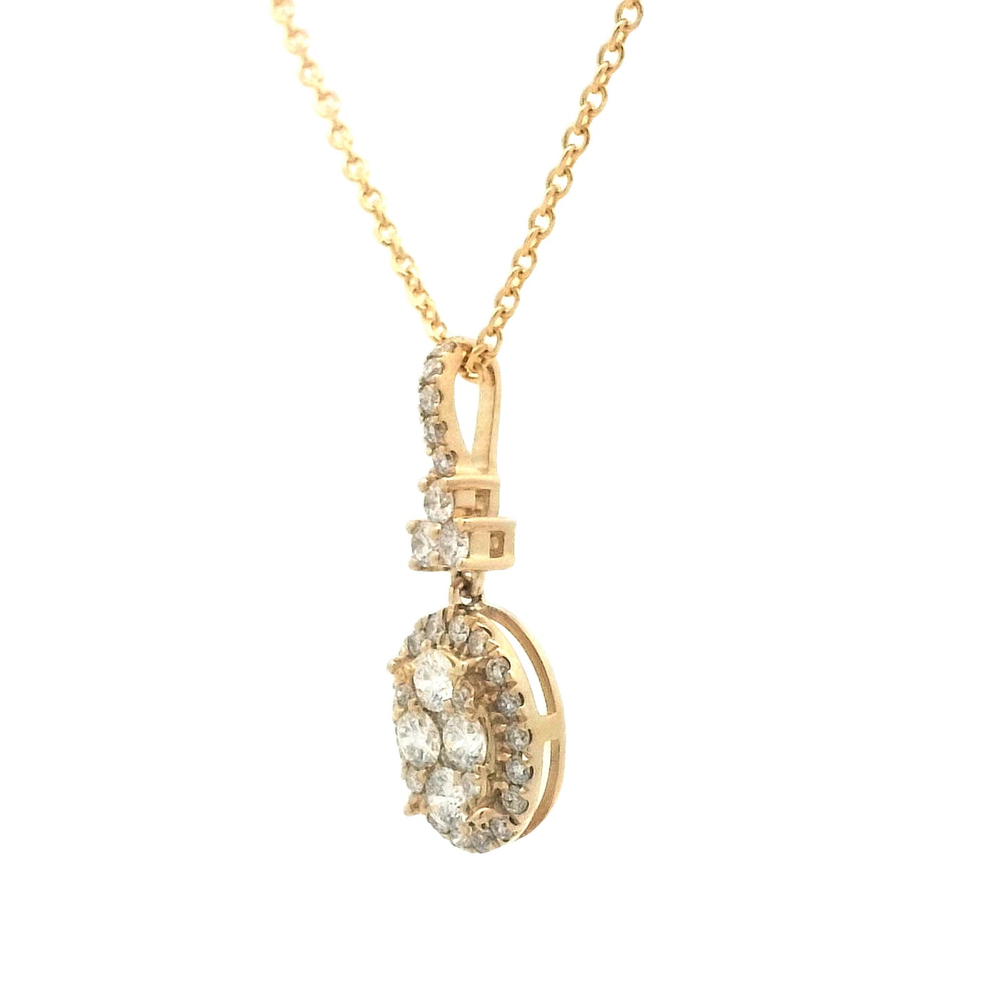 This modern diamond pendant necklace features a stunning design crafted in 14 karat yellow gold. At the center of the piece is dazzling G color, VS2 clarity round brilliant cut diamonds. The diamonds are set in a glittering cluster, creating a gorgeous effect. Additional diamonds of graduated sizes add a second layer of sparkle and combine with the yellow gold for a truly beautiful piece. This necklace can be dressed up or down, making it quite versatile.