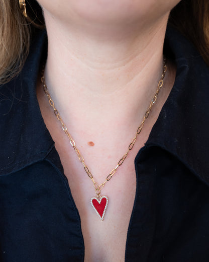 This pendant necklace features a red enamel heart on a 14 karat yellow gold paperclip chain that adjusts from 16 to 18 inches. The heart pendant has 40 round brilliant cut diamonds (1.2 mm each) surrounding it, with a total weight of .35 carats, H color grade, and I1 clarity. Each diamond weighs about .09 carats and creates a nice contrast against the bright red heart. The gold chain and colorful heart combo gives this necklace a fun look that stands out from regular jewelry. You can slide the chain to change its length depending on how you want to wear it.