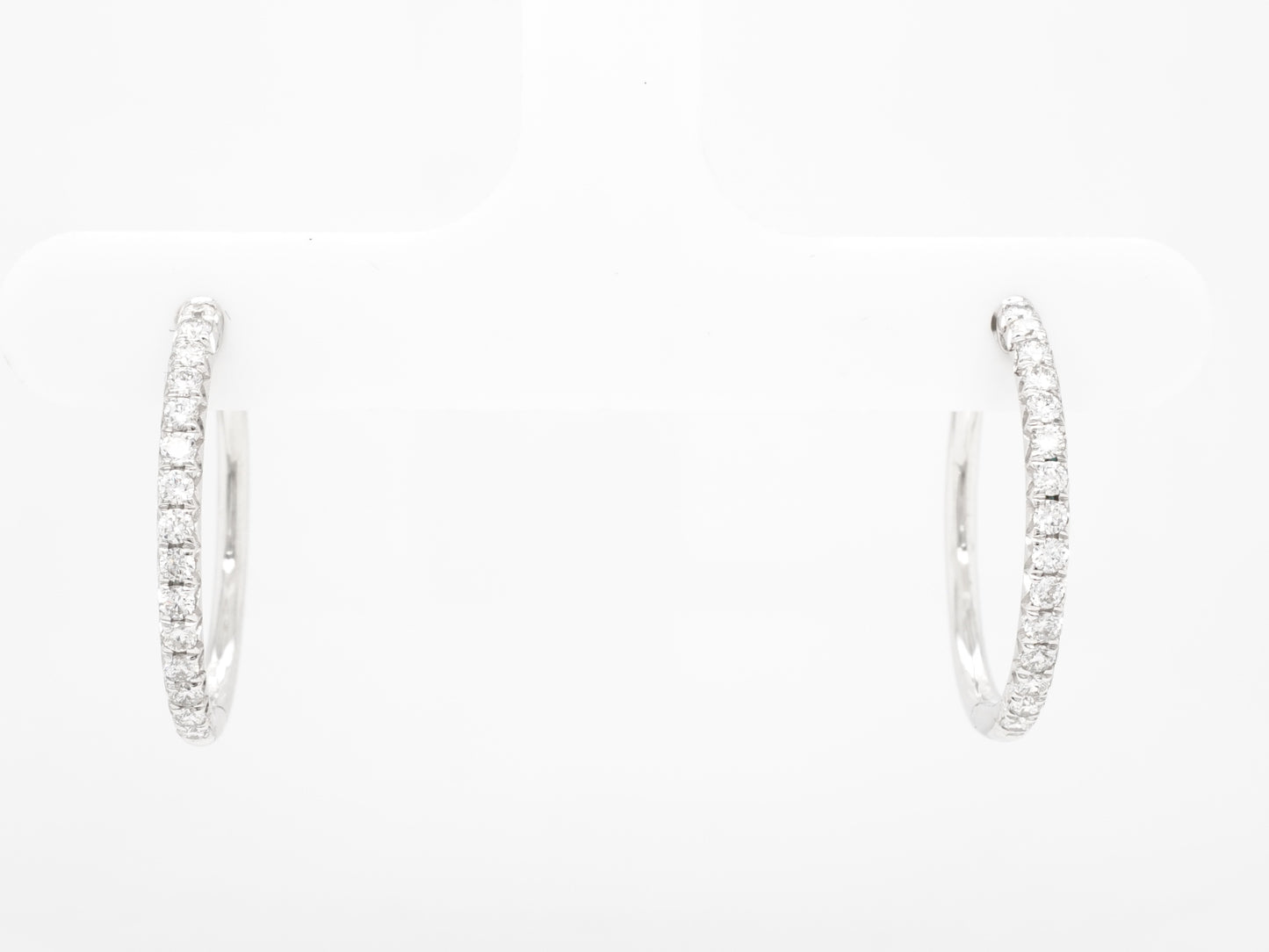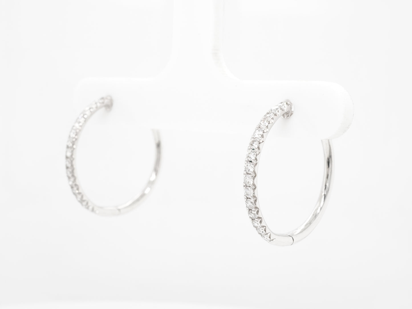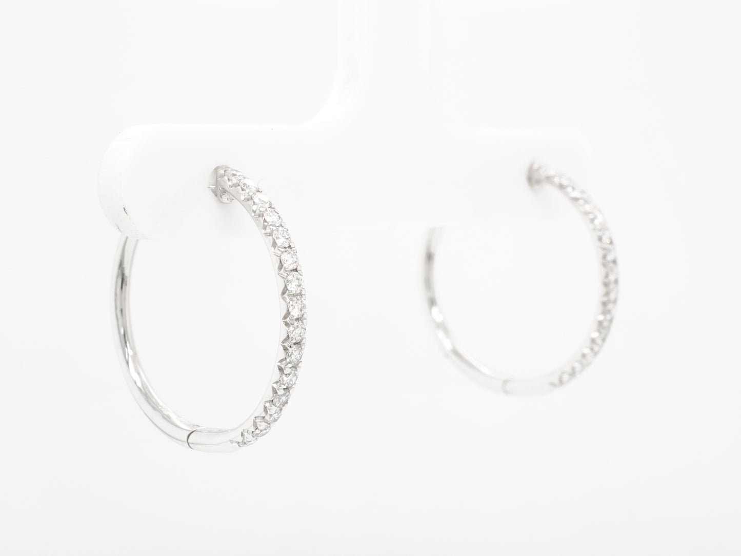 .40 Small Diamond Hoop Earrings in 18k White Gold. These diamond hoop earrings feature .40 carats of natural diamonds in shimmering 18k white gold. Thirty (30) .013 carat diamonds are mounted around the petite hoops. Sleek and modern, these hoops will be the eye-catching addition you need in your jewelry collection!