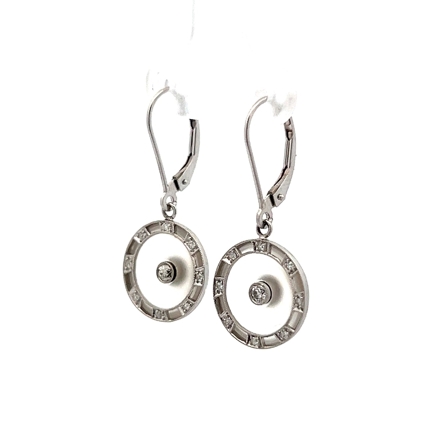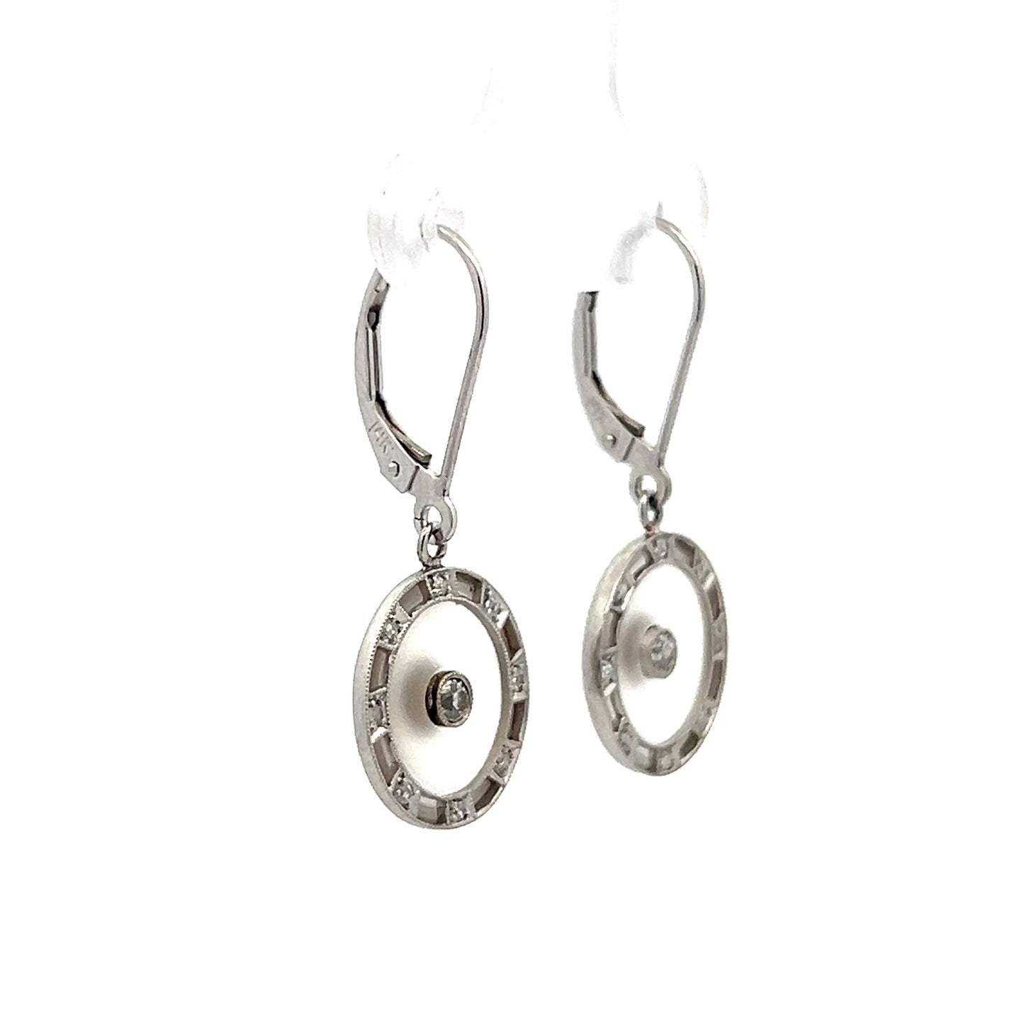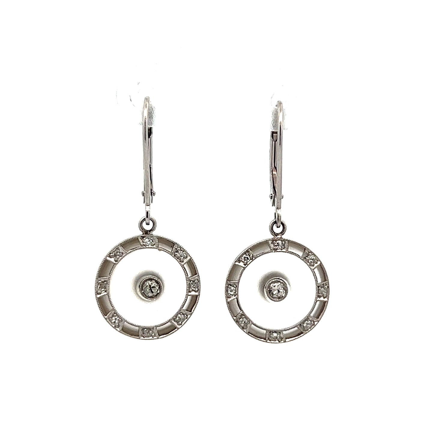 These Art Deco drop earrings are crafted in 14 karat white gold, featuring a classic design with intricate detailing. Each earring centers around a bezel set round diamond weighing .08 carats, with SI1 clarity and H color. The central diamond is surrounded by 8 accent diamonds, each measuring 1.75mm and totaling .32 carats, set around the outer edge. The earrings also feature milgrain detailing and delicate camphor glass, adding to their vintage appeal. The combination of these elements showcases the meticulous craftsmanship of the Art Deco era, making these earrings a remarkable piece of antique jewelry.