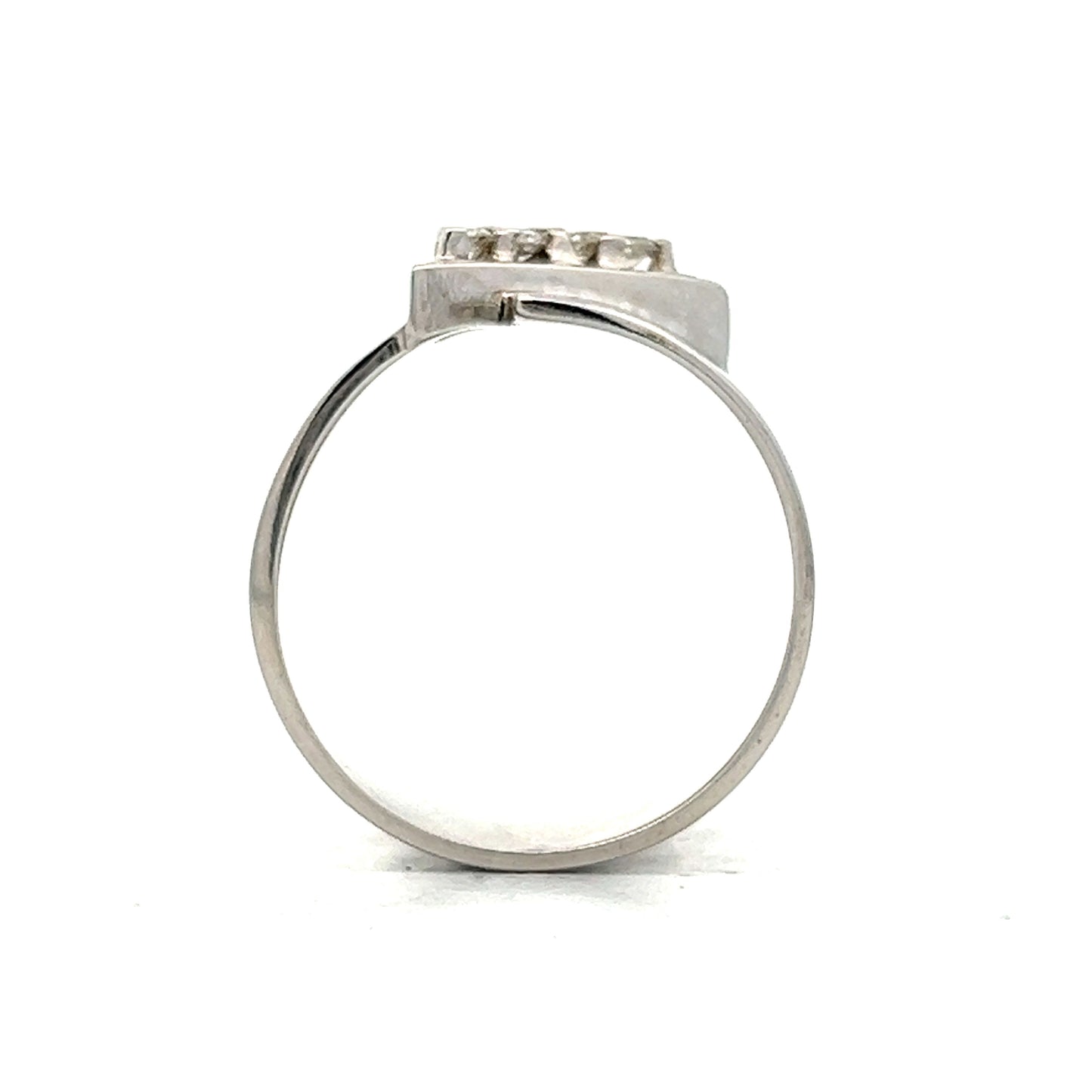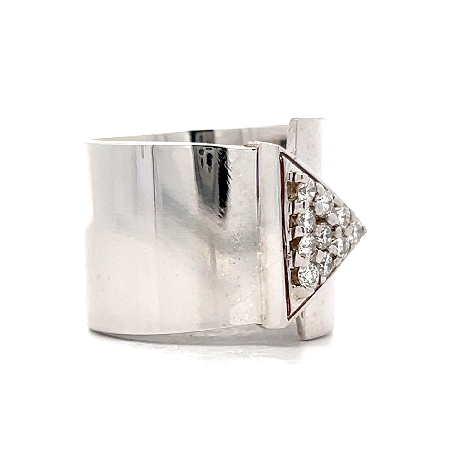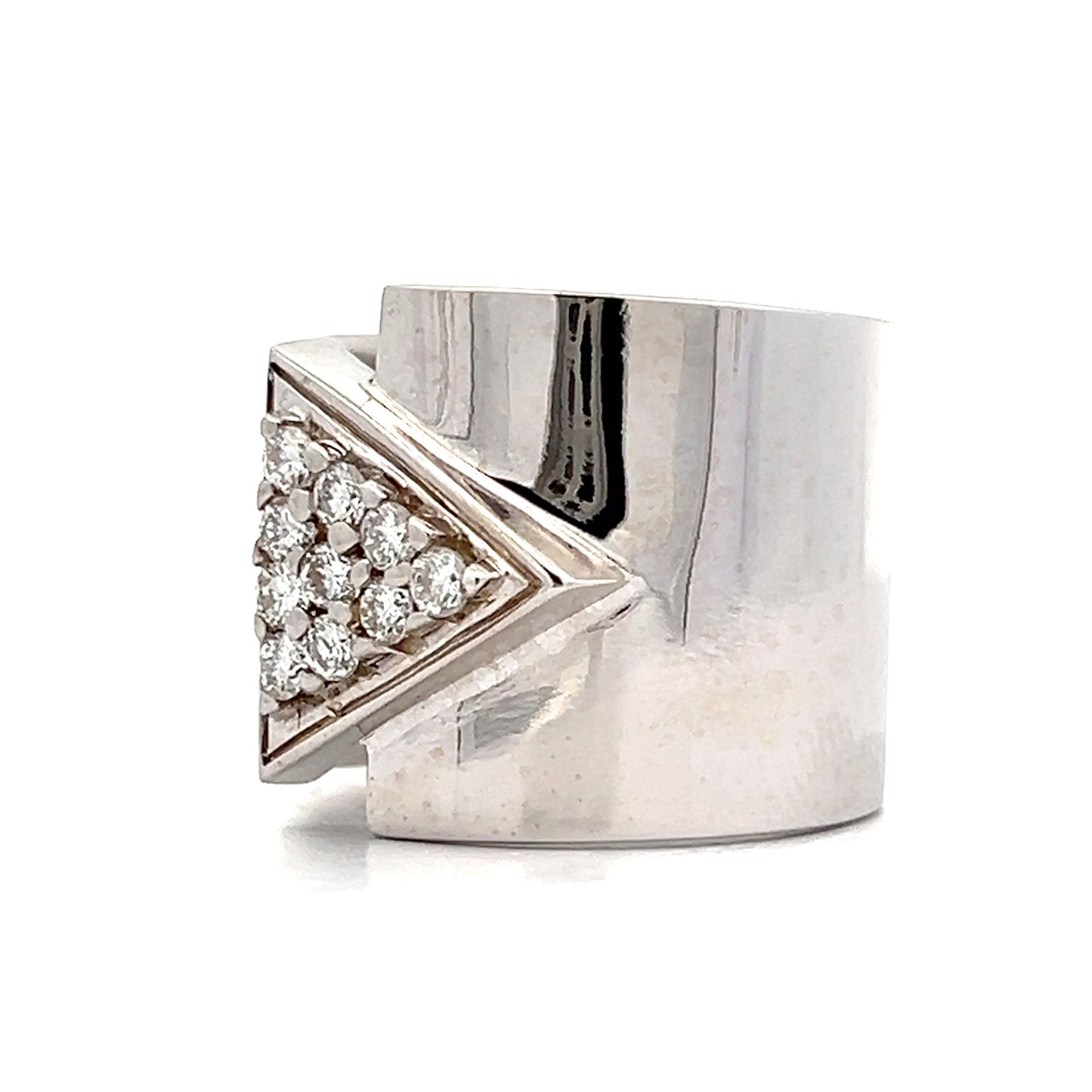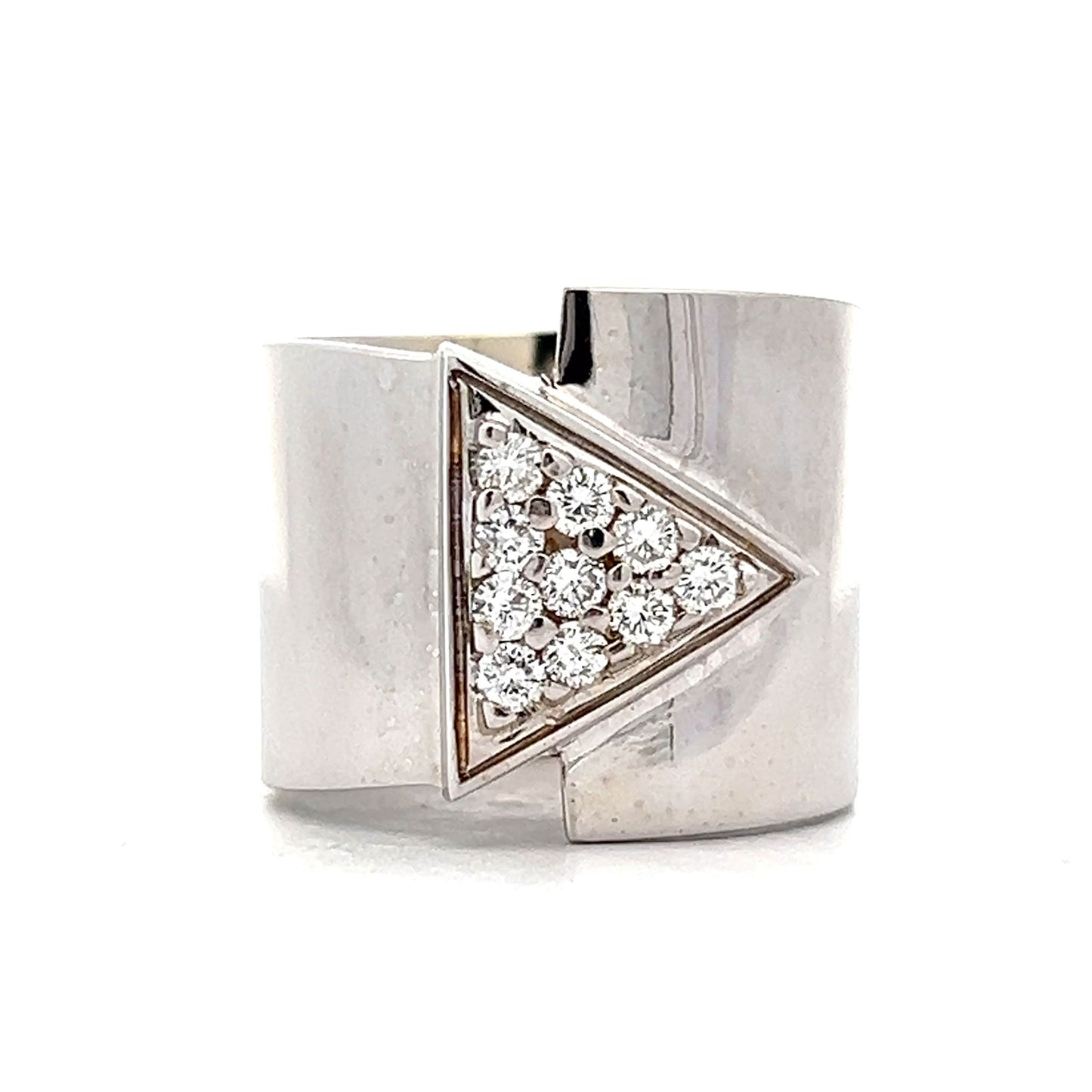Shine with this modern cocktail ring, crafted in 18 karat white gold. The focal point of the wide band is adorned with a pave of F colored round brilliant diamonds, forming an elegant triangle pattern that enhances the design. The polished white gold finish complements the diamonds beautifully, perfect for adding a touch of sparkle to any ensemble.