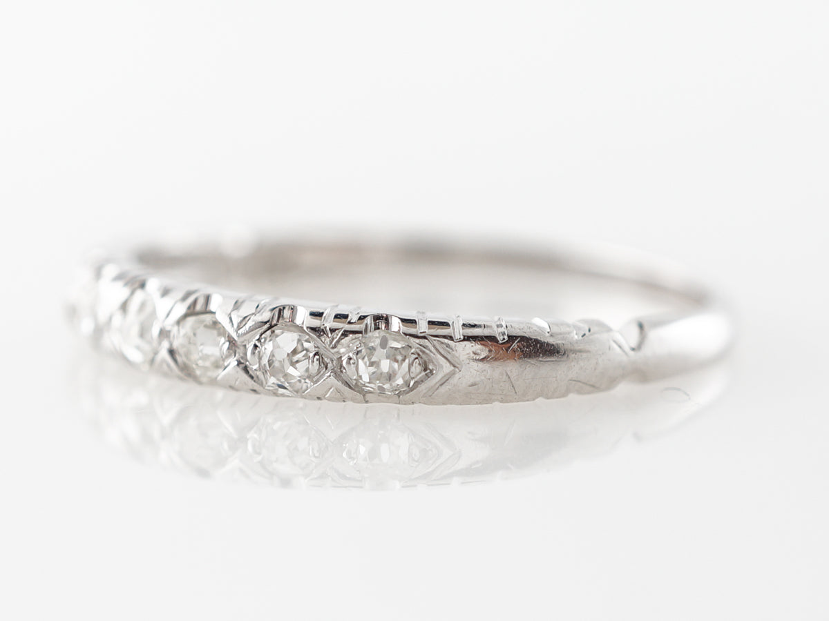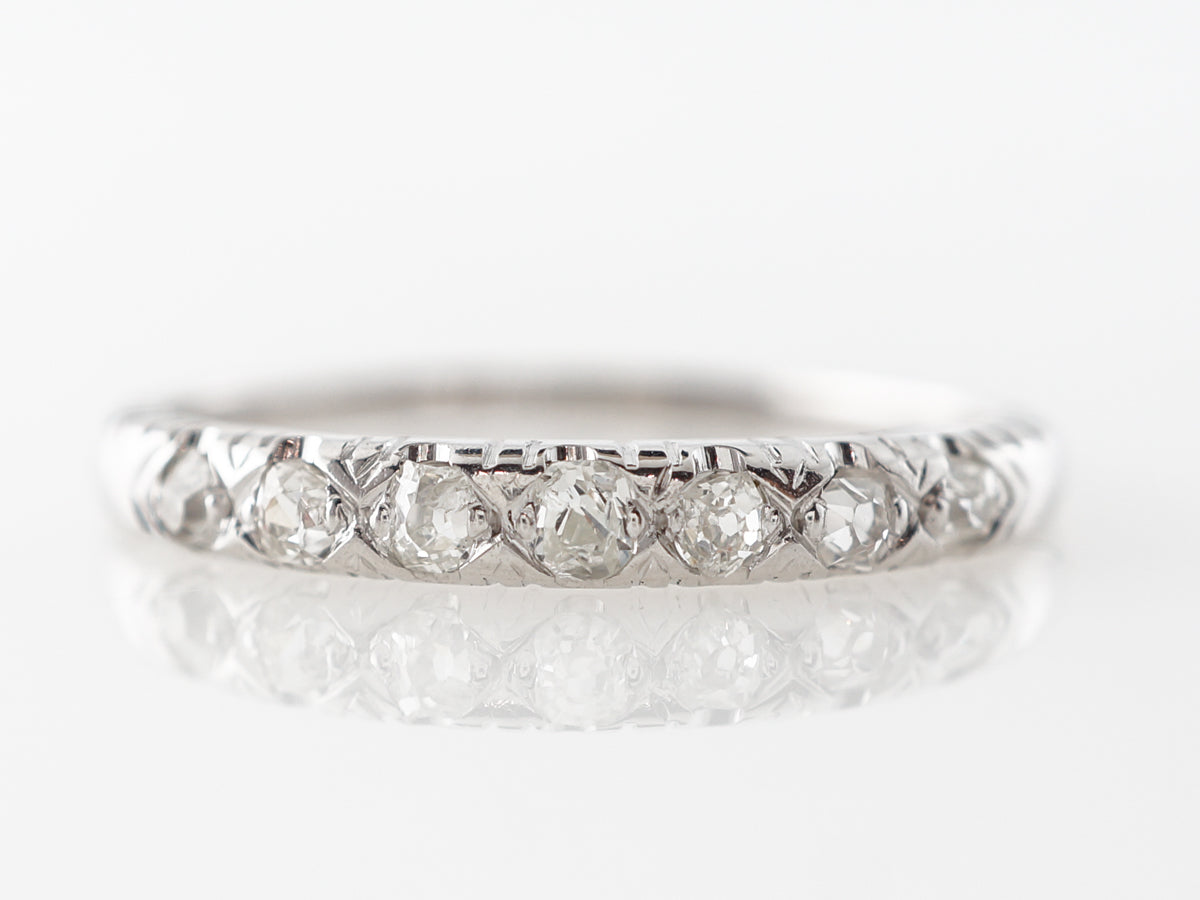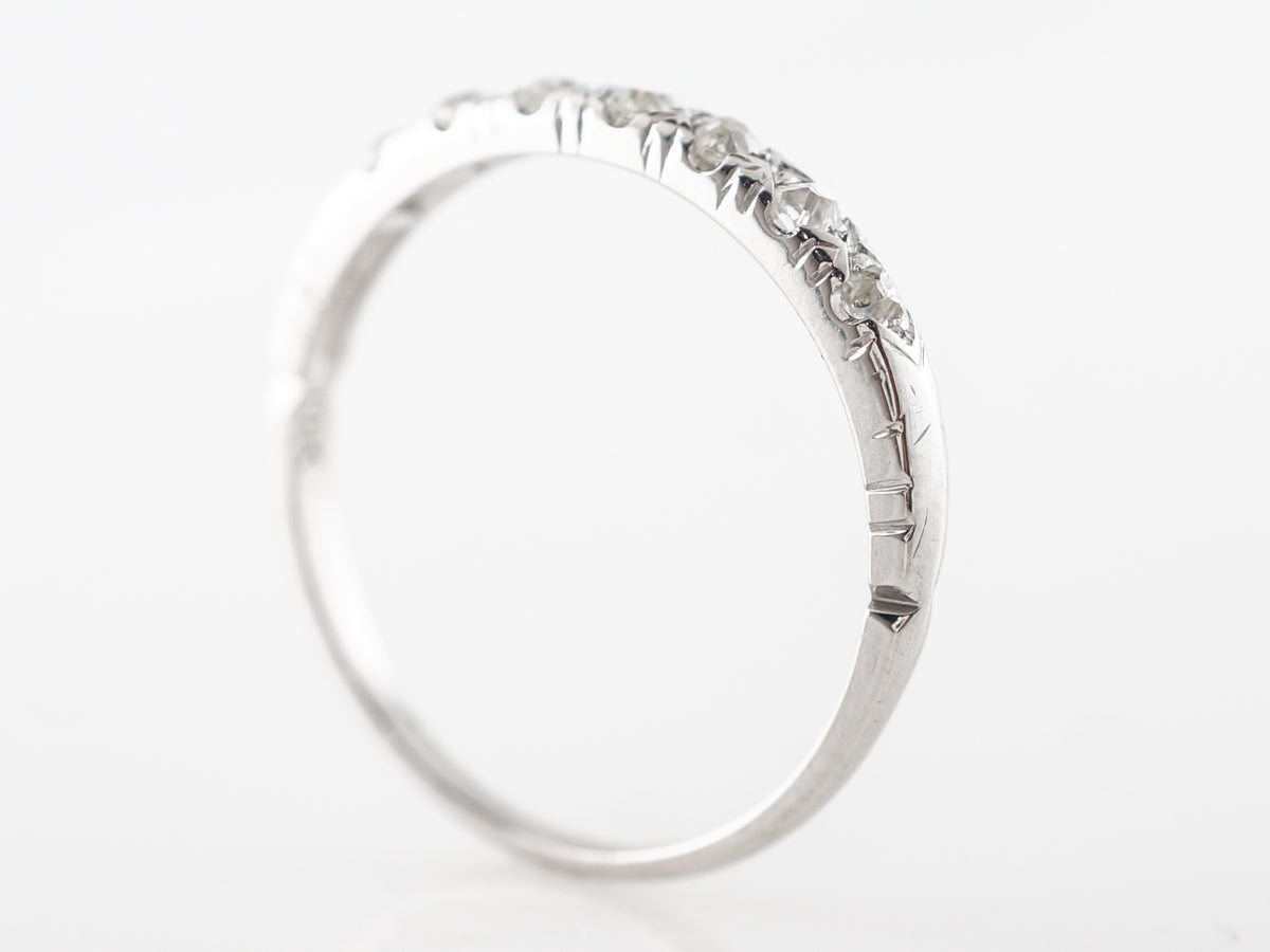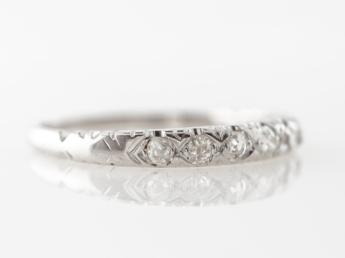 .42 Carat Antique Diamond Wedding Band White Gold. This fine antique diamond wedding band features .42 carats of diamonds running across the top half of the ring in 14 karat white gold. The band also features engraving along the sides of where the diamonds are set.