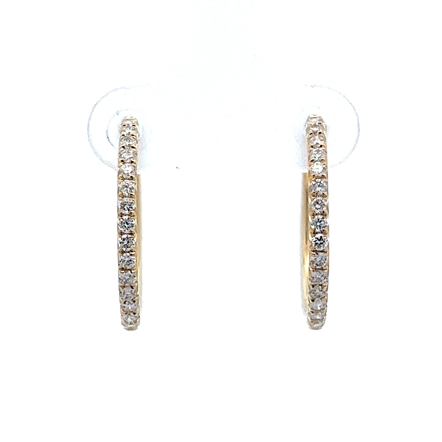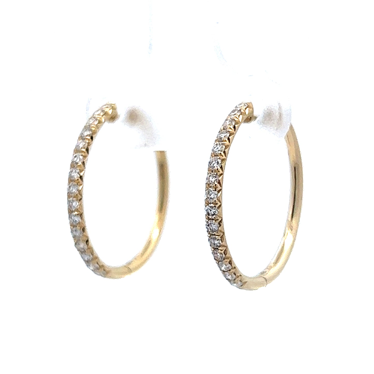 .42 Diamond Hoop Earrings in 14K Yellow Gold. These romantic hoop earrings feature .42 carats of sparkling diamonds in polished 14 karat yellow gold. Curving halfway around the hoops, thirty (30) .014 carat diamonds gives an undeniable brilliance to the warm yellow gold structure. The diamonds are near colorless and set in delicate French V split prongs. The perfect every day hoops with a little extra sparkle!