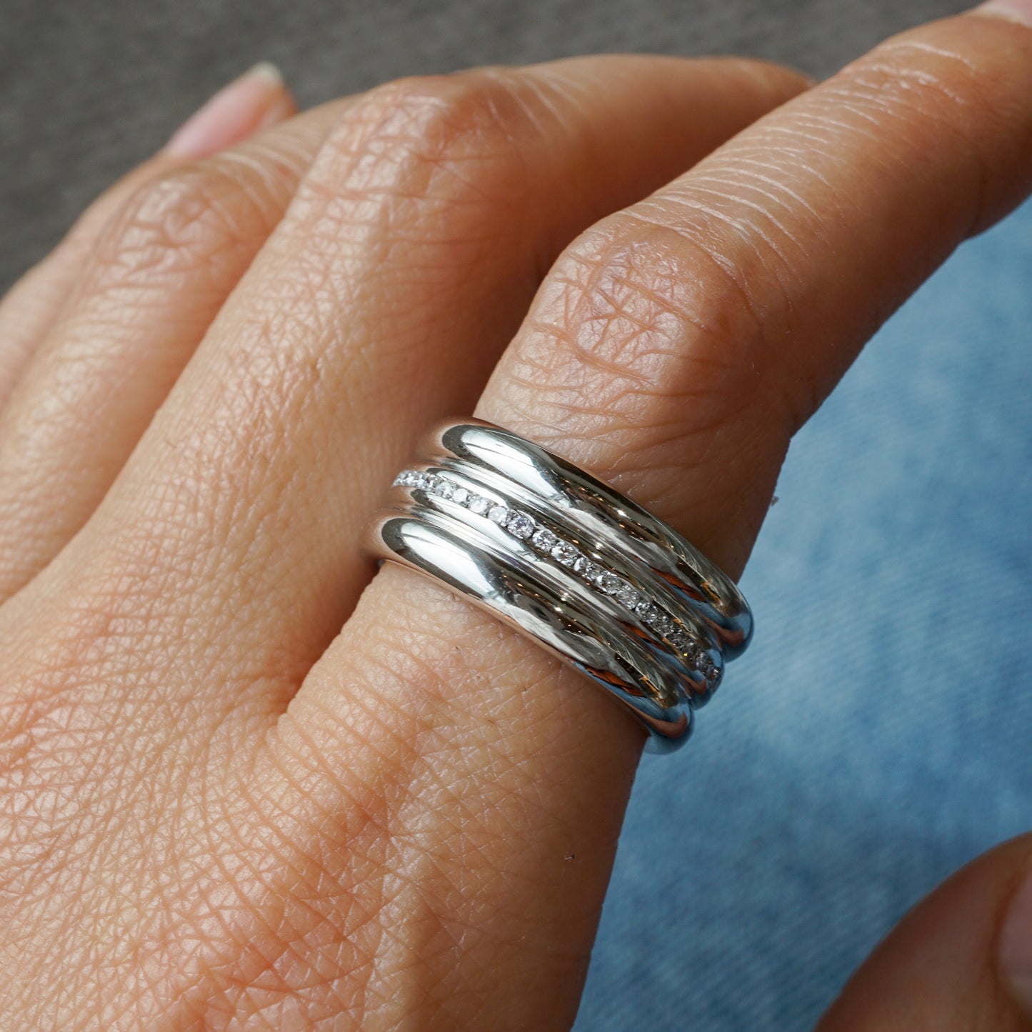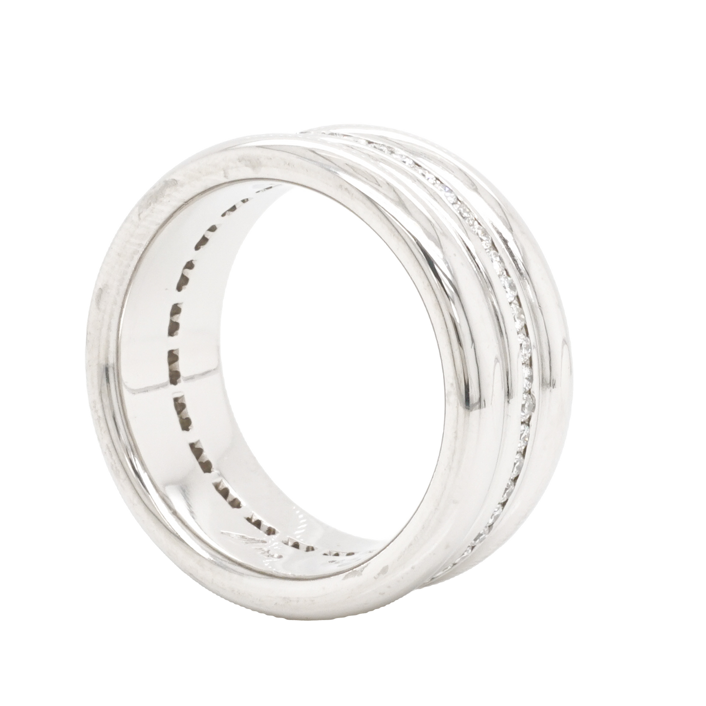 .42 Diamond Eternity Right Hand Ring in Platinum. This modern right hand ring features .42 carats of diamond on a shimmering platinum band. An eternity ring with style, this band features fifty (50) colorless diamonds, each weighing .0084 carats. The diamonds are channel set in the center of a 9.09mm wide ring. The ring is stamped with “PLAT” indicating that it is platinum.