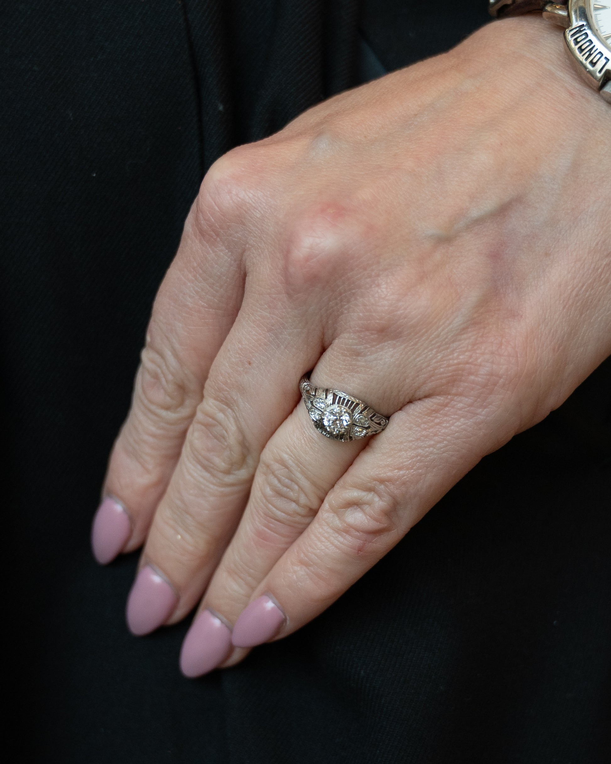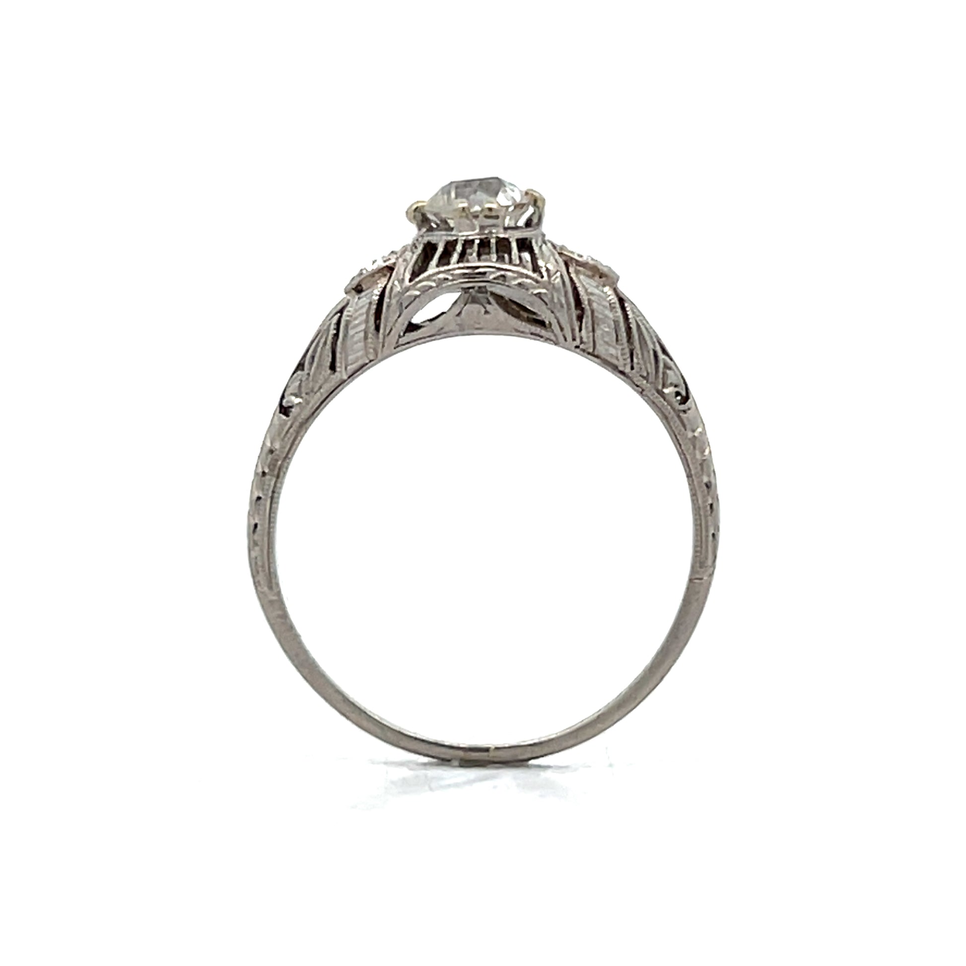 This platinum Art Deco era engagement ring features a .43 carat old European cut diamond with G color and SI2 clarity, plus four single cut accent diamonds measuring 1.5mm each and totaling .06 carats. The ring has intricate filigree work characteristic of the Art Deco period and chevron engraving on the shoulders. A wonderful example of an original antique Art Deco engagement ring.