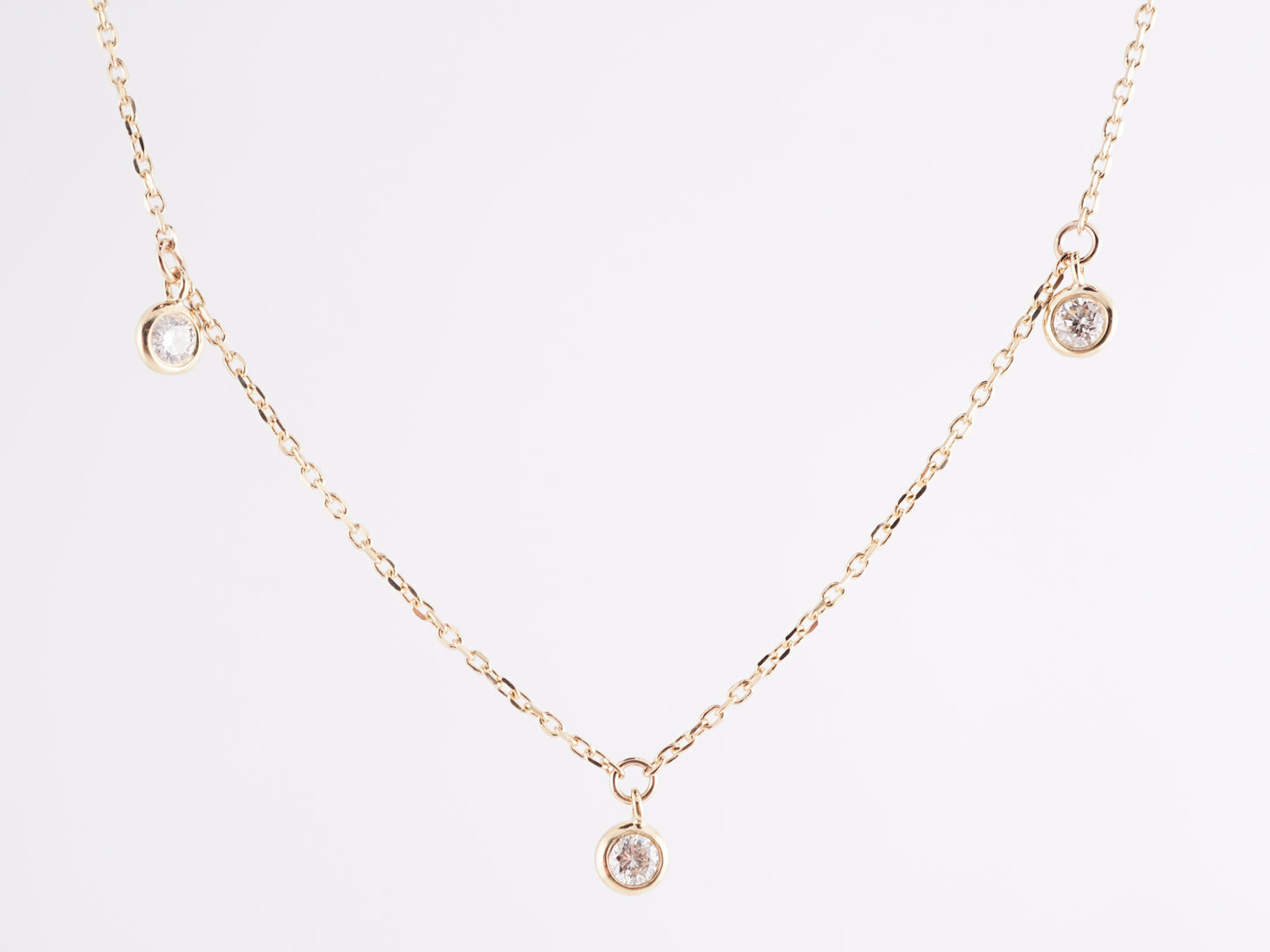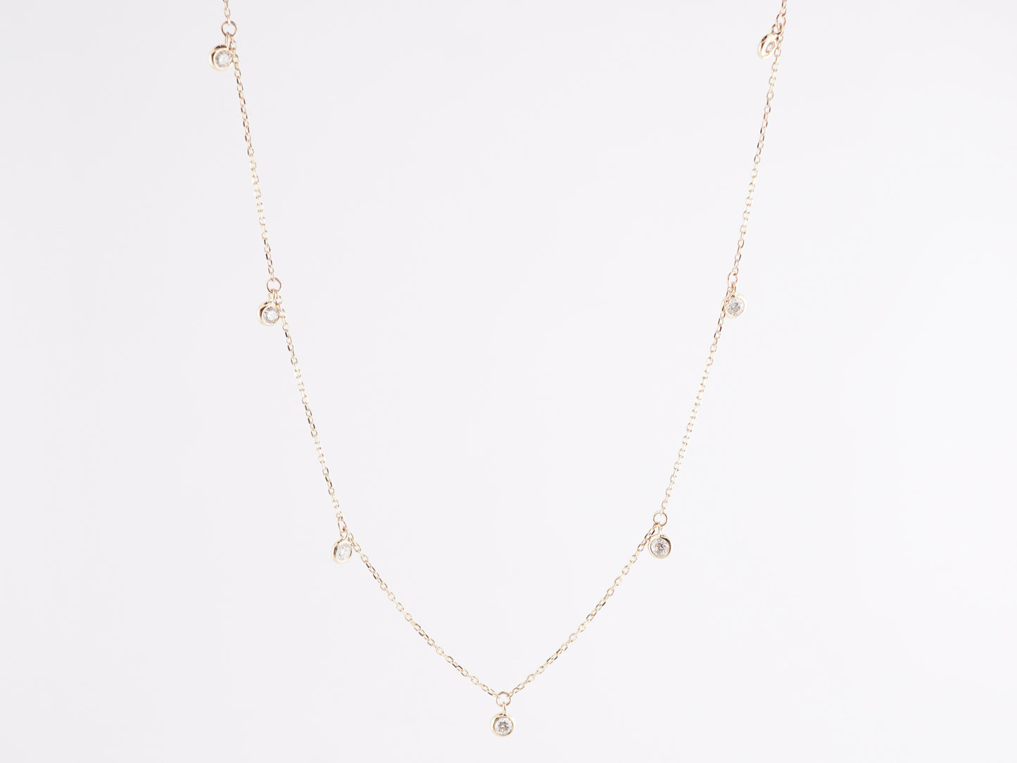 .43 Bezel Set Diamond Necklace in 14K Yellow Gold. This 17” bezel set diamond necklace features seven .061 carat diamonds in 14k yellow gold. Connected by a classic chain link necklace, each diamond in this modern necklace drops slightly below the chain for a bit of movement along the décolletage. This stunning necklace is a brilliant piece of jewelry for the new summer weather!
