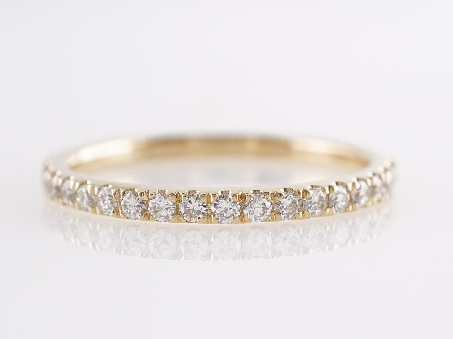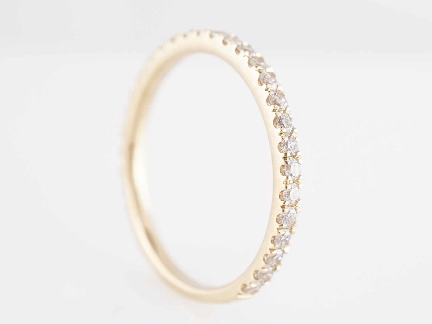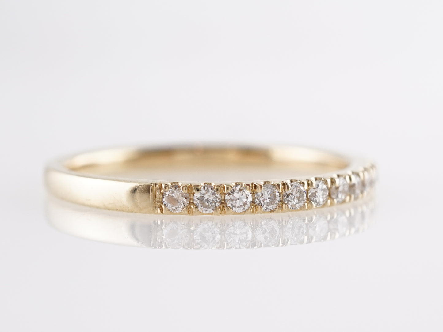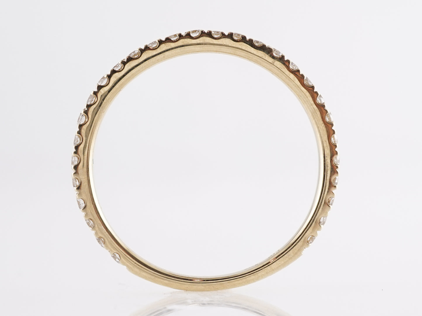 .43 Thin Diamond Wedding Band in 14k Yellow Gold. This diamond wedding band features .43 carats of natural diamonds in warm 14k yellow gold. Twenty-nine (29) .015 carat diamonds are aligned in perfect symmetry and stretch halfway around the band. The near-colorless diamonds are set in surface prongs of 14k yellow gold.