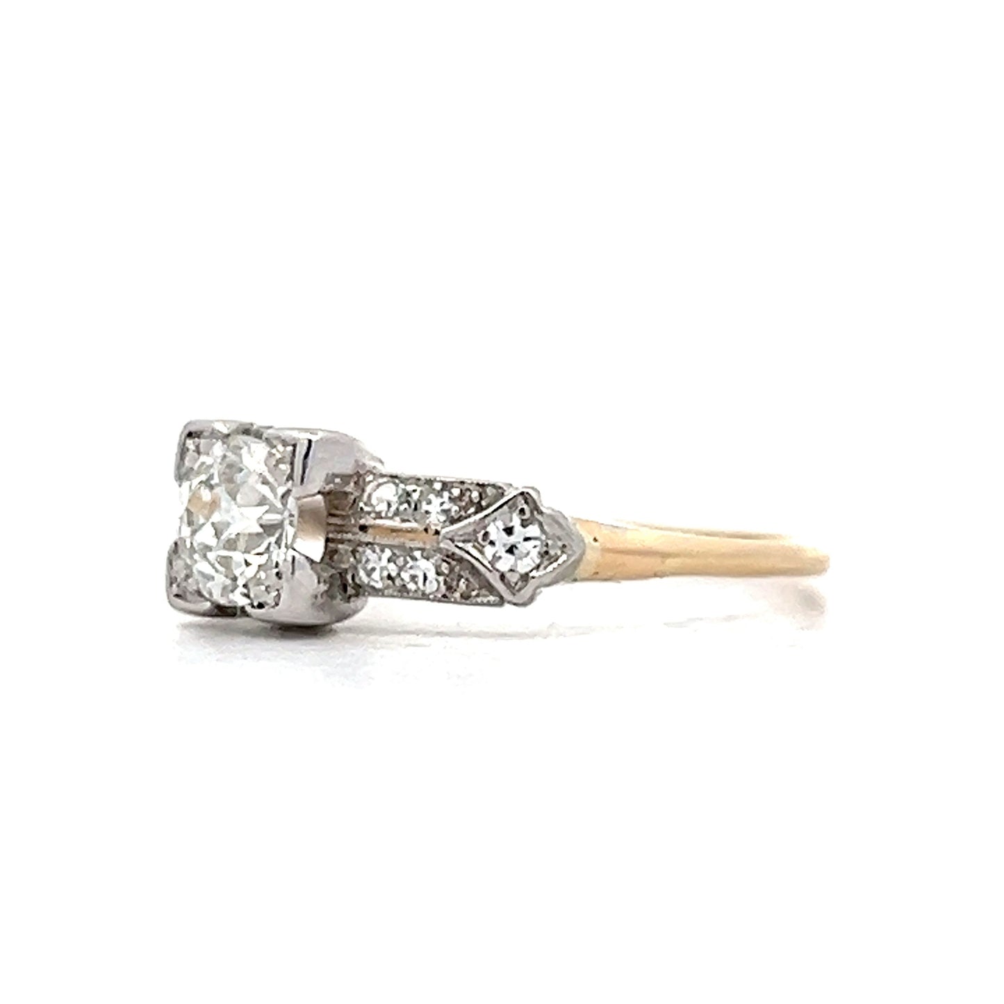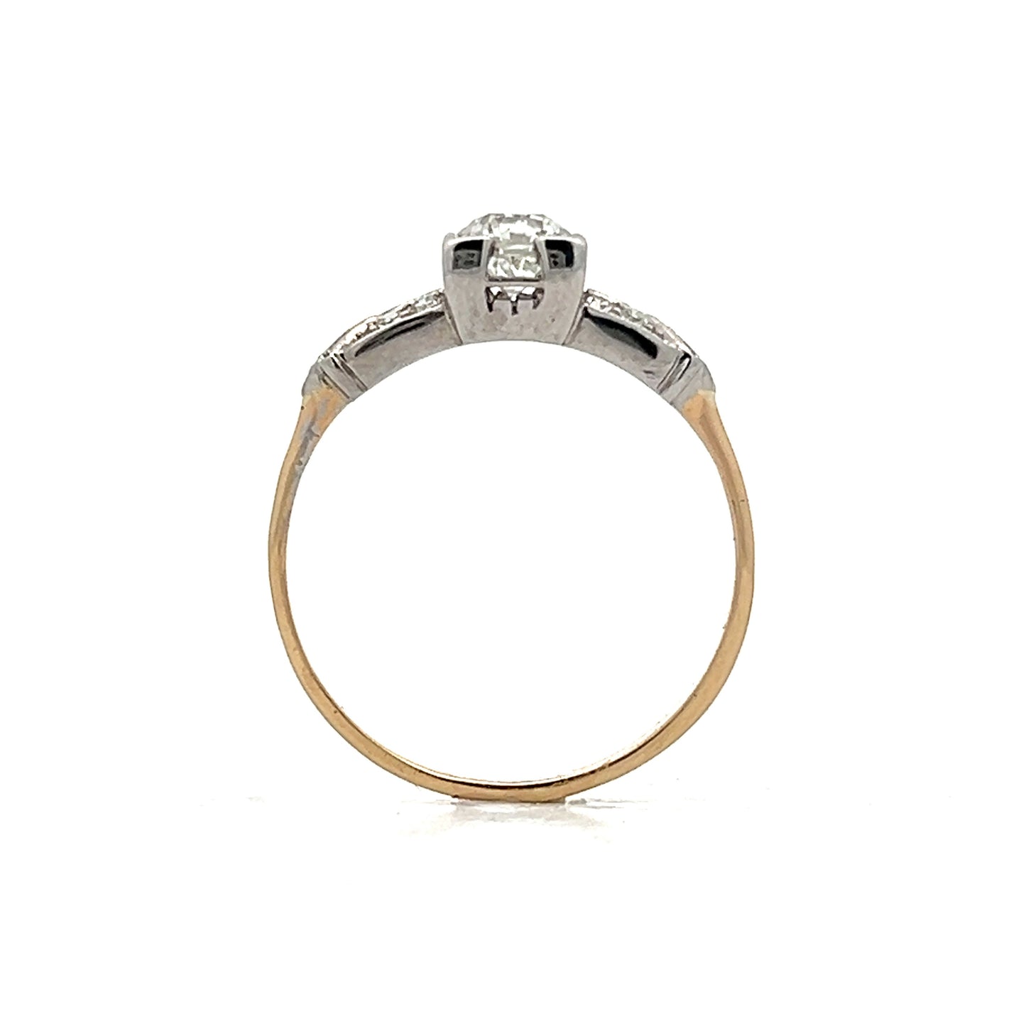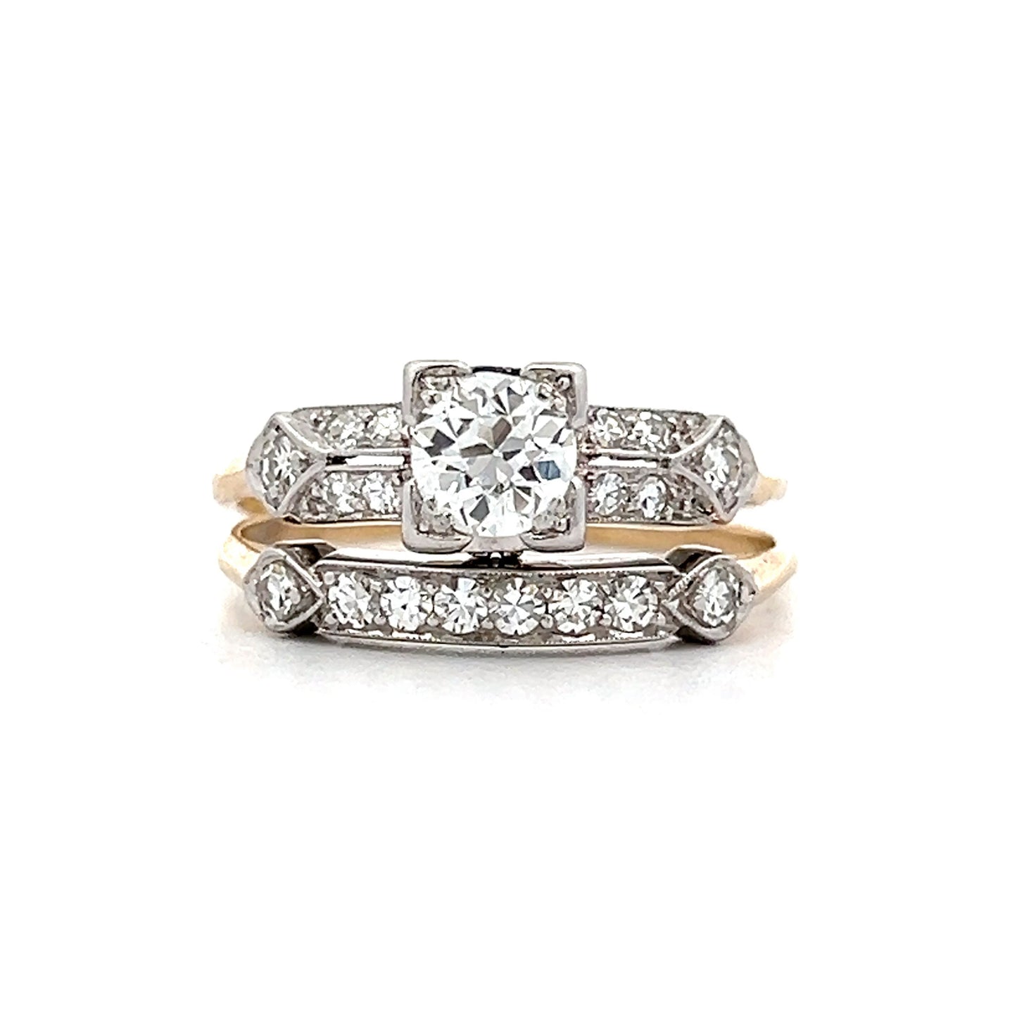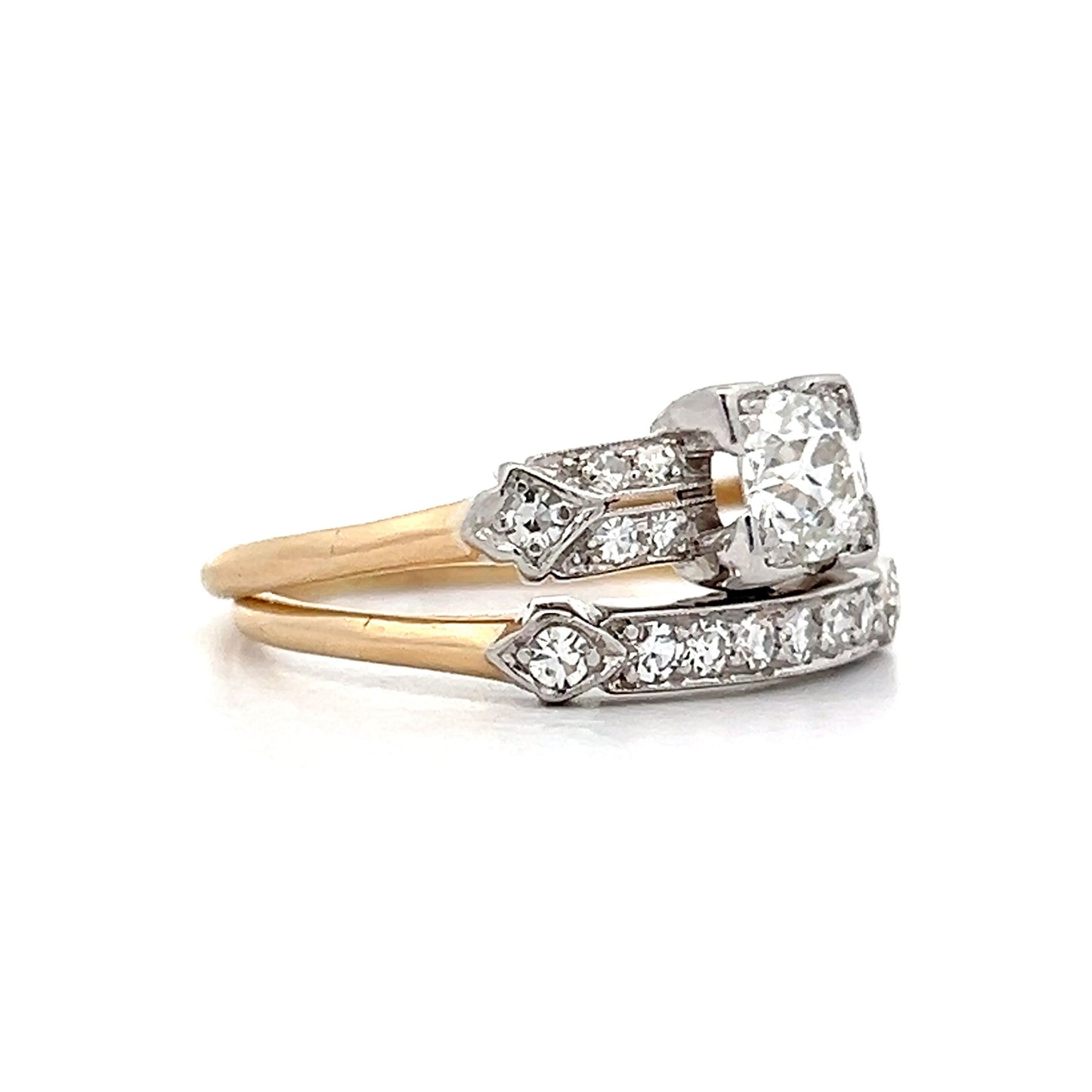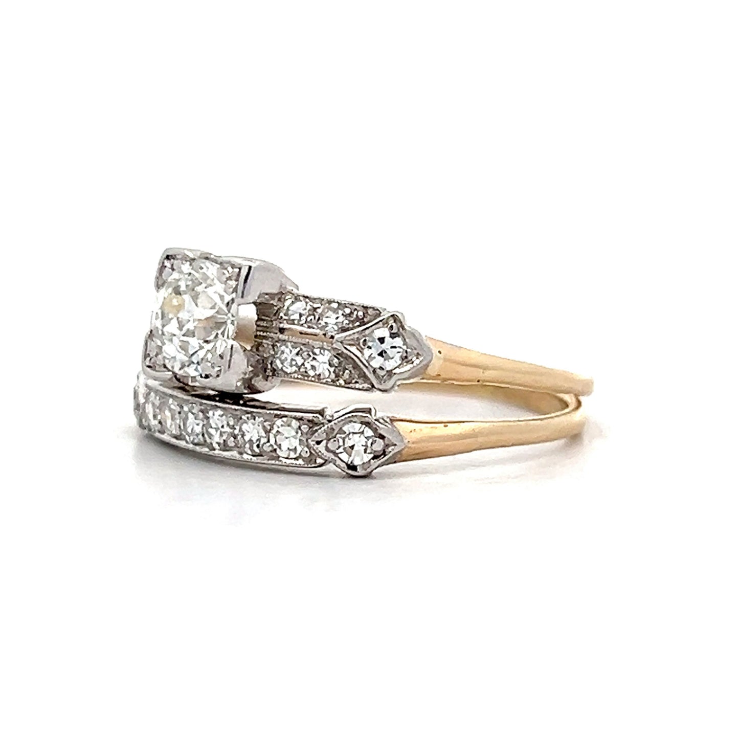 This vintage Retro engagement ring features a .43 carat old European cut diamond with H color and VS2 clarity. The diamond is set in a fishtail prong setting and is accompanied by eight accent diamonds, each weighing .01 carats with H color and SI1 clarity. The ring combines 14 karat white gold and 14 karat yellow gold bands, and is further detailed with milgrain edging. The matching wedding band complements the engagement ring, making this set a perfect pairing.