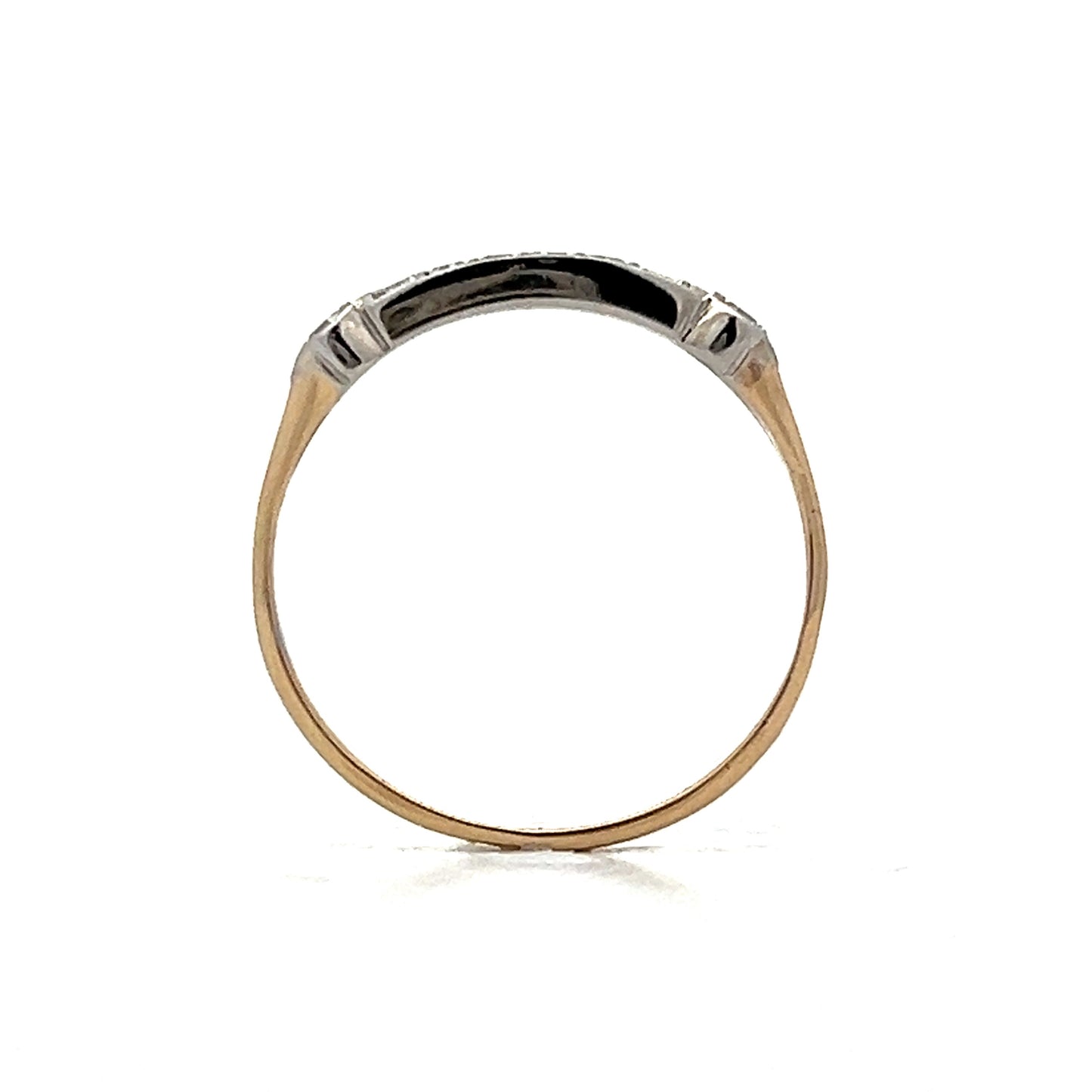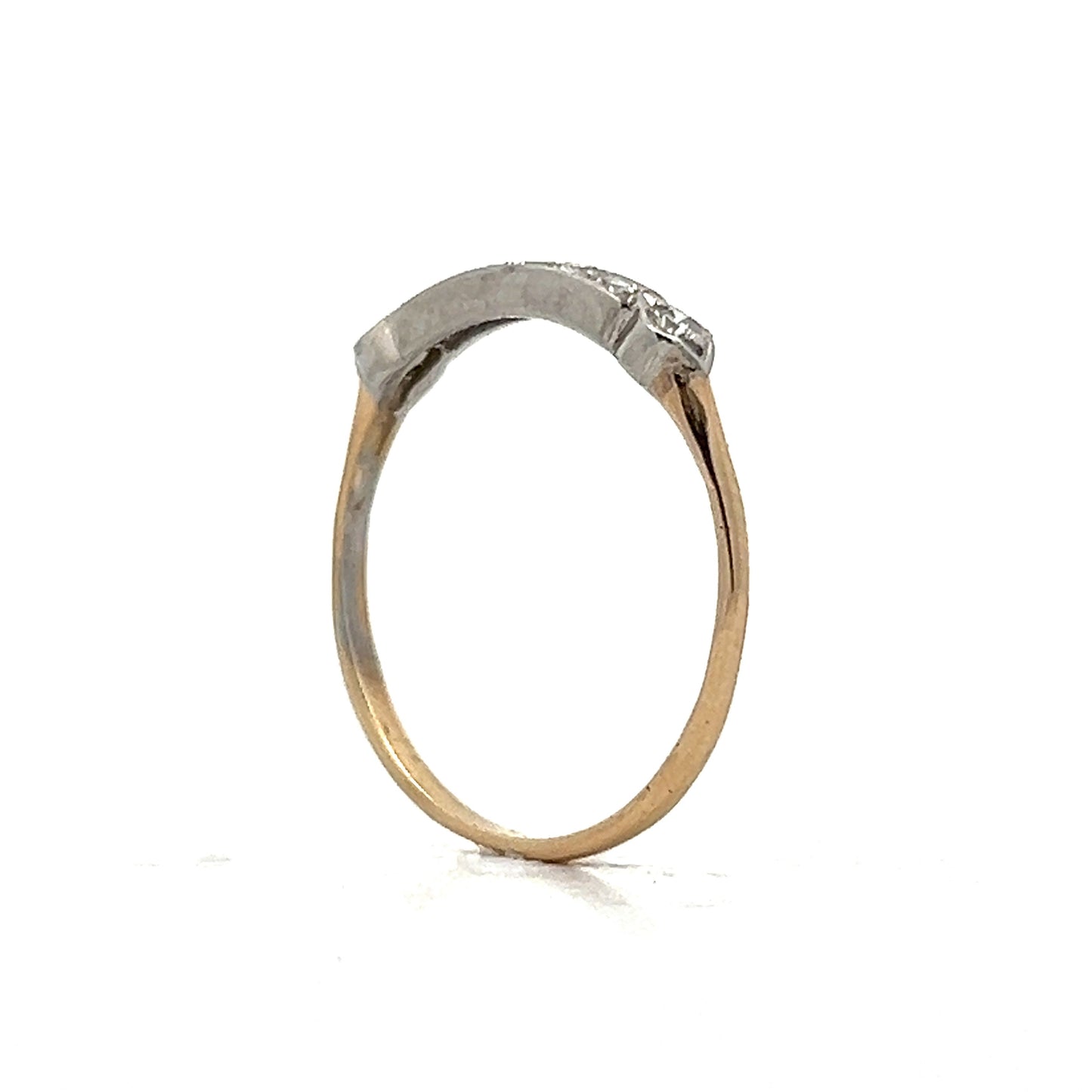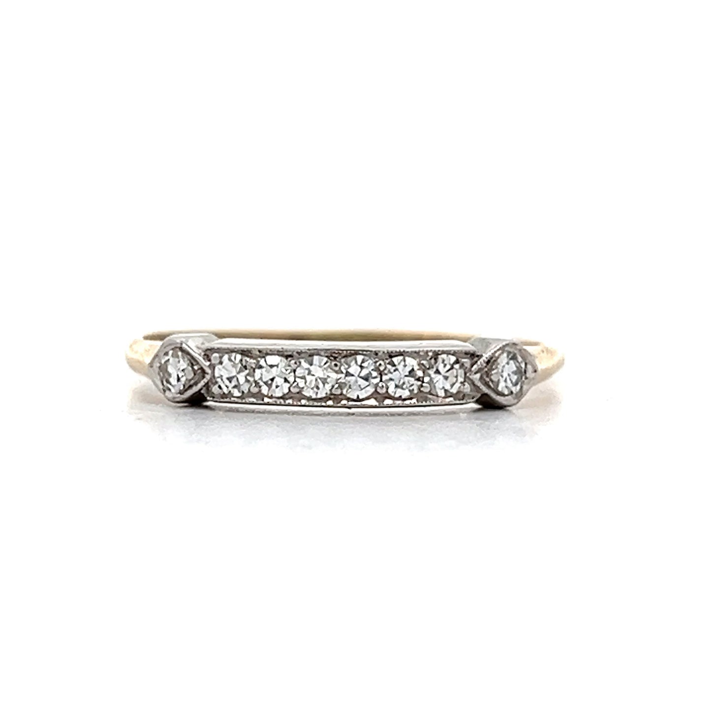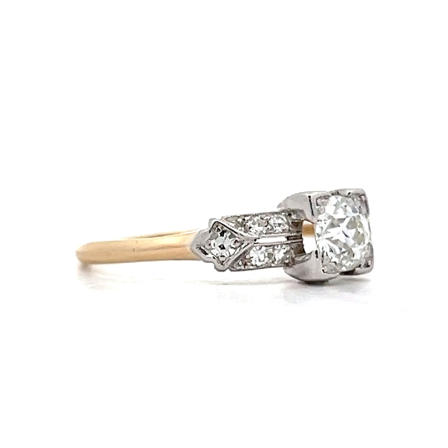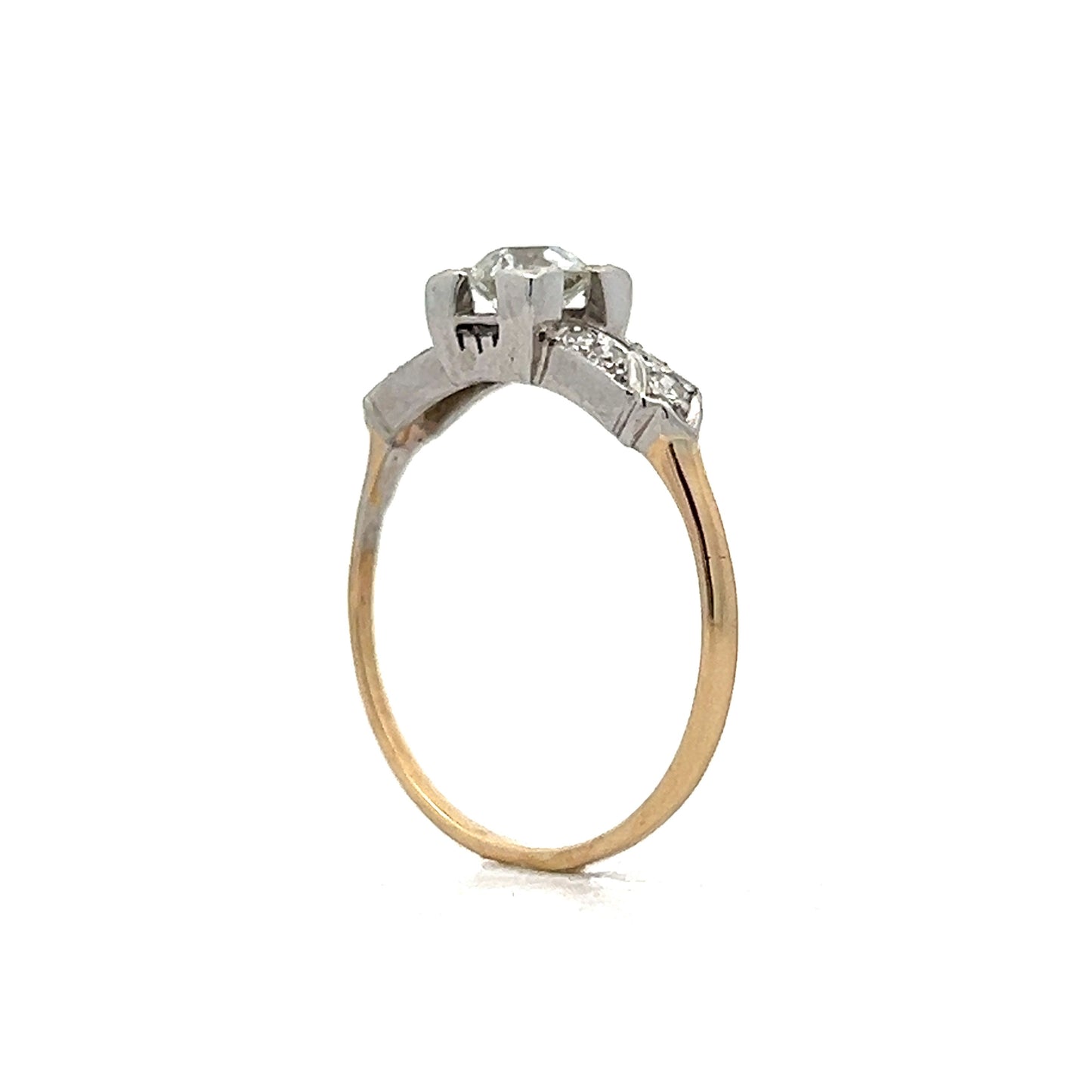 This vintage Retro engagement ring features a .43 carat old European cut diamond with H color and VS2 clarity. The diamond is set in a fishtail prong setting and is accompanied by eight accent diamonds, each weighing .01 carats with H color and SI1 clarity. The ring combines 14 karat white gold and 14 karat yellow gold bands, and is further detailed with milgrain edging. The matching wedding band complements the engagement ring, making this set a perfect pairing.