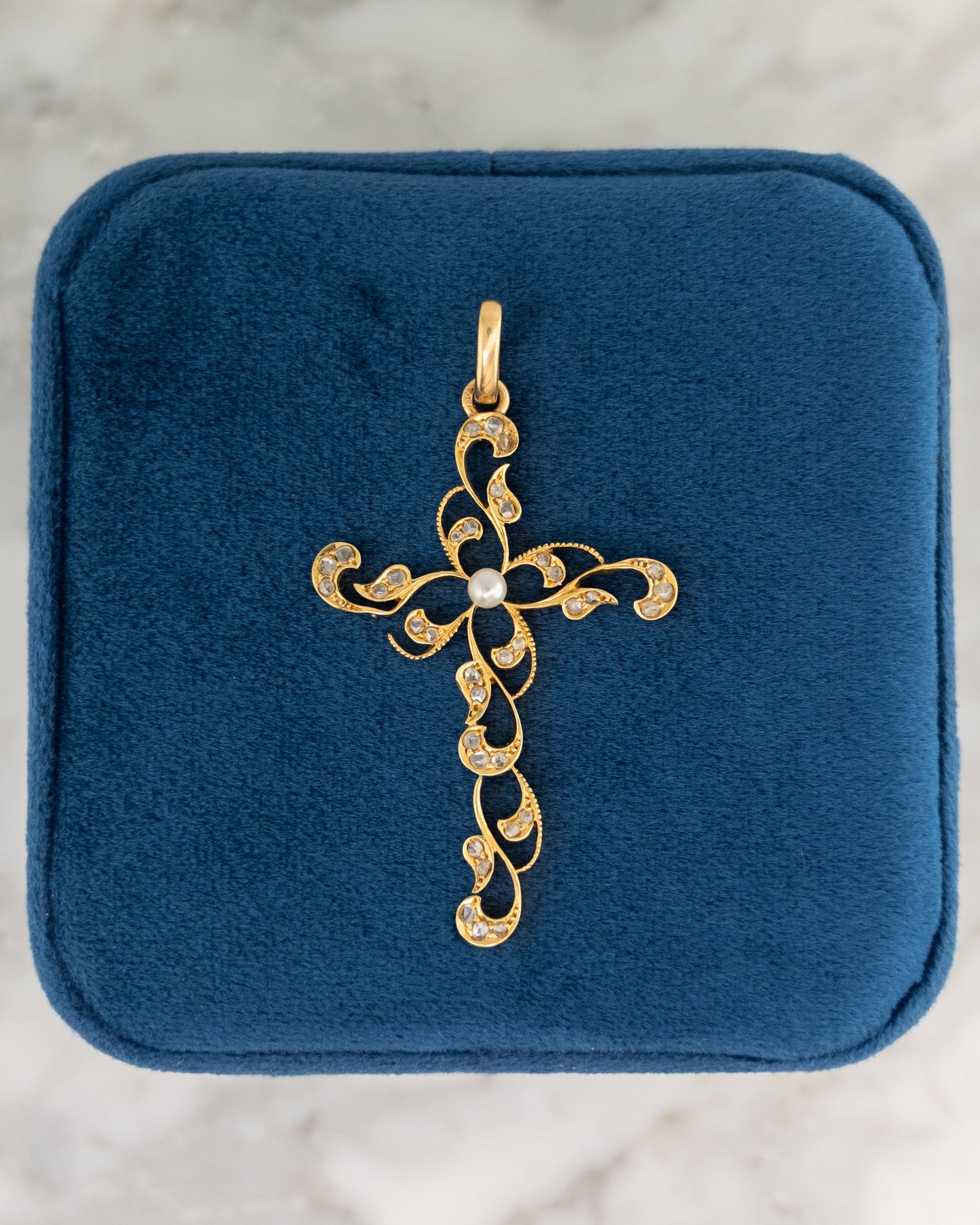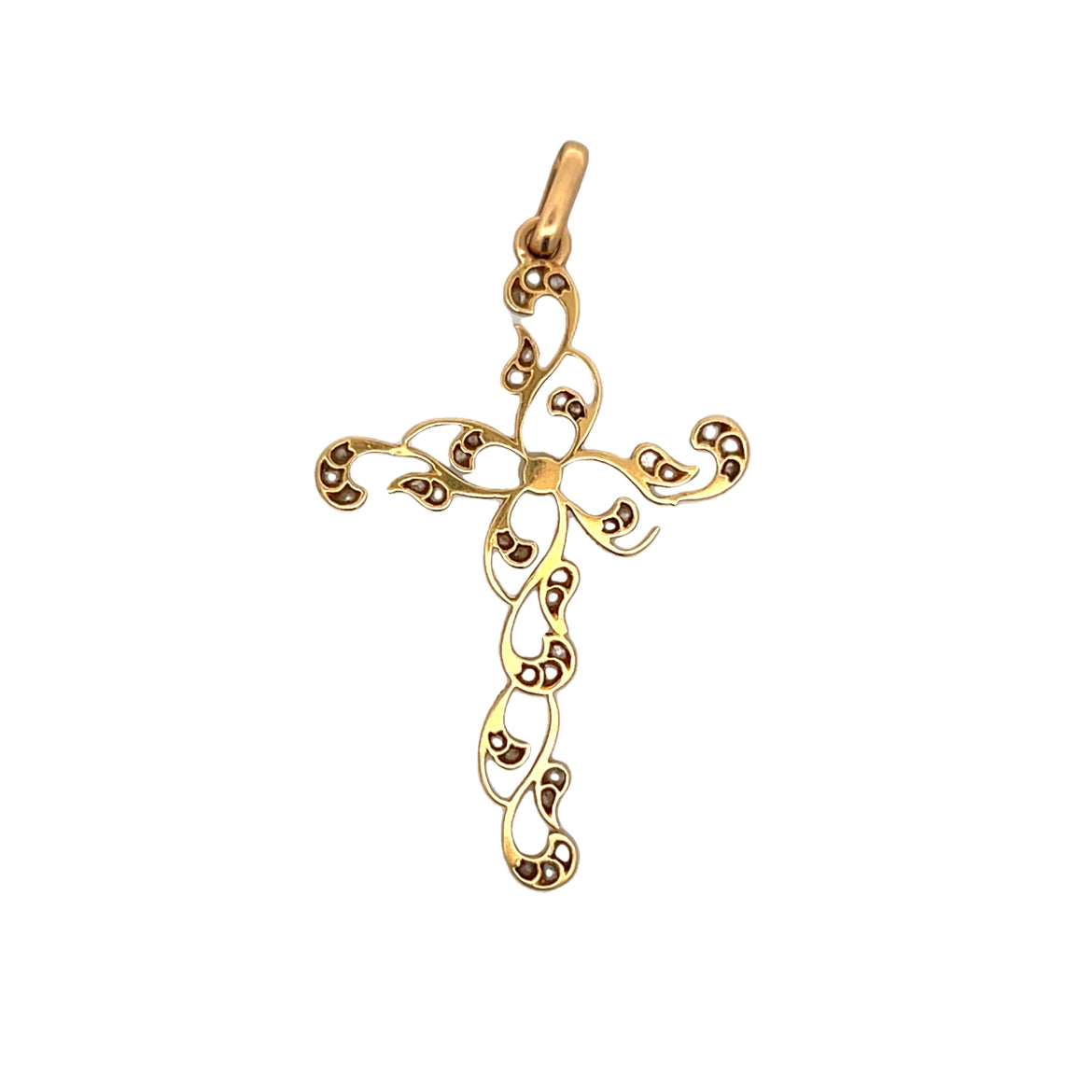 This Victorian cross pendant is made from 18 karat yellow gold with a detailed filigree design. The cross features a pearl in the center that creates a nice contrast against the gold background. The pendant contains 35 natural diamonds, each measuring 1.8 mm and cut in the rose style, with a total diamond weight of .44 carats (SI2 clarity, K color grade). Additional accent pearls measuring 3.65 mm add more visual interest to the piece. The pendant combines gold, diamonds, and pearls in a style that reflects designs from the Victorian period.